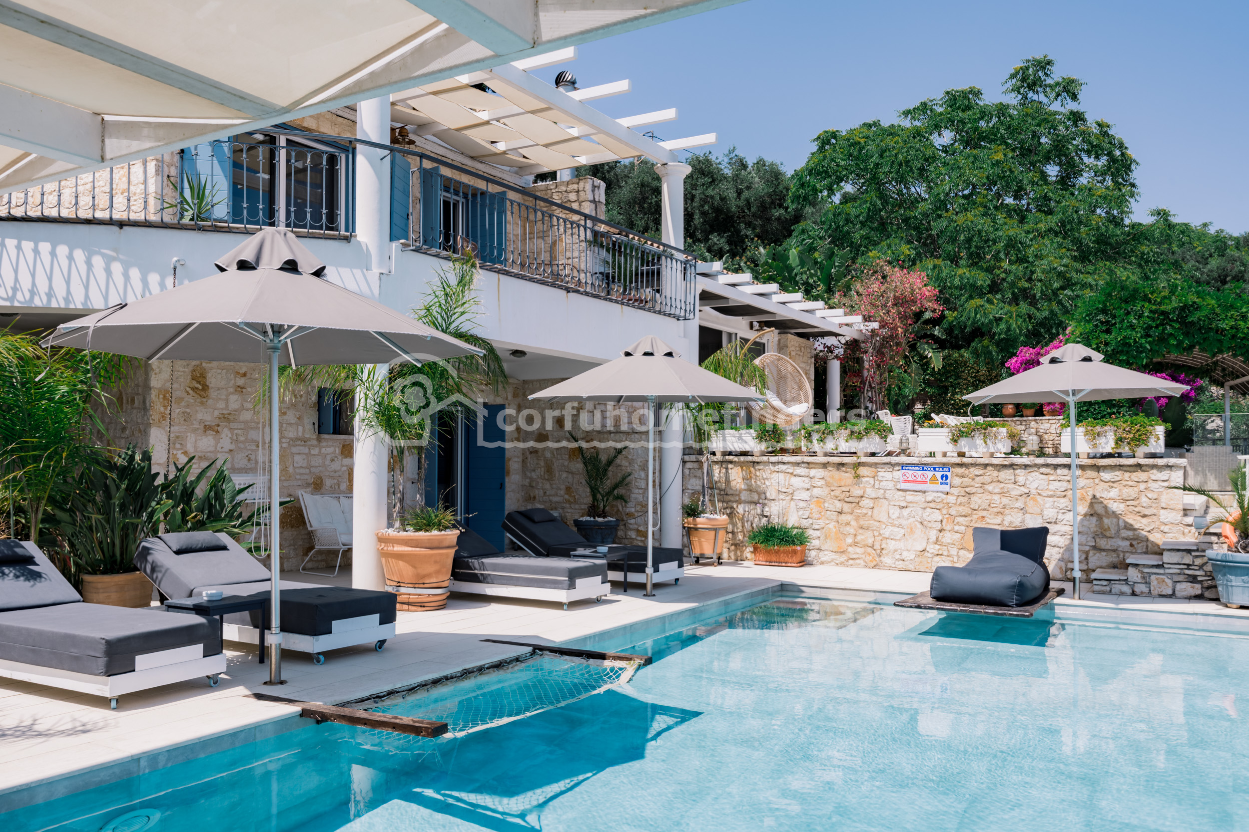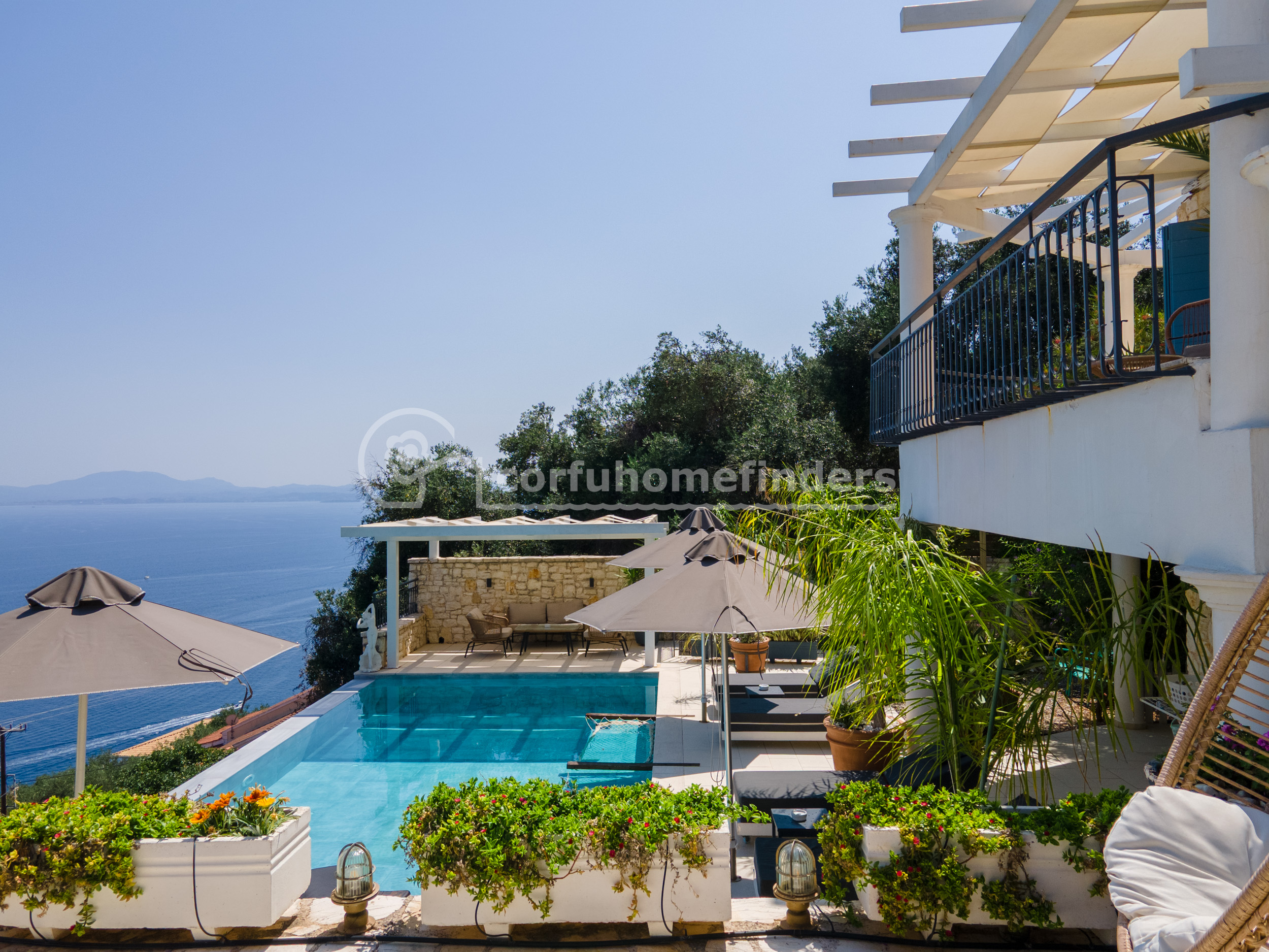 Outside, the garden and pool areas are designed and engineered to allow maximum privacy. The horizon pool is lined with beige mosaic tiles and the grounds are planted and landscaped to take full advantage of the wonderful sea views. An impressive barbecue area is located near the kitchen, and next to the pool there is a wooden, covered pergola to provide shade.