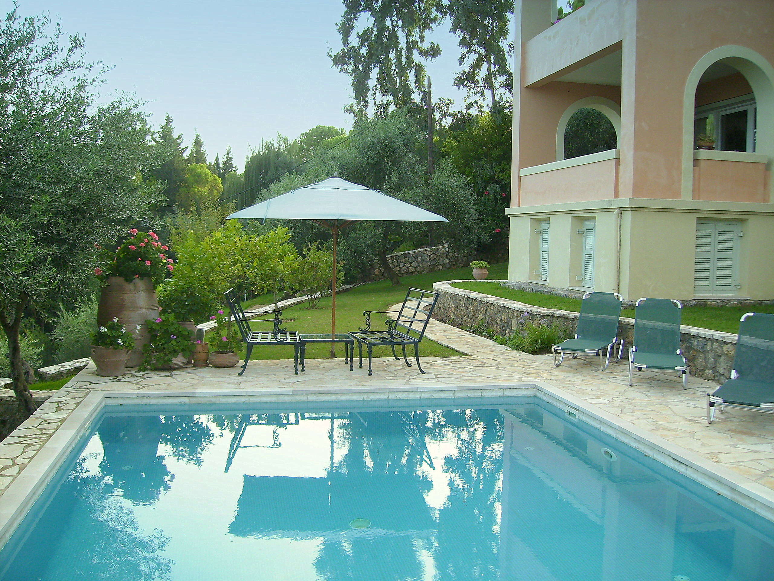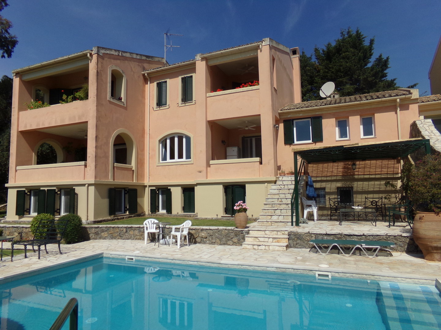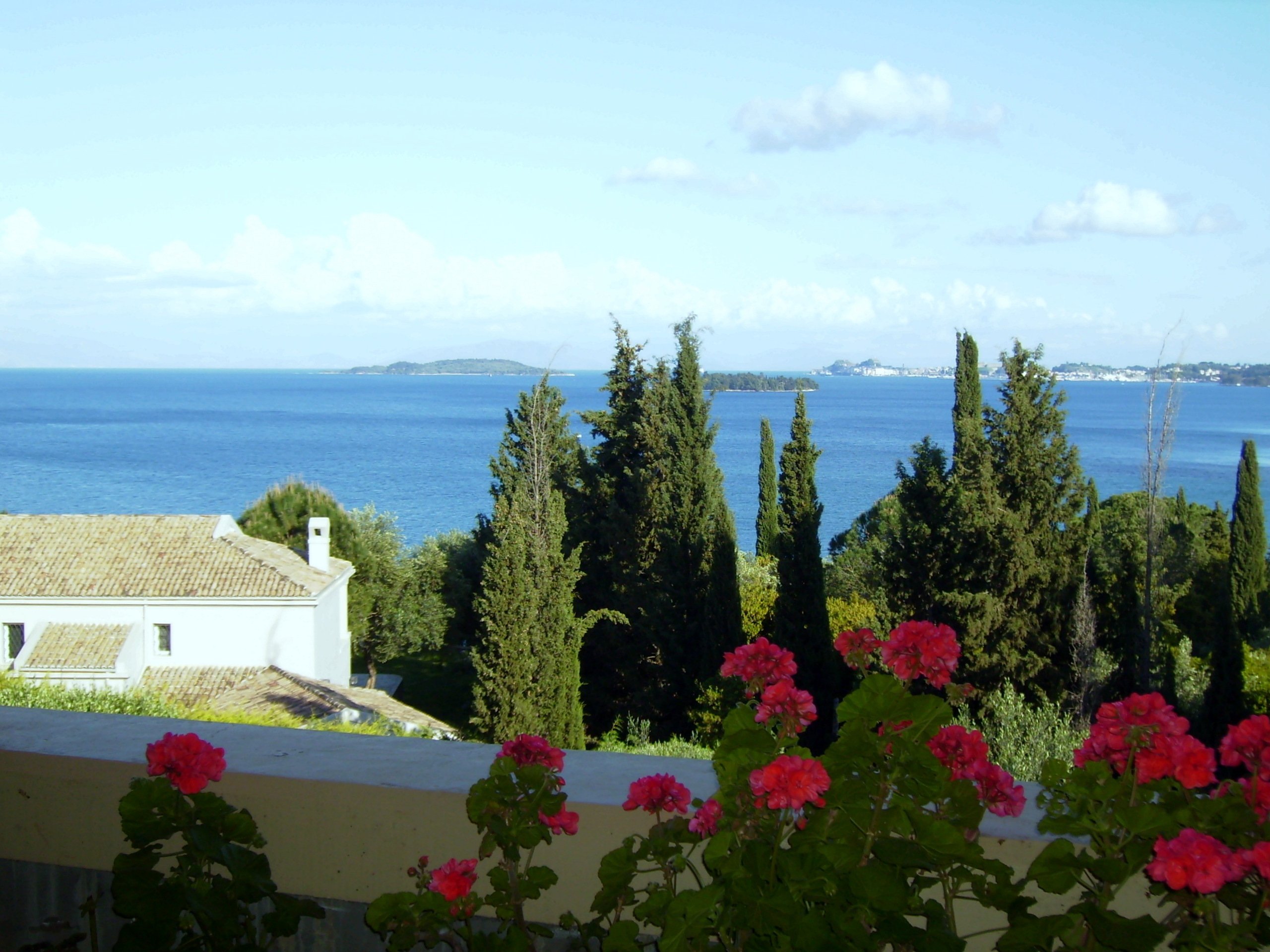 This superior villa is situated 10 kilometres north of Corfu Town in the elegant suburb of Kommeno. It faces South East and overlooks the sea towards the marina at Gouvia, the islands of Lazaretto and Vidos, Corfu town and the mountains of the Greek mainland.