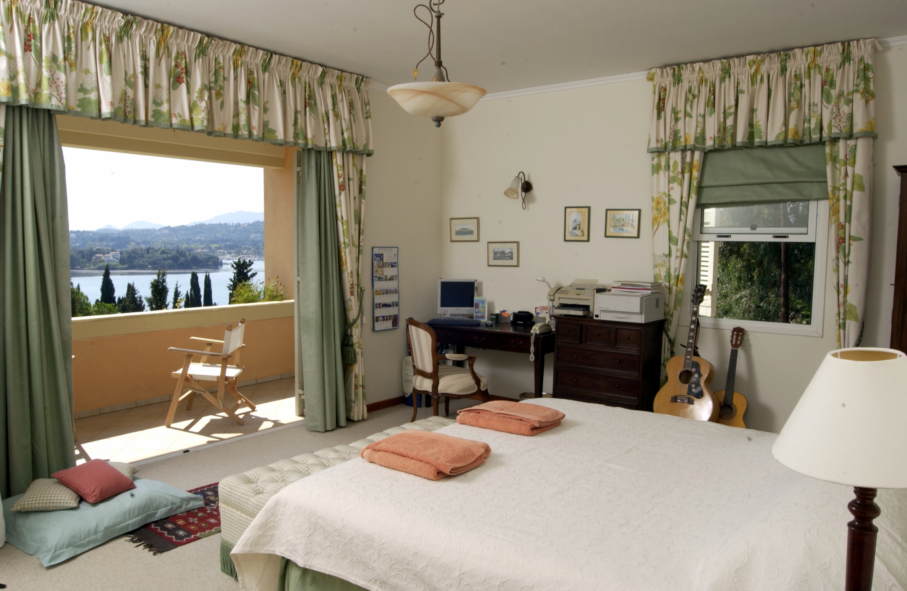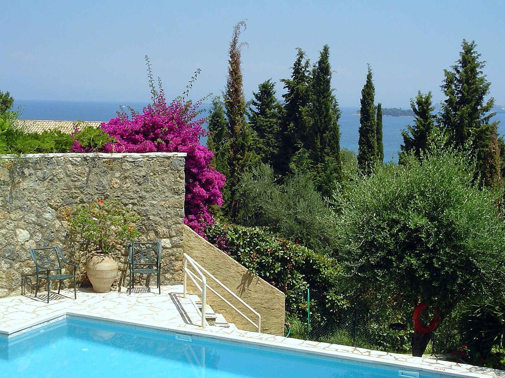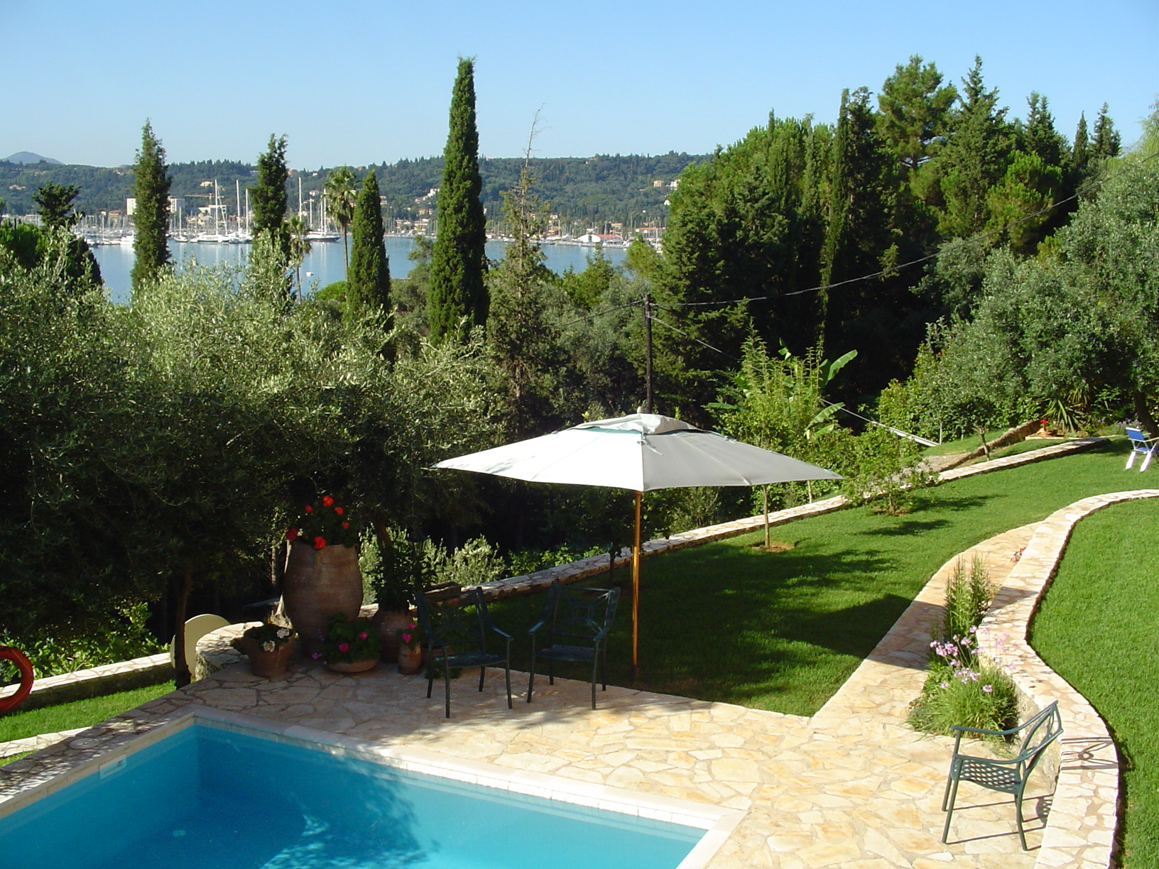 This superior villa is situated 10 kilometres north of Corfu Town in the elegant suburb of Kommeno. It faces South East and overlooks the sea towards the marina at Gouvia, the islands of Lazaretto and Vidos, Corfu town and the mountains of the Greek mainland.