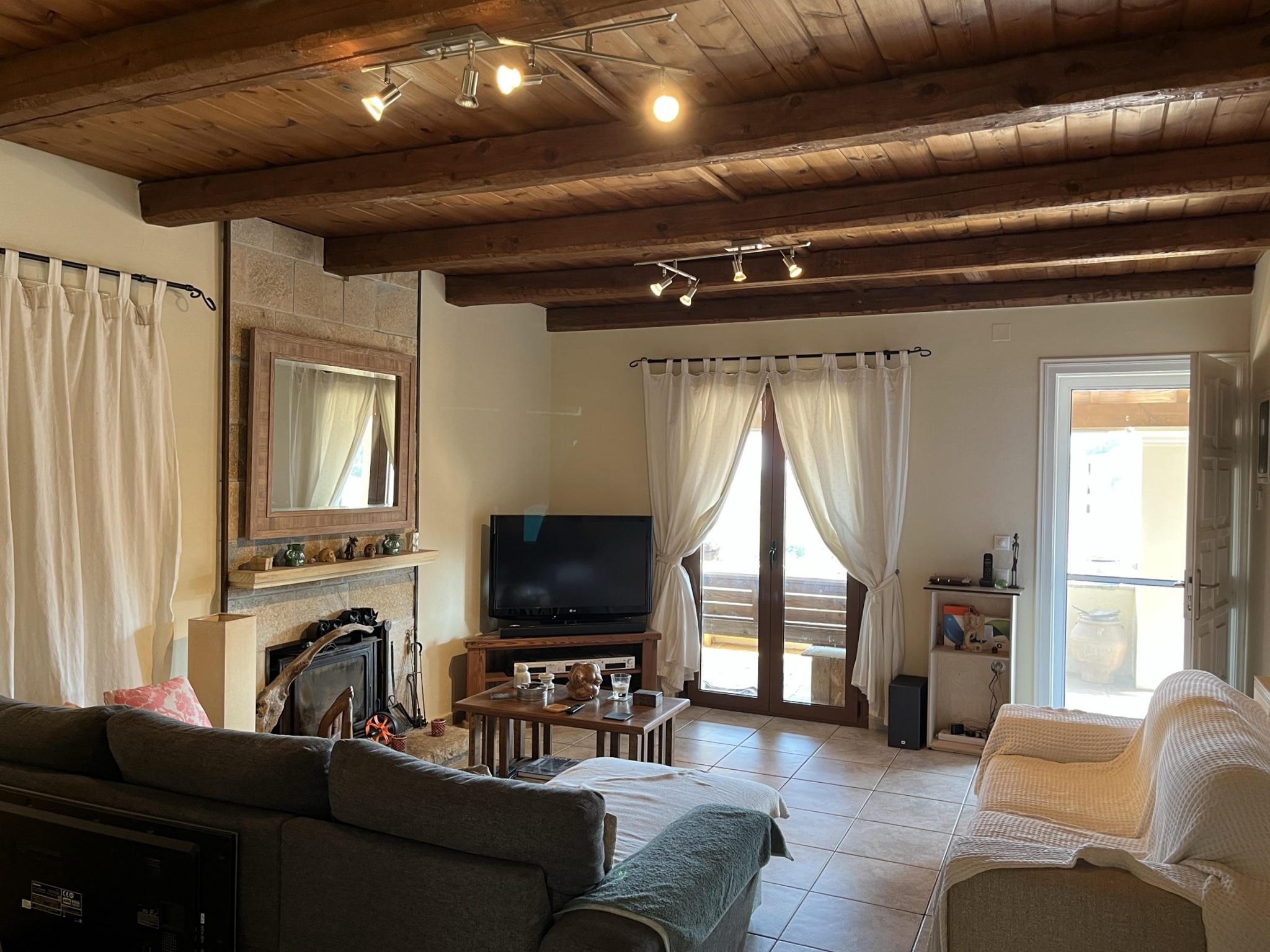Stone steps lead from the road up to the front covered terrace and the front door leads straight into the large airy sitting room. Although the room is modern, traditional features such as wooden beams and a fireplace add to the character of the room.