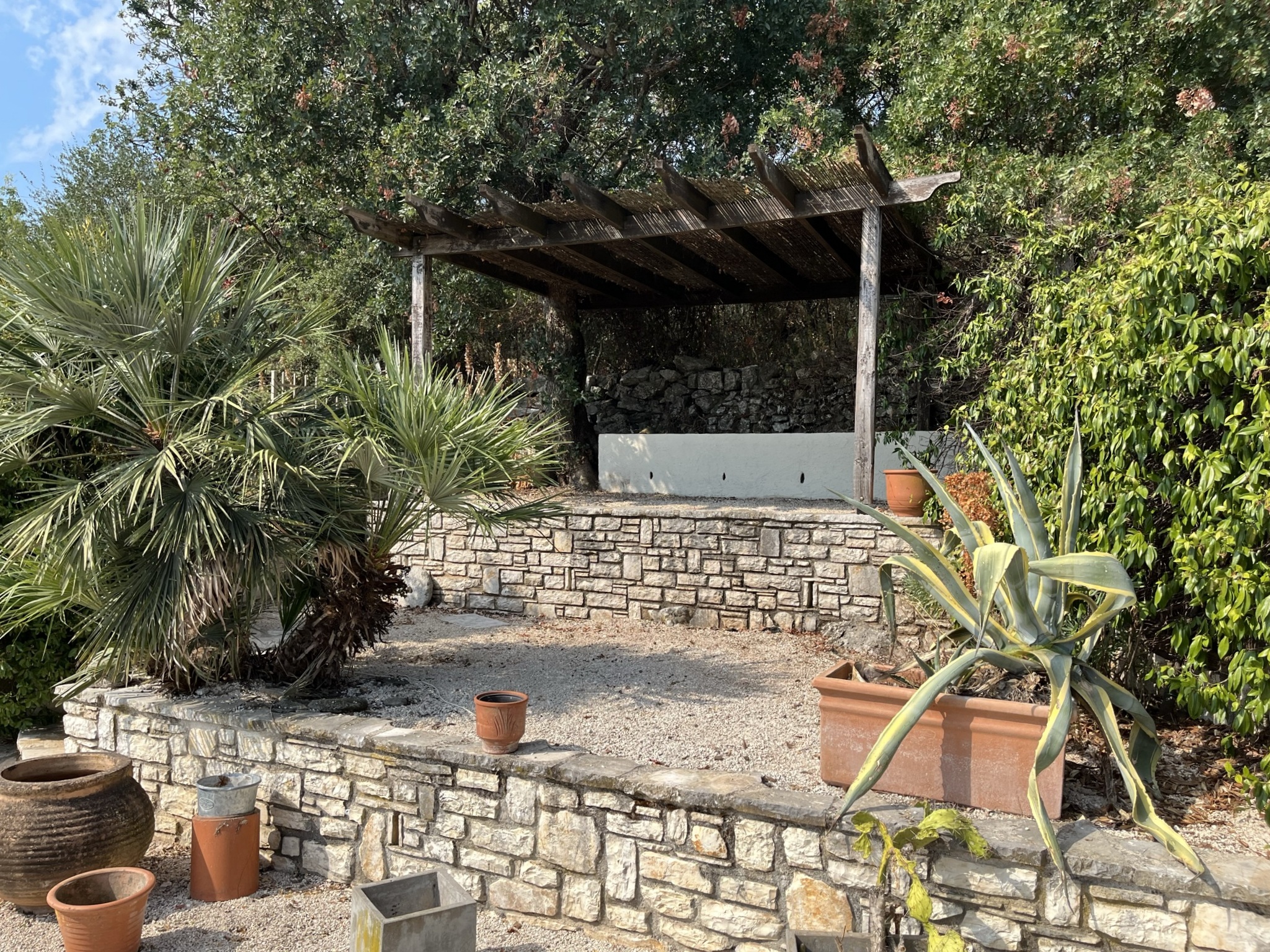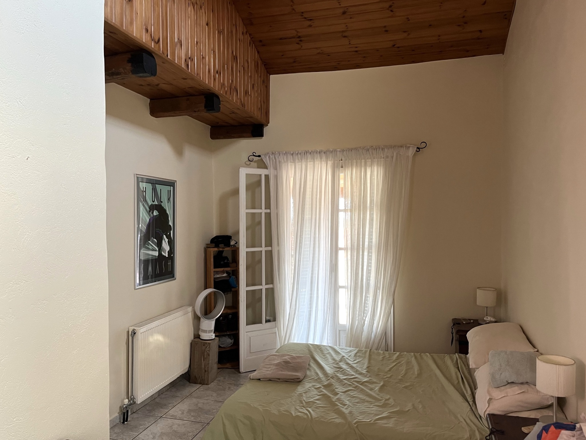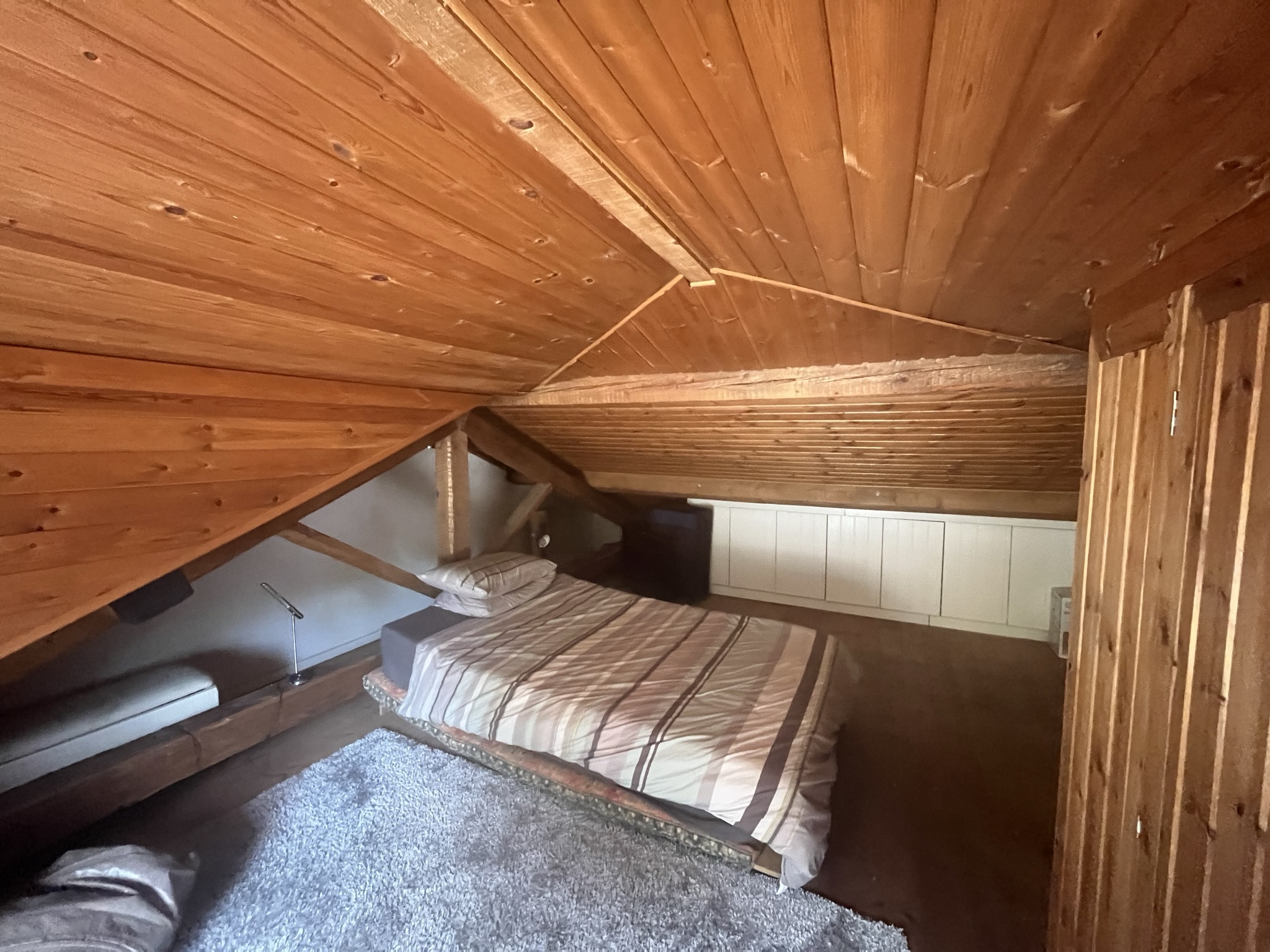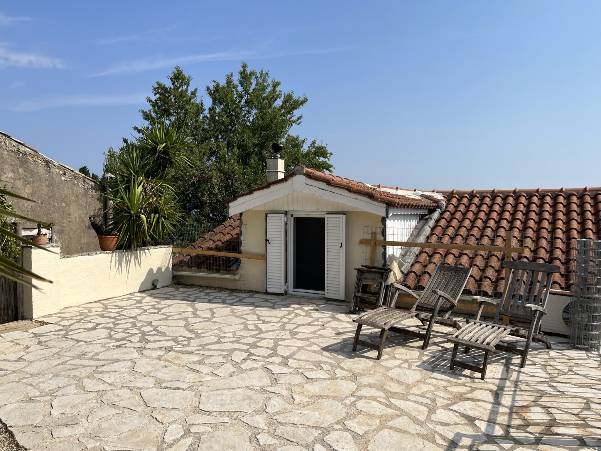 Stairs (steep) lead from the sitting room up to a further bedroom, again with exposed beams. This room a window leading out to the terrace at the back of the house. The garden here is mainly paved for ease of maintenance, and fully fenced.