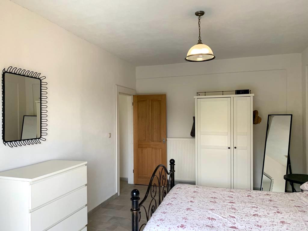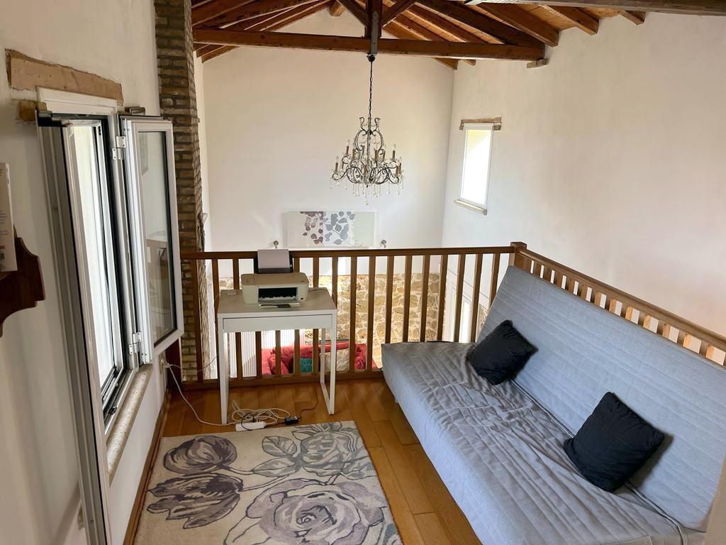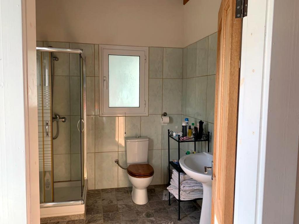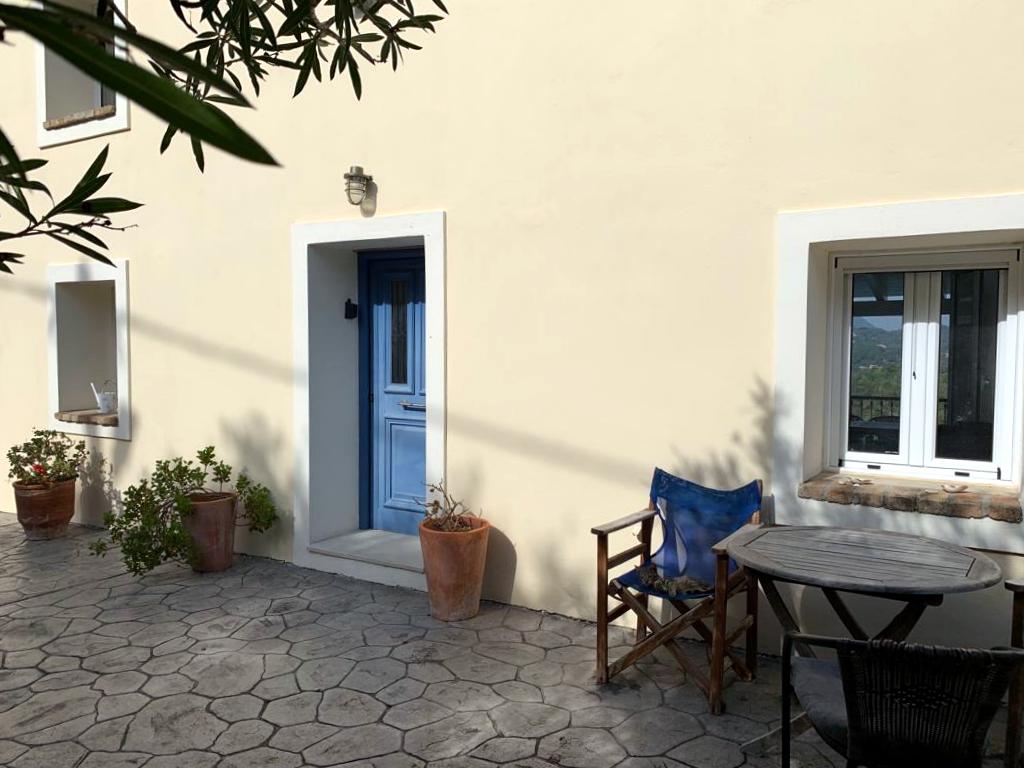 The front door opens straight into the double height sitting room, this was the old part of the house and has an exposed stone wall and beautiful fireplace built of old bricks. Large patio windows open onto the covered terrace, an ideal spot for outside dining and from which to enjoy the view across Corfu town to the mountains beyond.