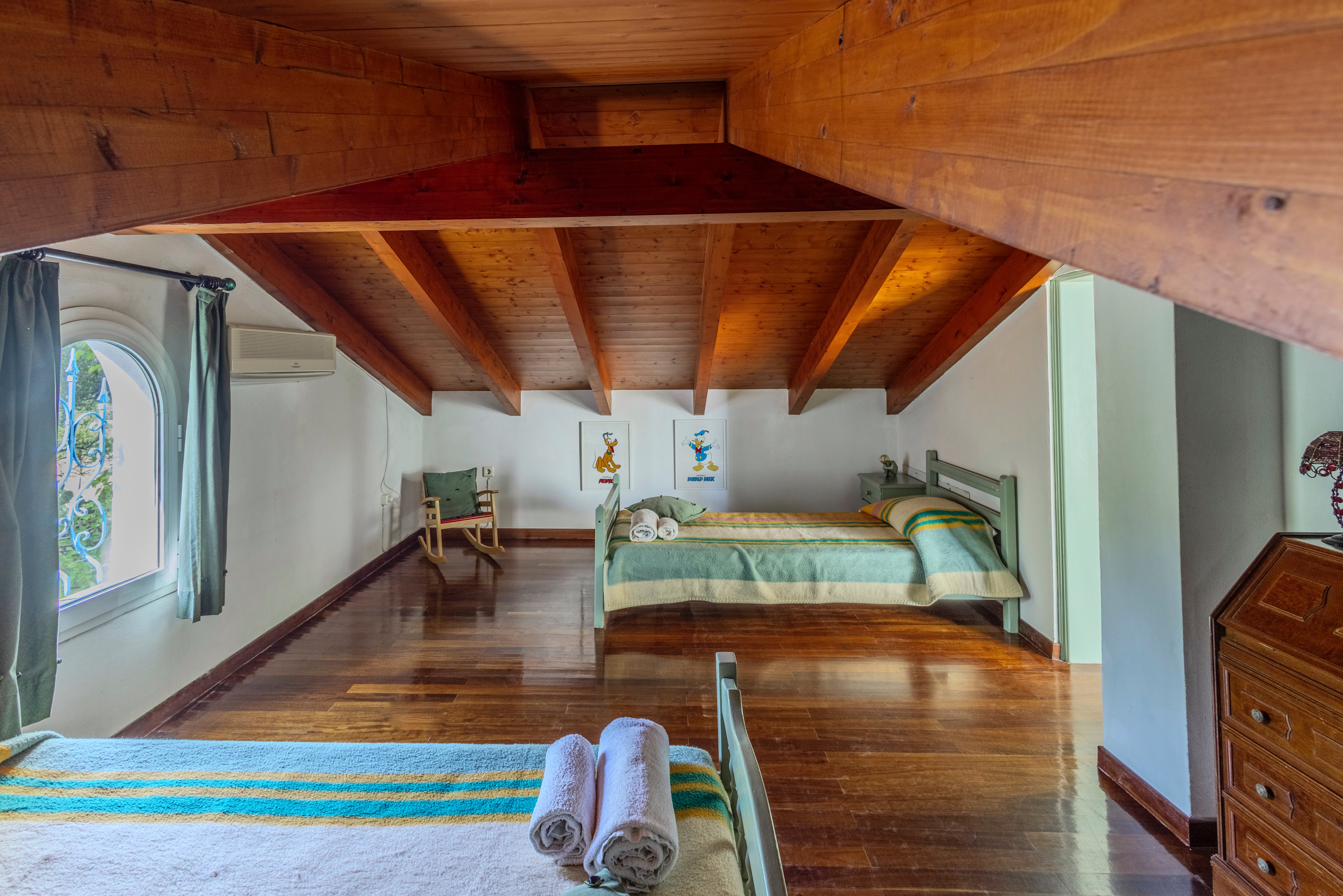 As you enter the house there is a spacious sitting with a dining area and fireplace. A fully equipped kitchen, plus two bedrooms and two bathrooms. On the first floor can be found a second sitting area with a sofa bed, the master bedroom with an ensuite bathroom and one more bedroom with an entrance through the master bedroom, ideal for children to have their parents near or to be used as a walk-in wardrobe or study. The house has air-conditioning in all bedrooms. The wooden ceilings and wooden floors on the first level create a stylish, cosy and warm environment.
