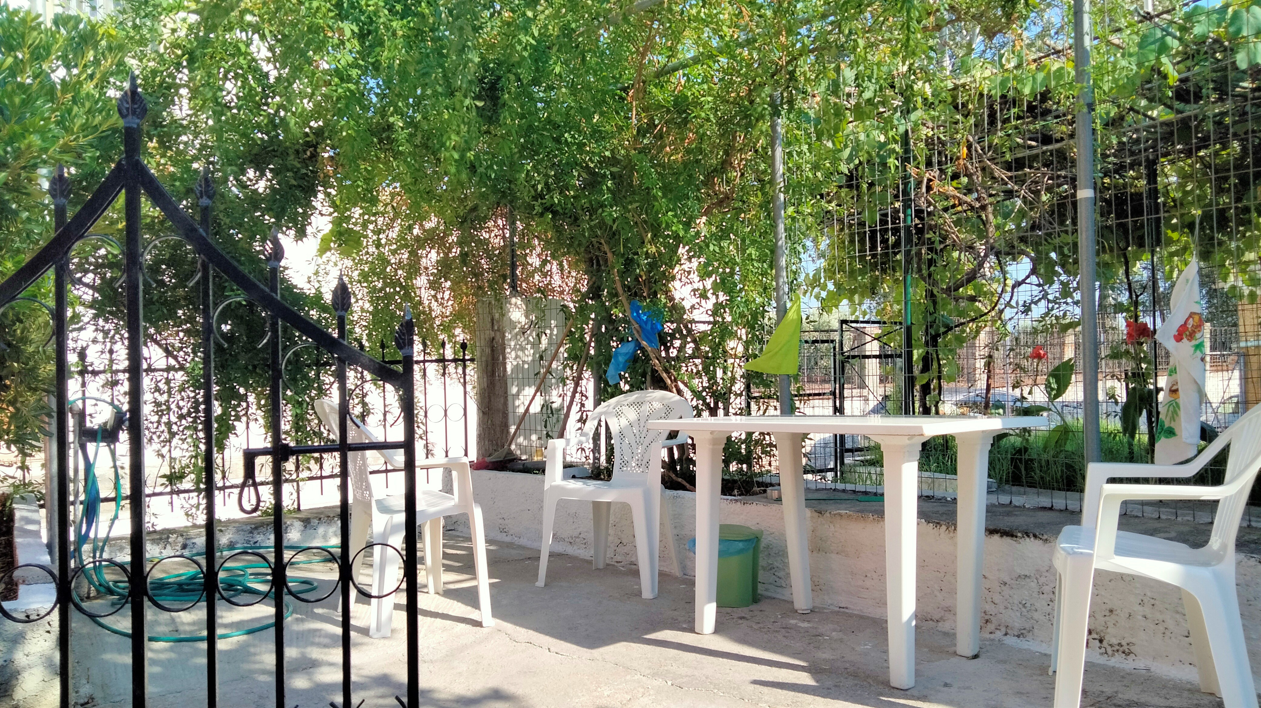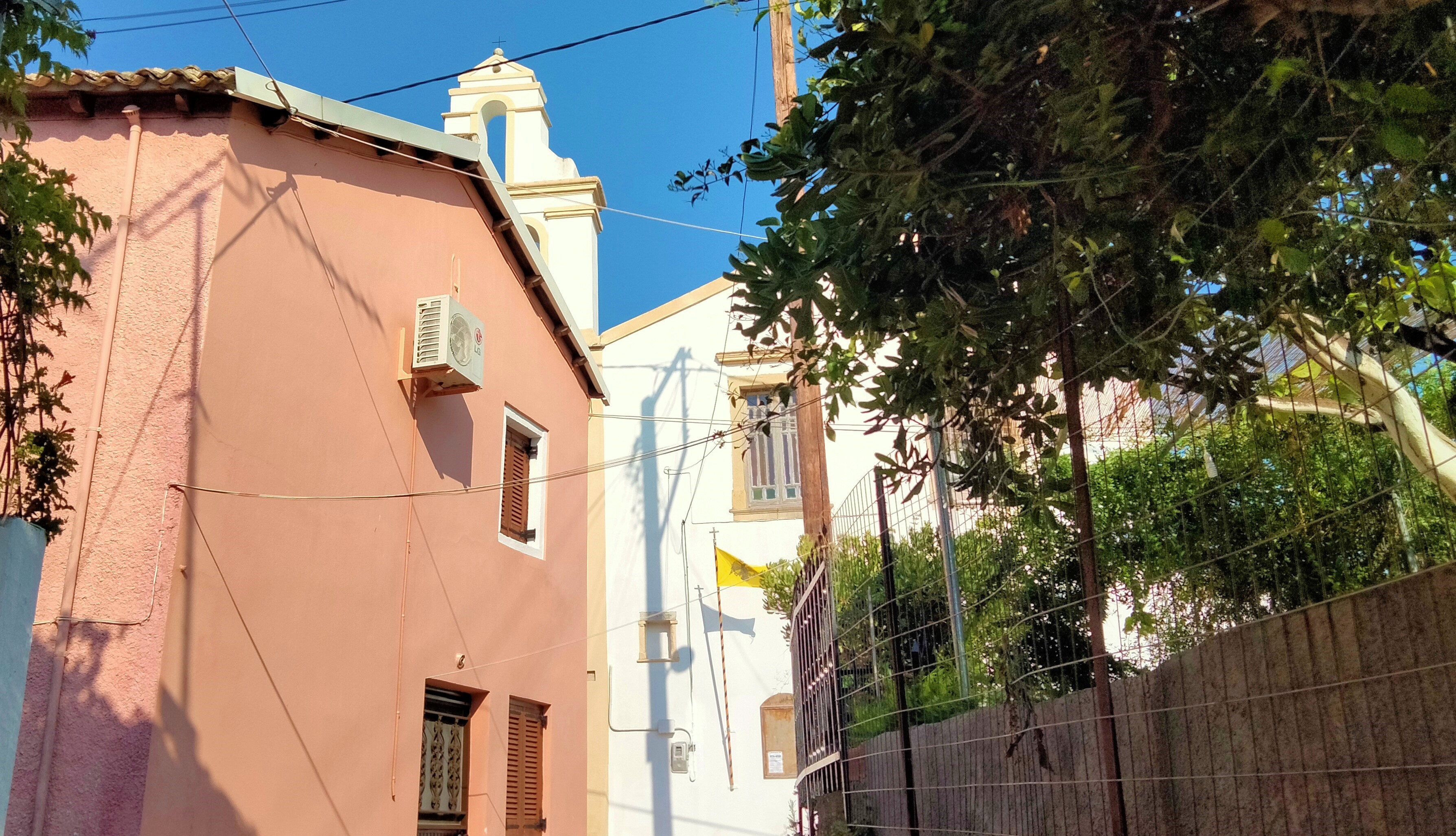 The kitchen exits towards a small alley. Right opposite some steps lead to a quite charming garden area with several fruit trees and a full view on the Panayia church.