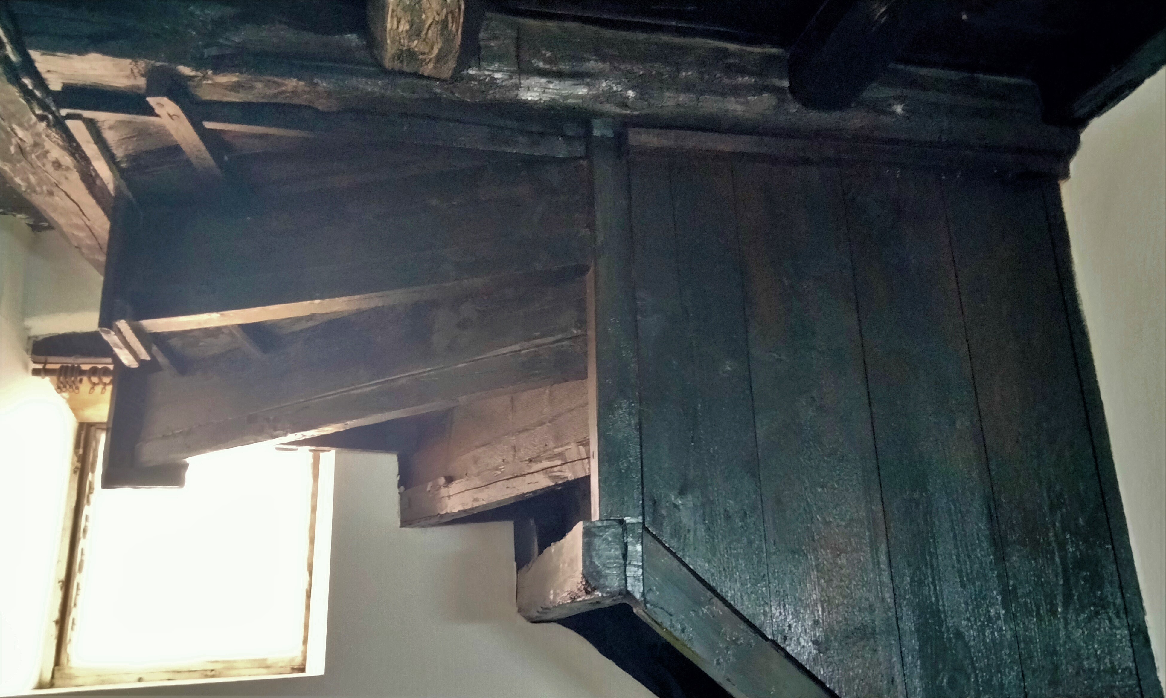 Next to the hallway a small bedroom is positioned half under the stairs, showing their impressive wooden structure.