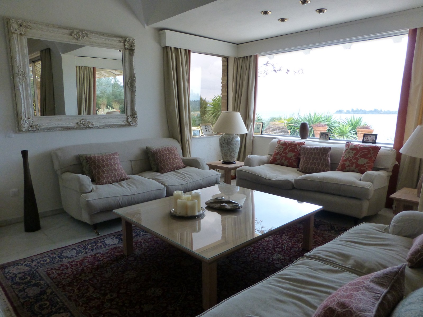 This is a beautiful seafront property, recently completely refurbished and in one of Corfu's prime locations. The main villa is a long low building, with a double height living room, and a mezzanine second sitting area. The living room has sliding doors running the full length of the terrace making the most of the stunning sea view. At one end is a raised dining area for 12 and also on this level is a further bedroom/office.