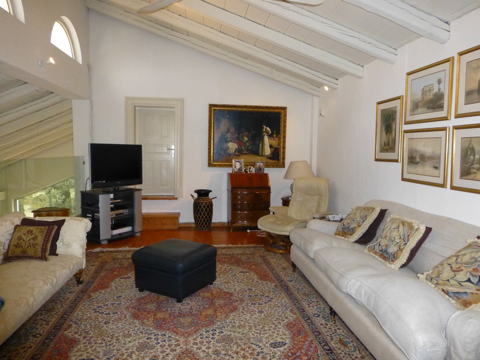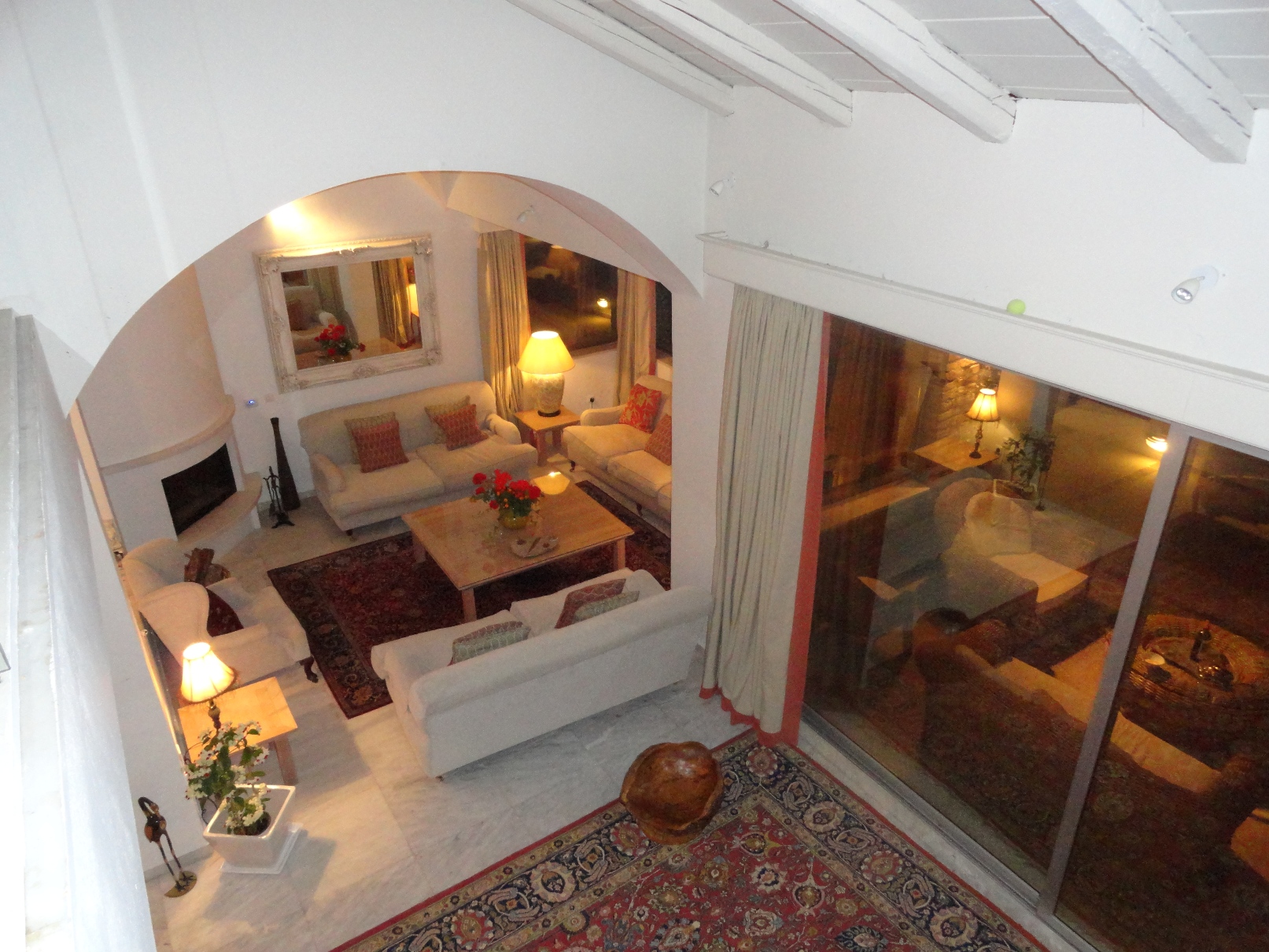 There is a separate large family kitchen, en-suite master bedroom with French doors onto a sea facing terrace and three further en-suite bedrooms. There is also an interesting additional guest suite, accessed via spiral staircase from the terrace, comprising a double bedroom and attic shower room.