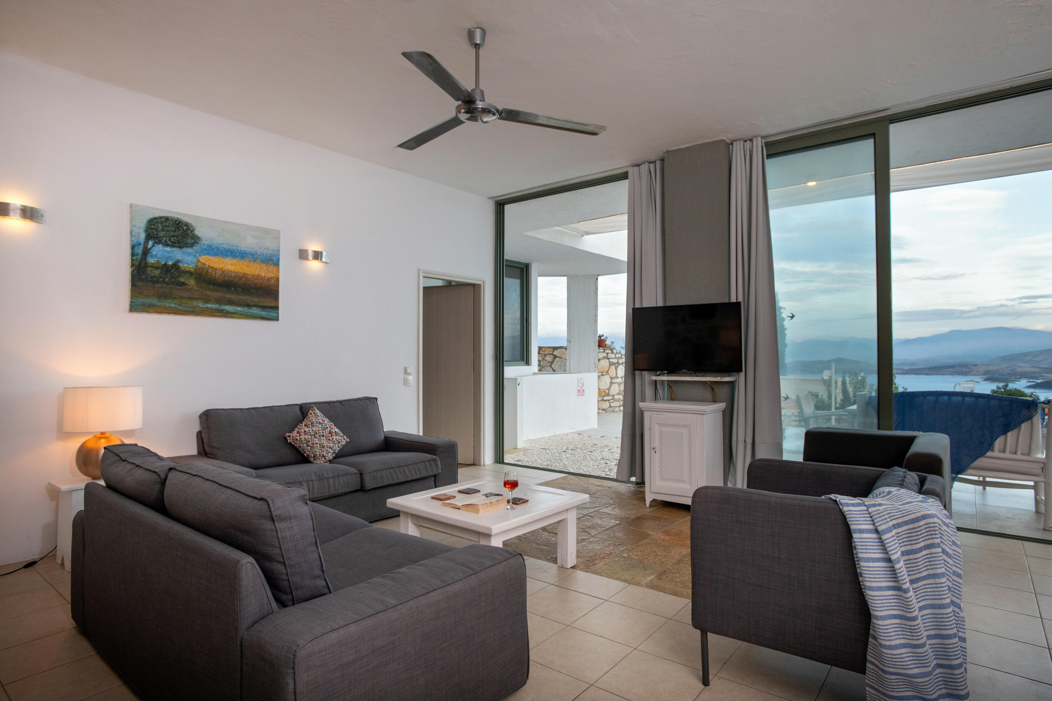 Entering Armonia one's eye is immediately drawn to the huge wall of glass looking out over the pool and the view beyond. This is open-plan living at its best - a modern shiny red kitchen is situated to one side, against a rustic stone wall and, though simply furnished, the rest of the living area reflects the style of its artist owner.