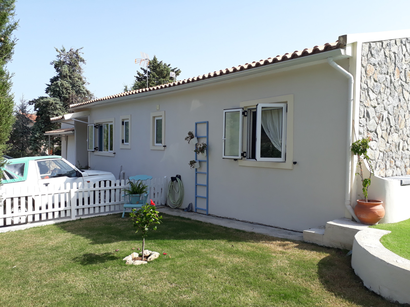 In a quiet area near to the village of Kato Korakiana, this pretty house is a perfect year round house. In the summer months, the pool at the front of the house is perfectly placed to enjoy all day sunshine, and there is plenty of space to sit in sun or shade.