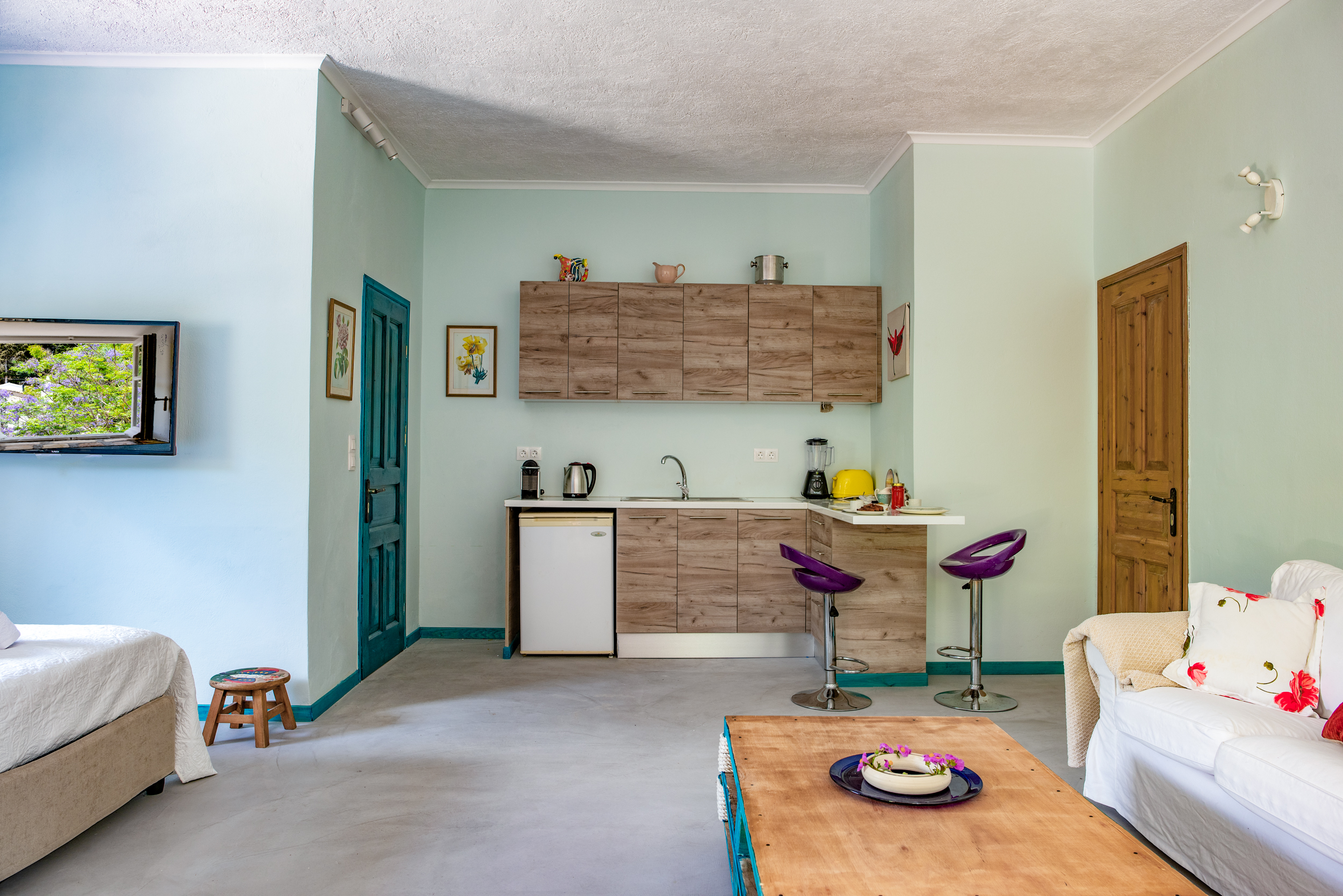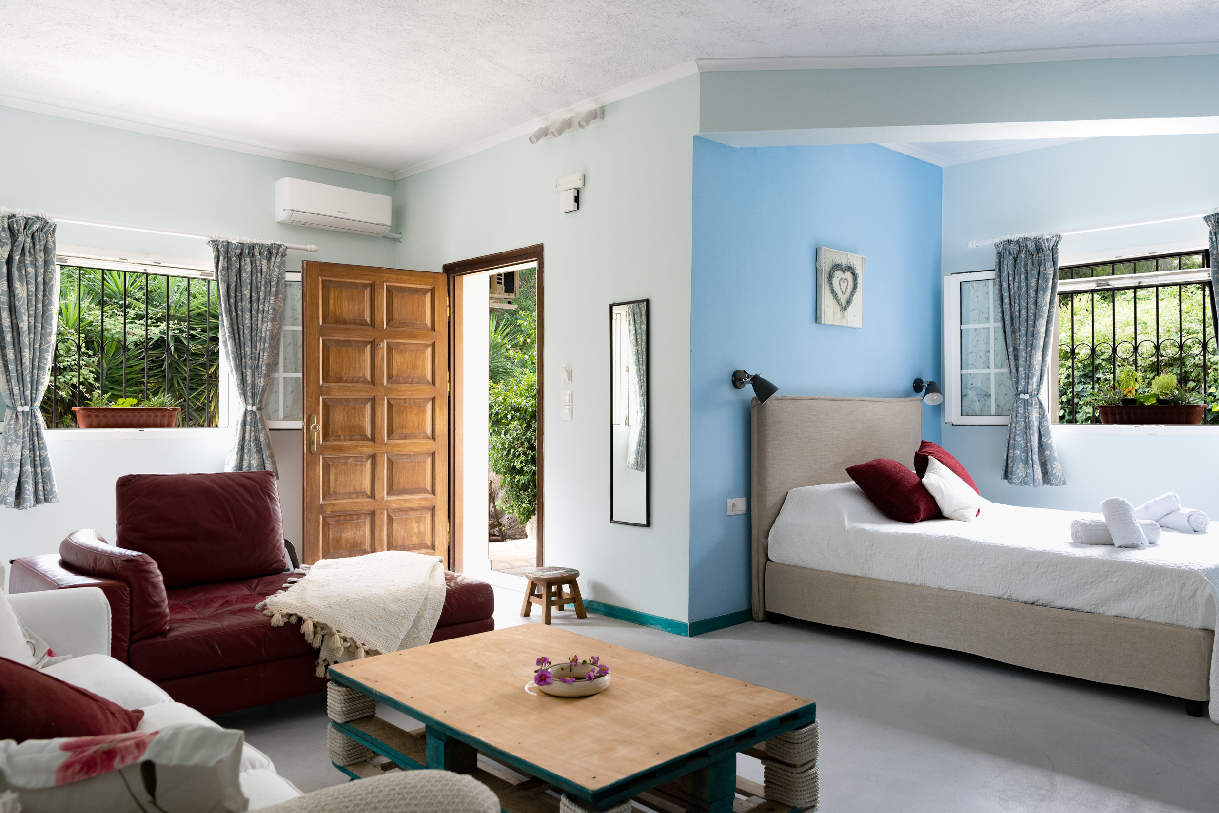 A second front door to the side of the house leads directly into a spacious self contained studio apartment, with a little kitchen, and a modern shower room. This links to the main house if required or can be kept entirely separate.