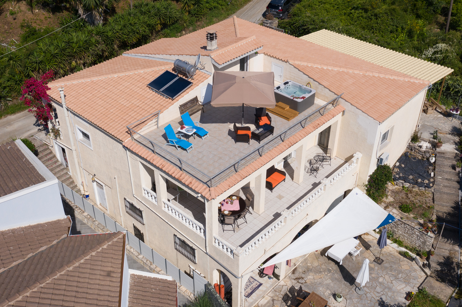 The whole of the top of the house is flat and used as a roof terrace. This is in full sun all day long, so an ideal spot for sunbathing and relaxing in the jacuzzi.