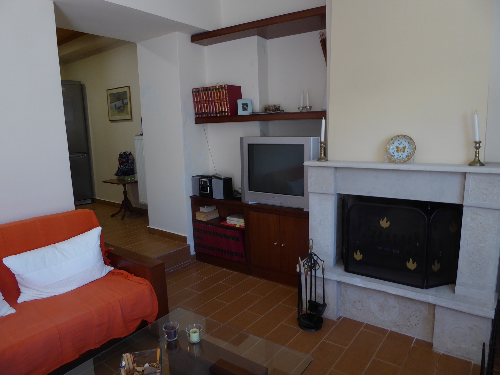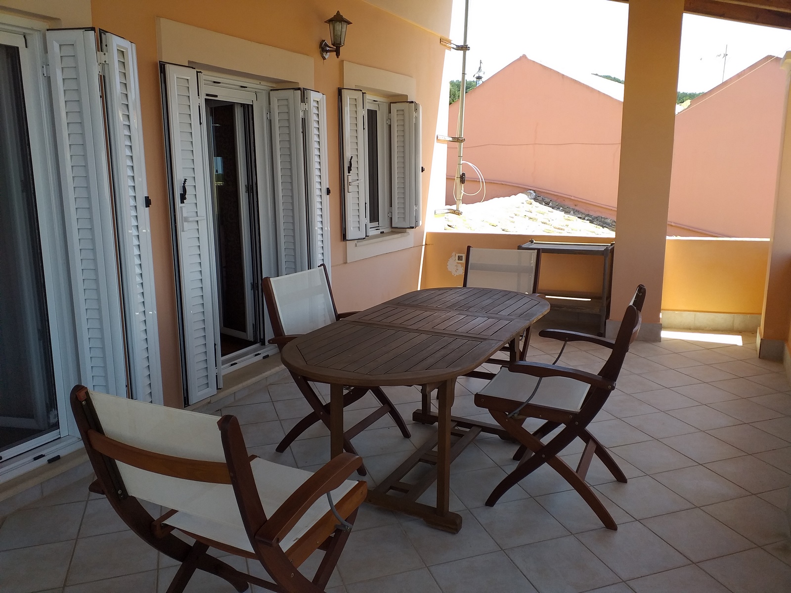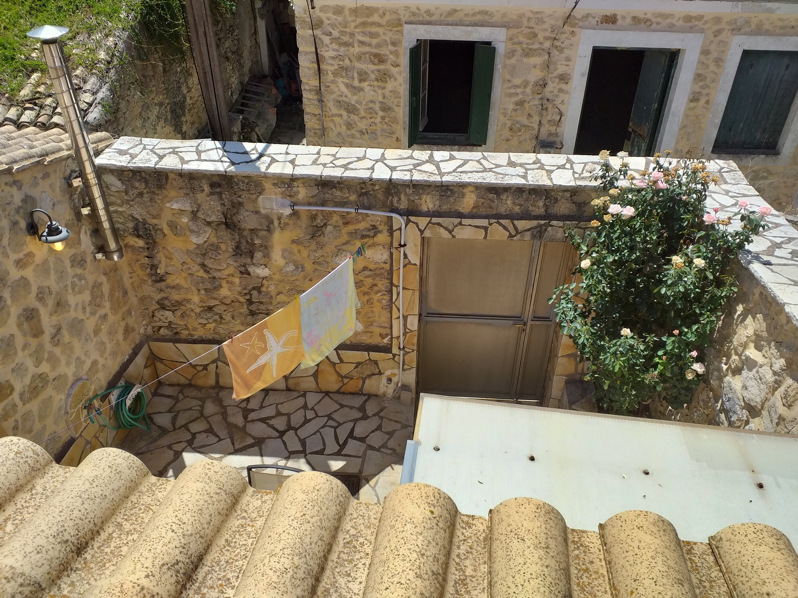 A gateway in a high stone wall leads into the courtyard garden of Natasa's House. There is plenty of space for outside sitting and dining, and a useful storeroom/shed which houses the central heating boiler.