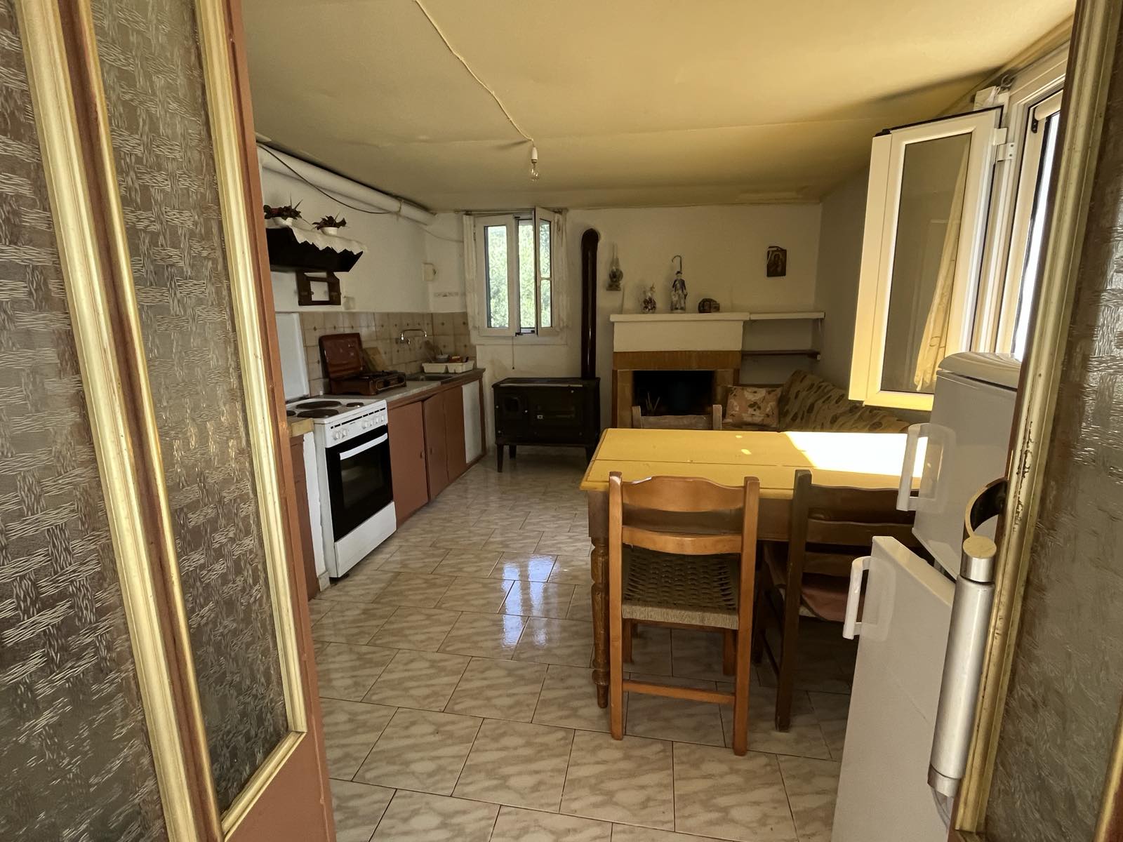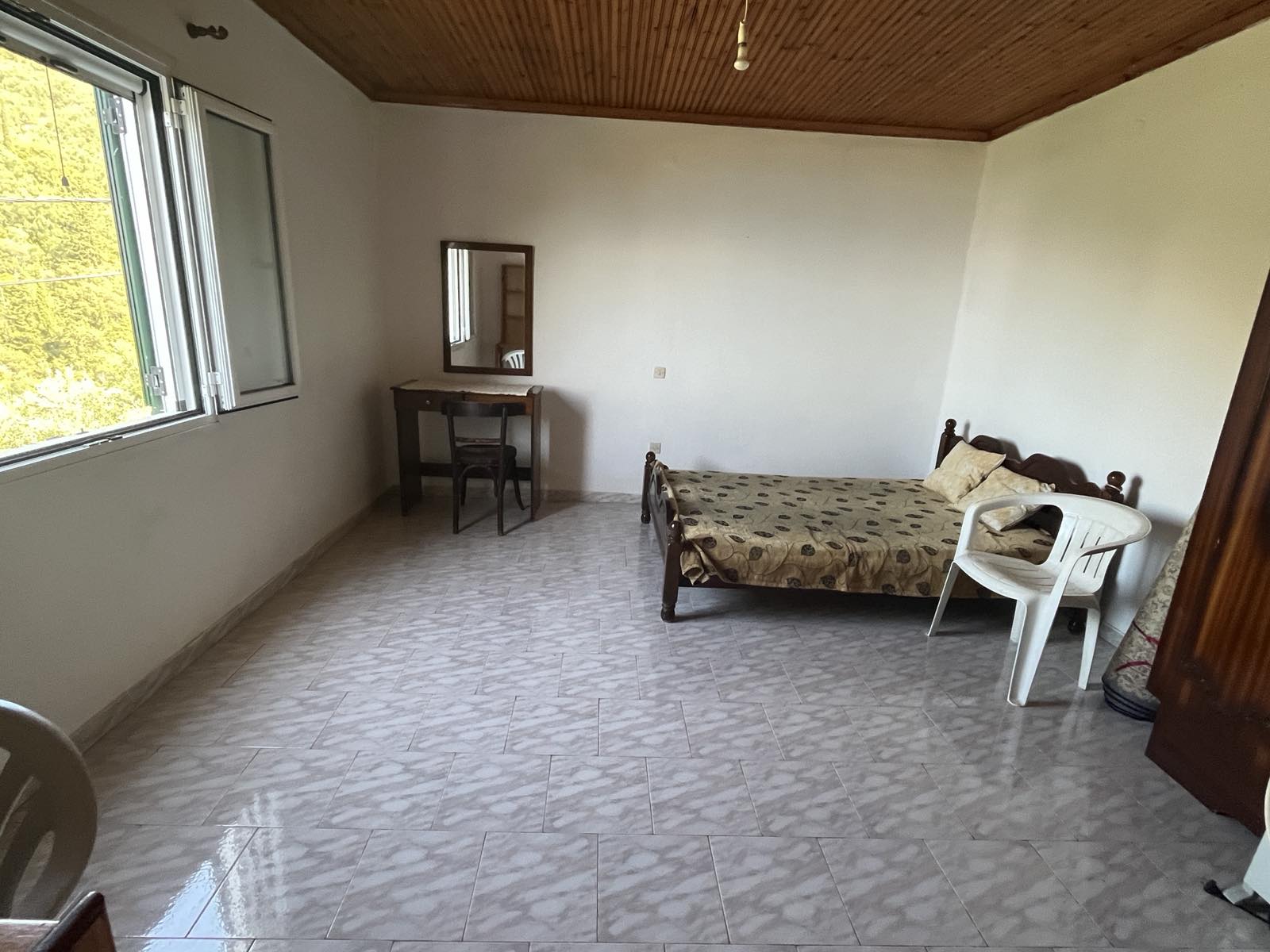 Downstairs, and with a separate entrance is another large room, once the village cafenion. Here is a lovely stone flagged floor, and huge old ceiling beams. The window and entrance door lead out onto a covered terrace, again with a superb view.