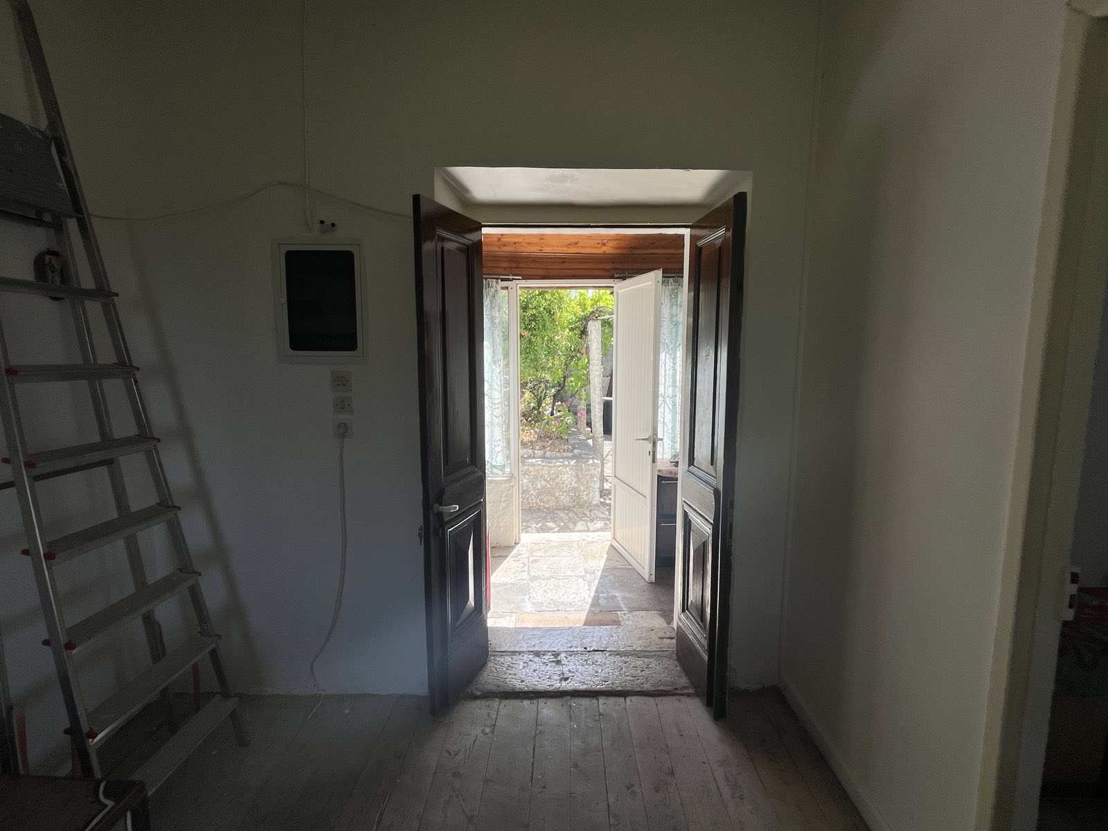 The house is set in a long strip of land, which has several olive trees and stone terraces. There is a pretty garden to one side and a spot to park a car. In addition there is an old stone 'apothiki', a storeroom to the side of the house.