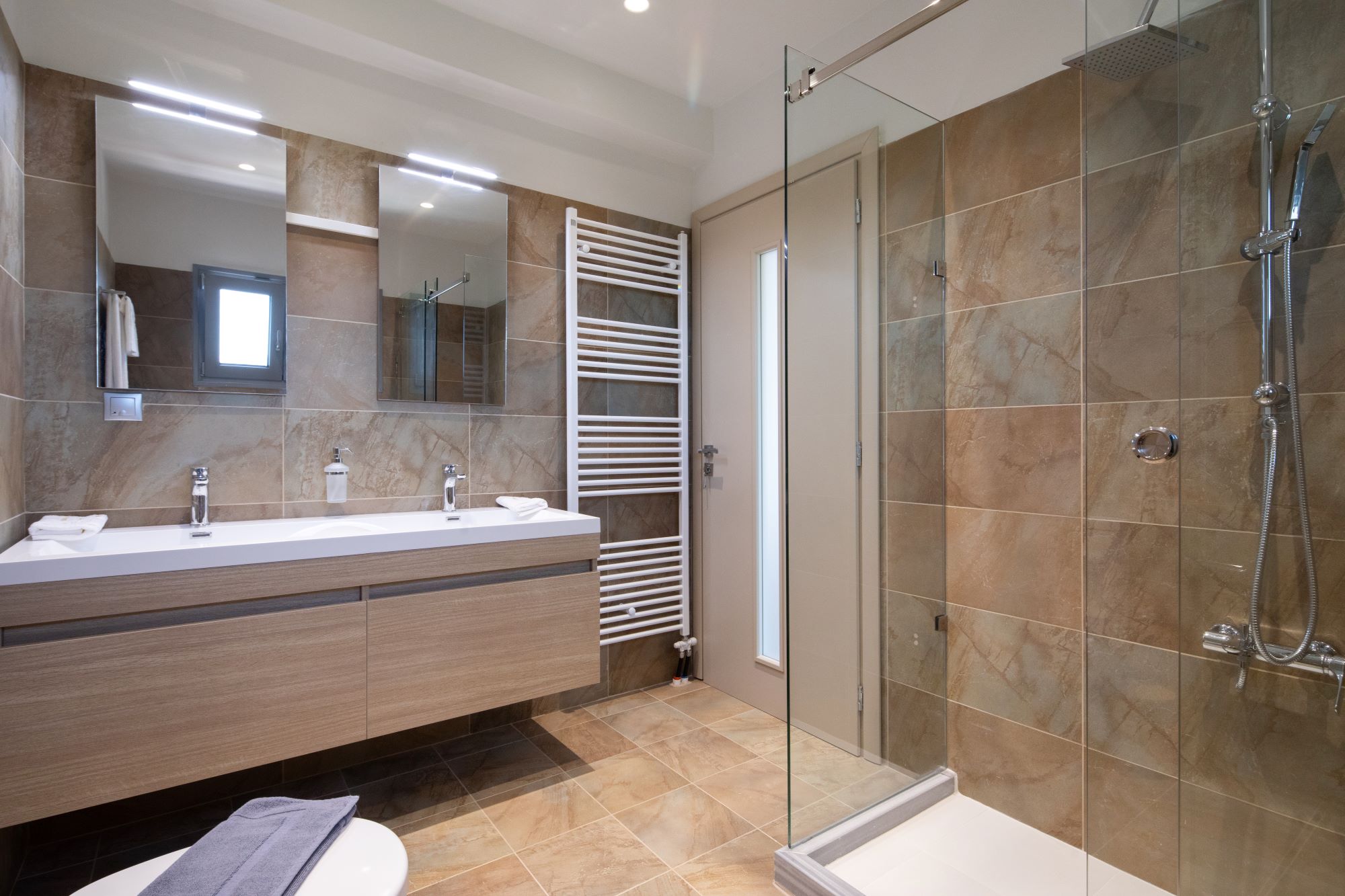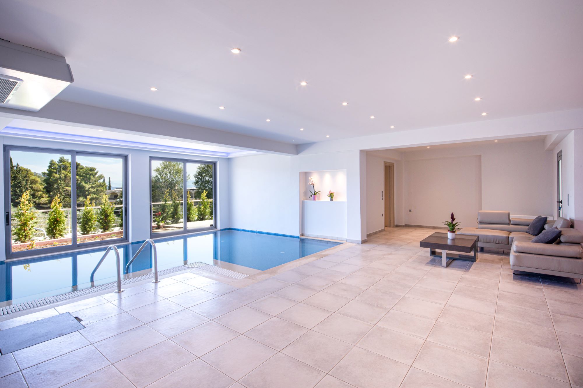 A few steps up into the sitting area, and the windows here lead out onto the pool terrace, with plenty of room for sunbathing. To one side is a pretty olive grove, and the view from this area is towards the lagoon at Gouvia. The pool is an attractive and unusual shape, and there is also a modern walk through shower.