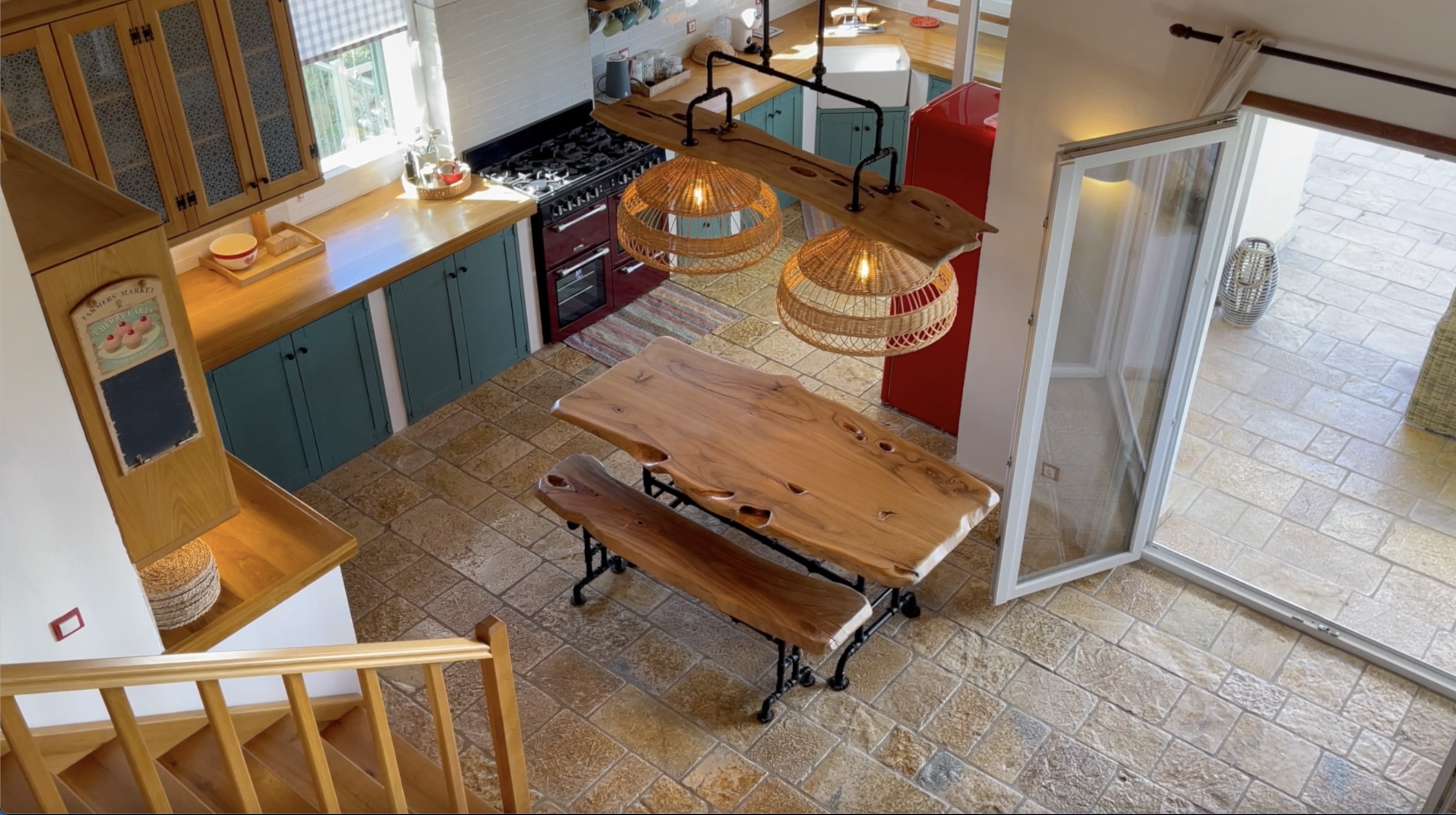 A sweeping driveway heads down to the villa from the road, and then a path leads past the swimming pool to the main entrance, which is at the side of the property. A beautifully crafted solid wood door takes you in to the main living area, which has high beamed ceilings and wide windows overlooking the terrace and the view beyond. A solid stone inglenook-style fireplace houses a wood burning stove, for cozy winter evenings.