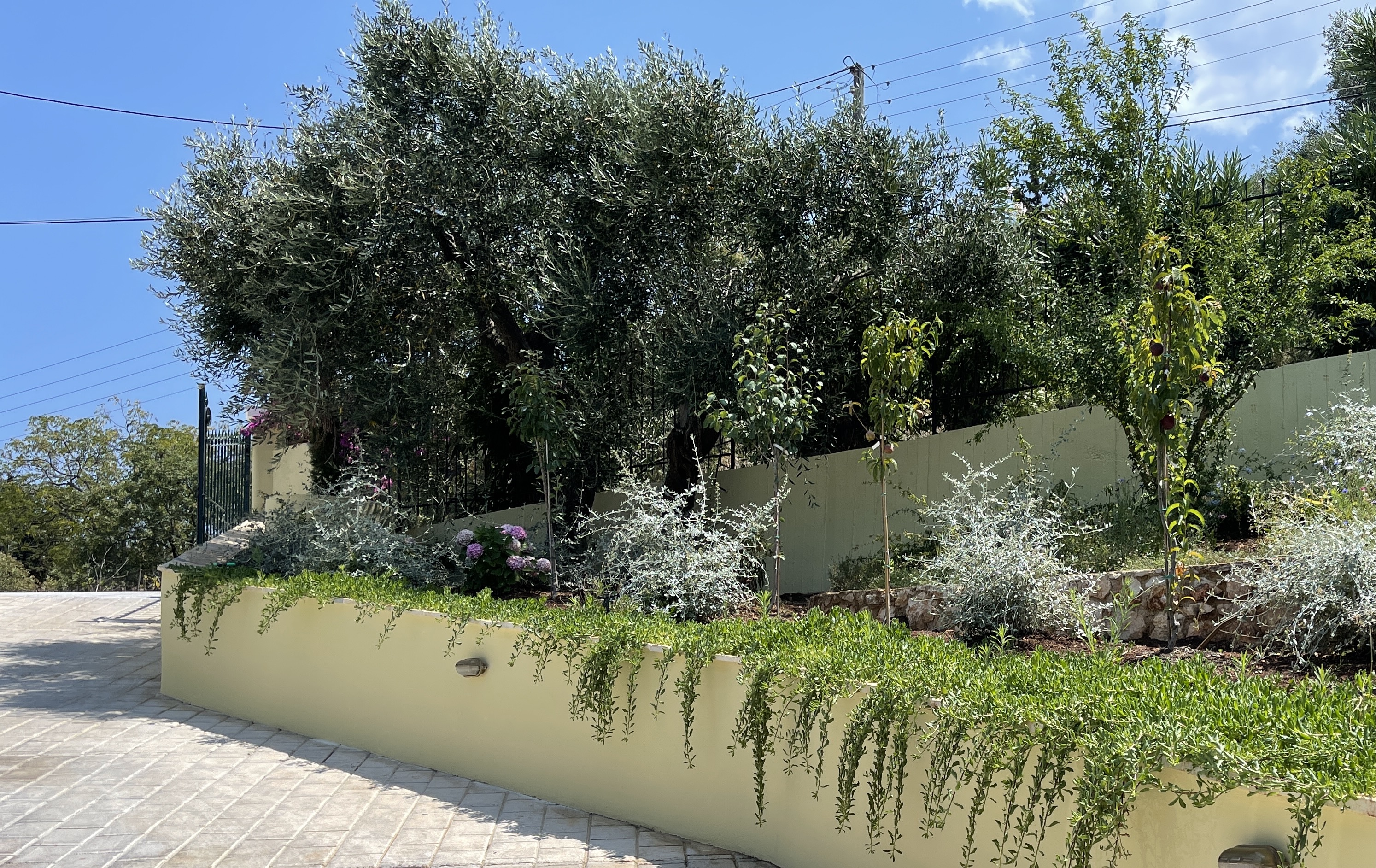 Slightly to the rear of the villa is the pretty swimming pool; surprisingly it also has a lovely sea view but is secluded by a high natural stone wall which continues into the stone facing on the pool and the low wall around it. Twinkly little lights have been incorporated into the wall, so that at night time the whole pool and wall become an attractive feature.