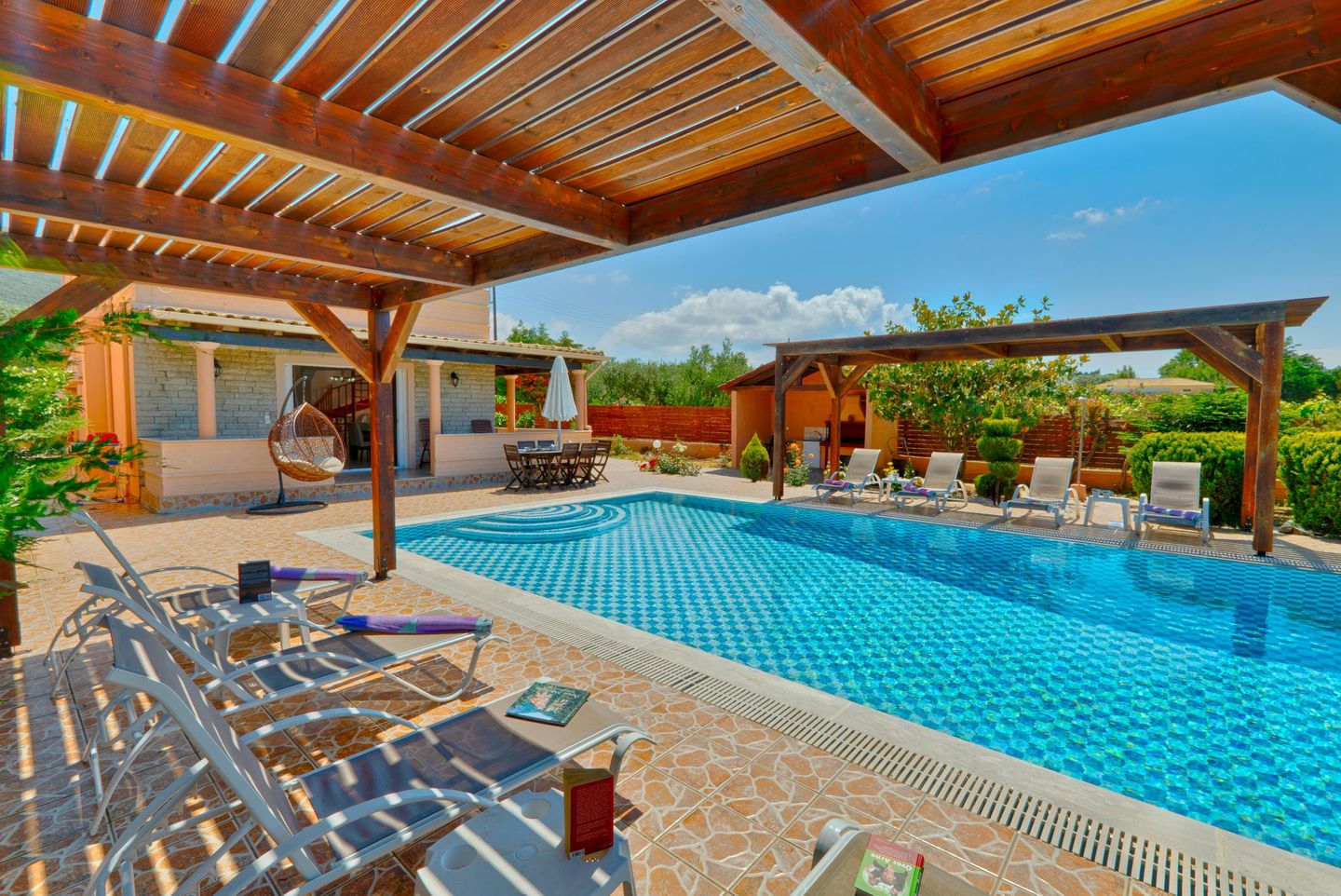 The villa which is one of three by the beach at Kanouli, has 4 bedrooms - 2 on the ground floor and 2 on the first floor, with 3 bathrooms, a large living room and fully equipped kitchen.