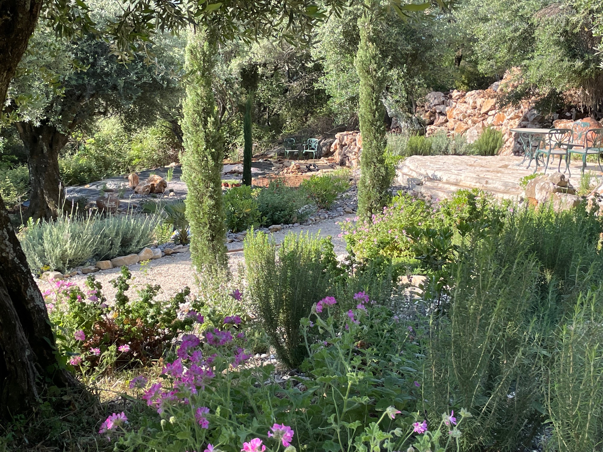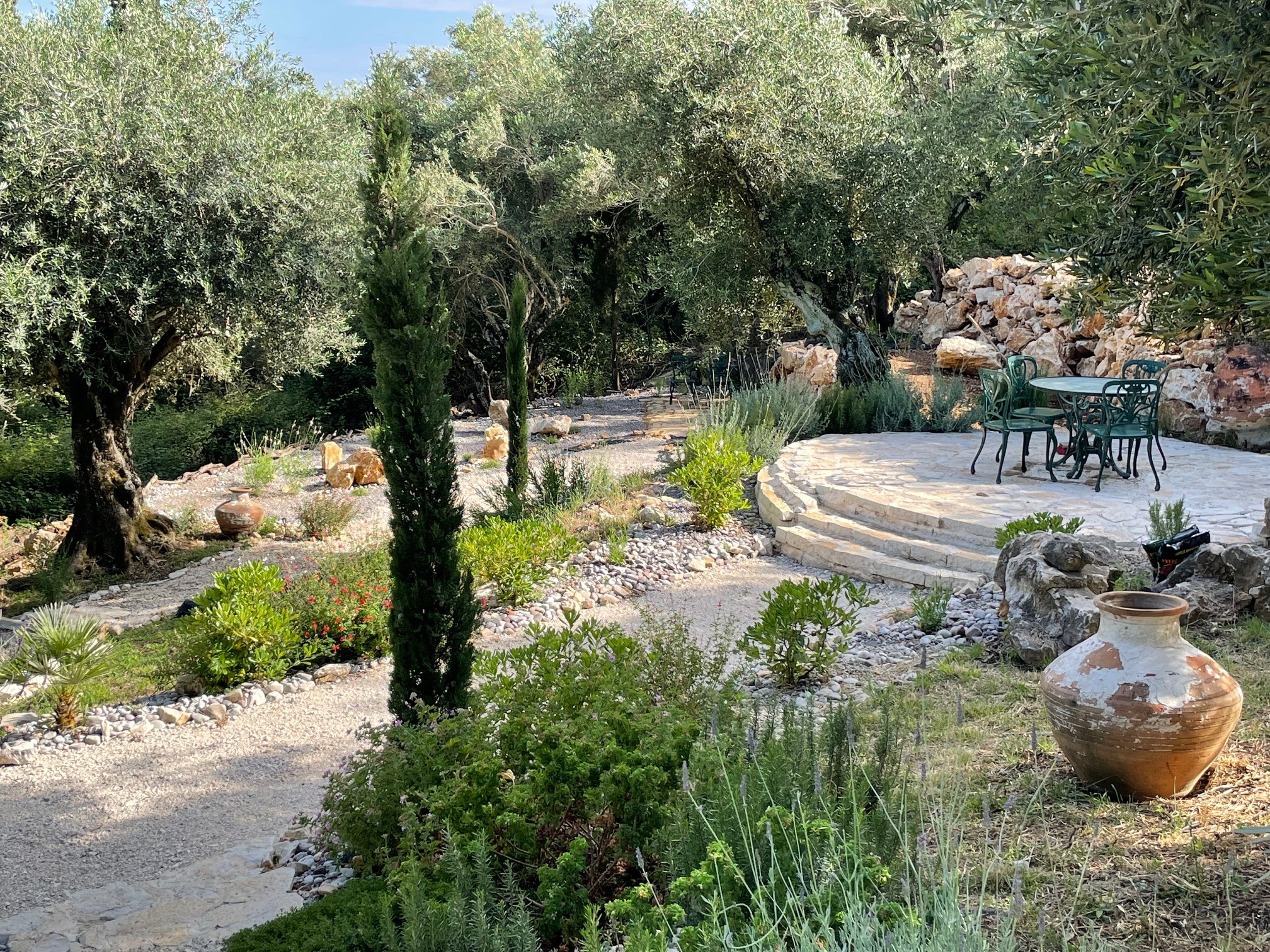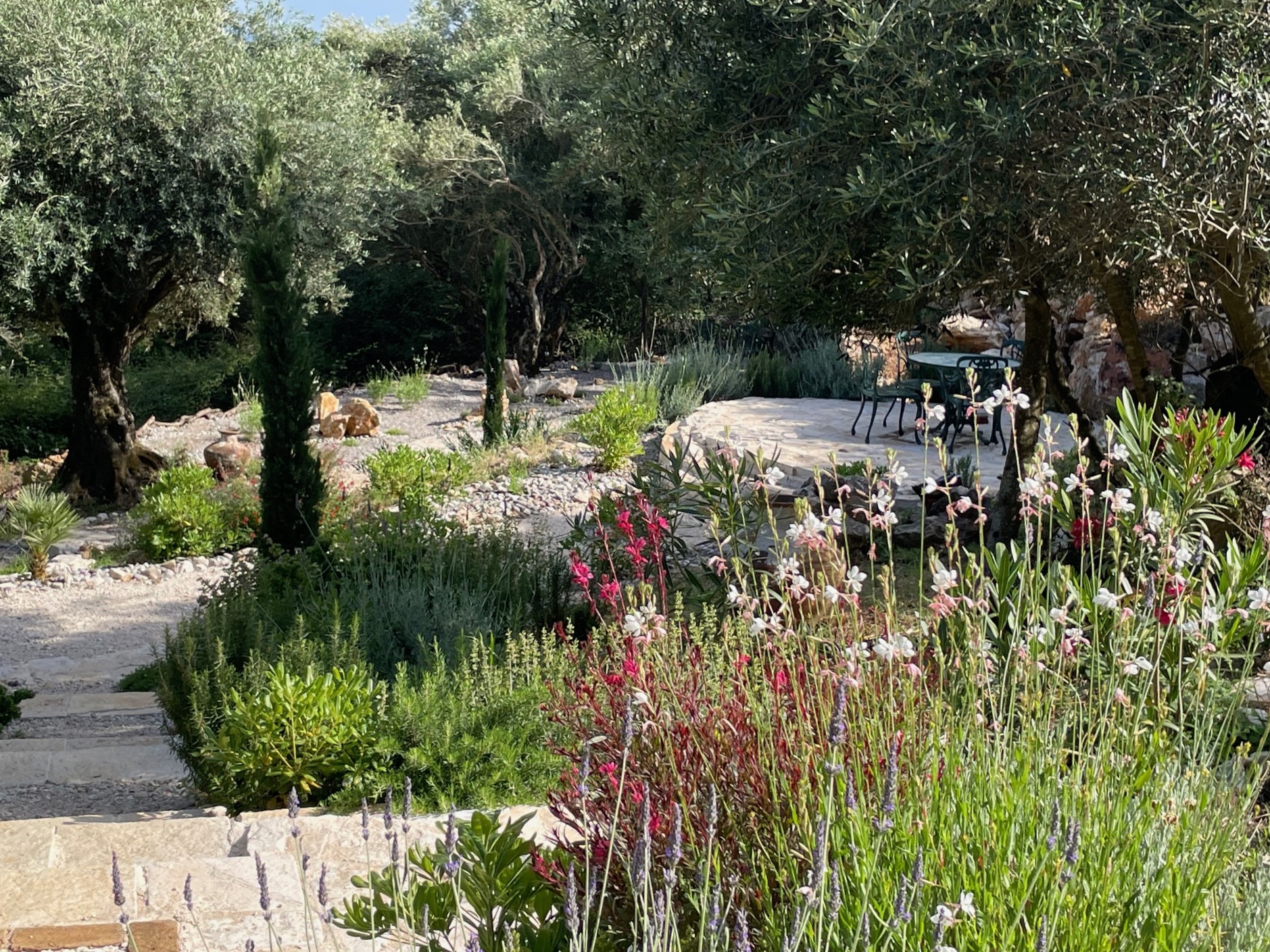 The enchanting Mediterranean style garden has been designed to need minimum maintenance and little watering. Stone pathways lead down through the olive groves to pretty seating areas and a Boulle pitch.