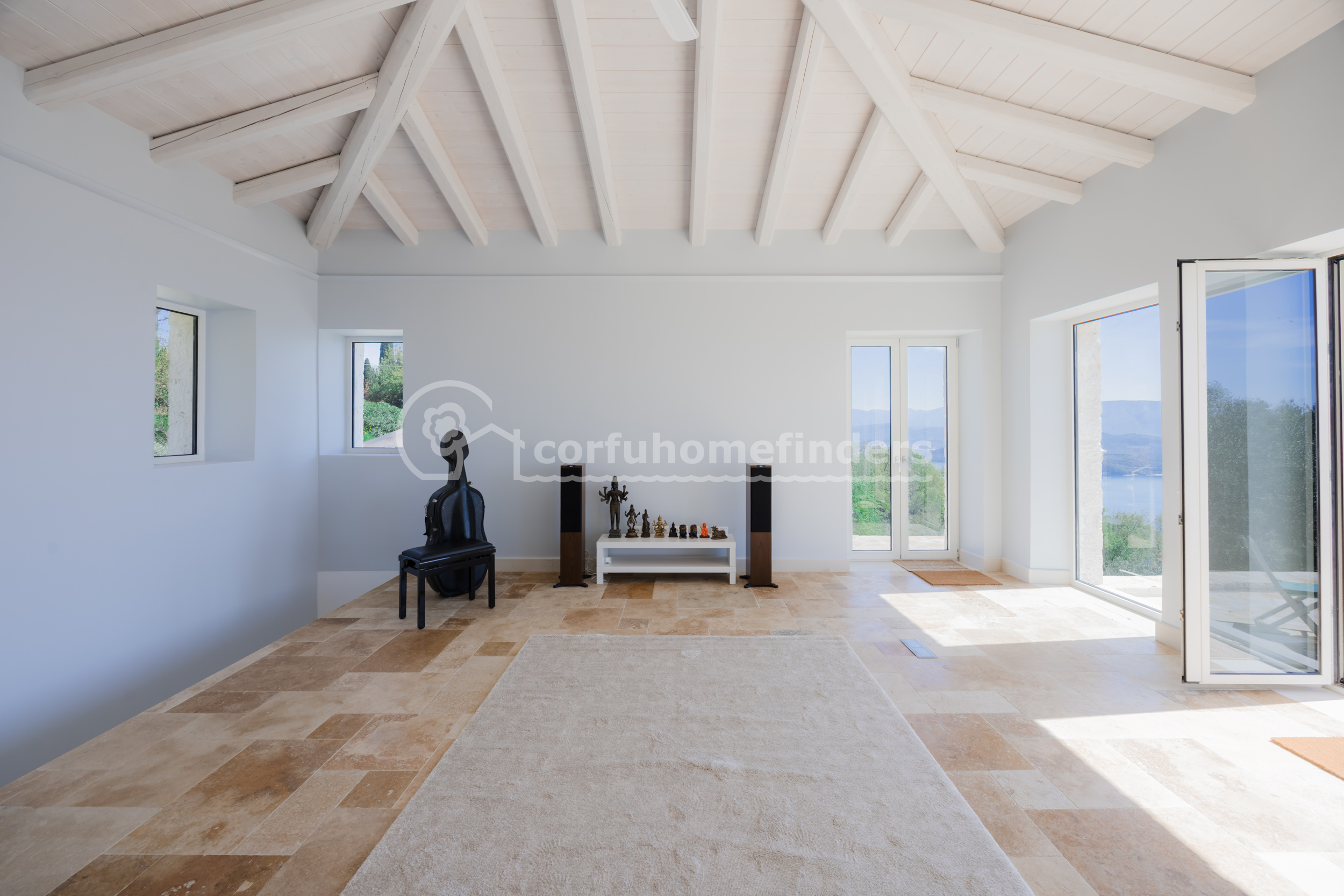 A flight of stairs from the living room leads up to the first floor where there is another spacious reception room or study, which could easily be used as a second bedroom with the addition of an en-suite bathroom. It has a small 'Juliet balcony' overlooking the upper garden and pool and beyond to Albania, and a larger patio facing the sea and views of the Albanian and Greek mainlands. From all aspects of this room the views are quite breathtaking.