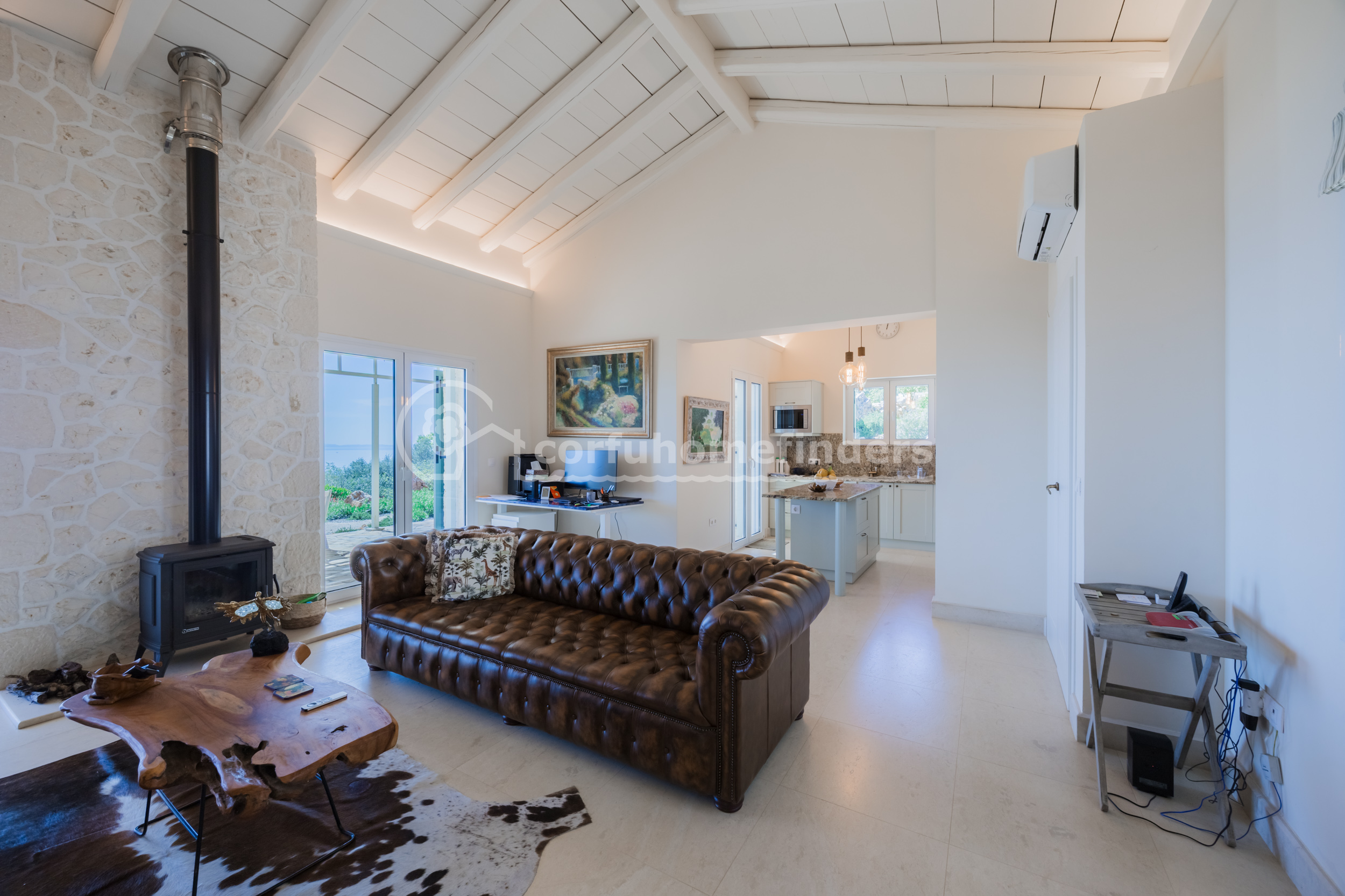 The covered front door opens into a bright and spacious sitting room, with high traditional exposed beam ceilings and balcony windows looking out across the garden to the sea views. The kitchen is to one side, with doors leading out to the shaded terrace and pool. There is a useful walk in storage cupboard next to the kitchen.