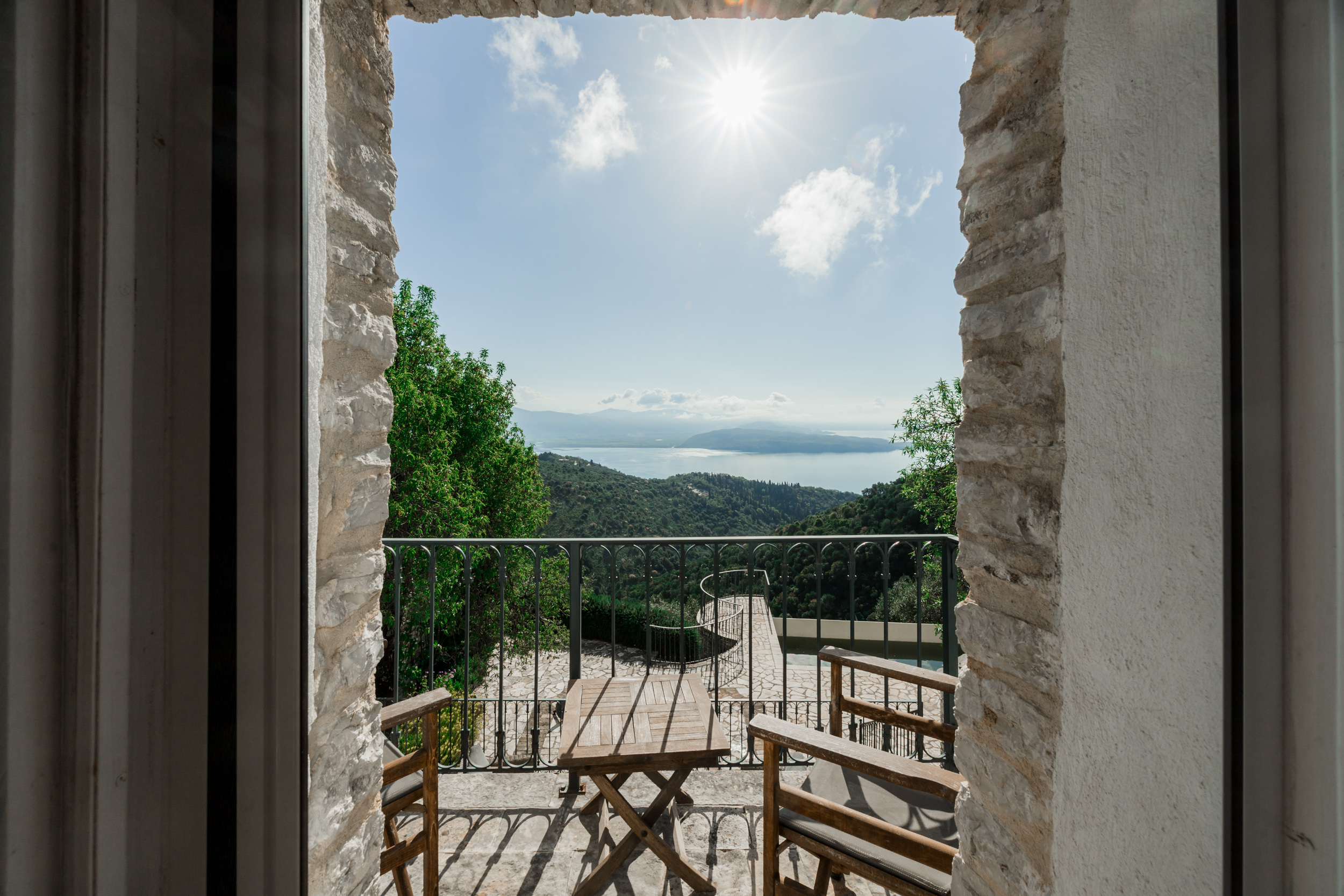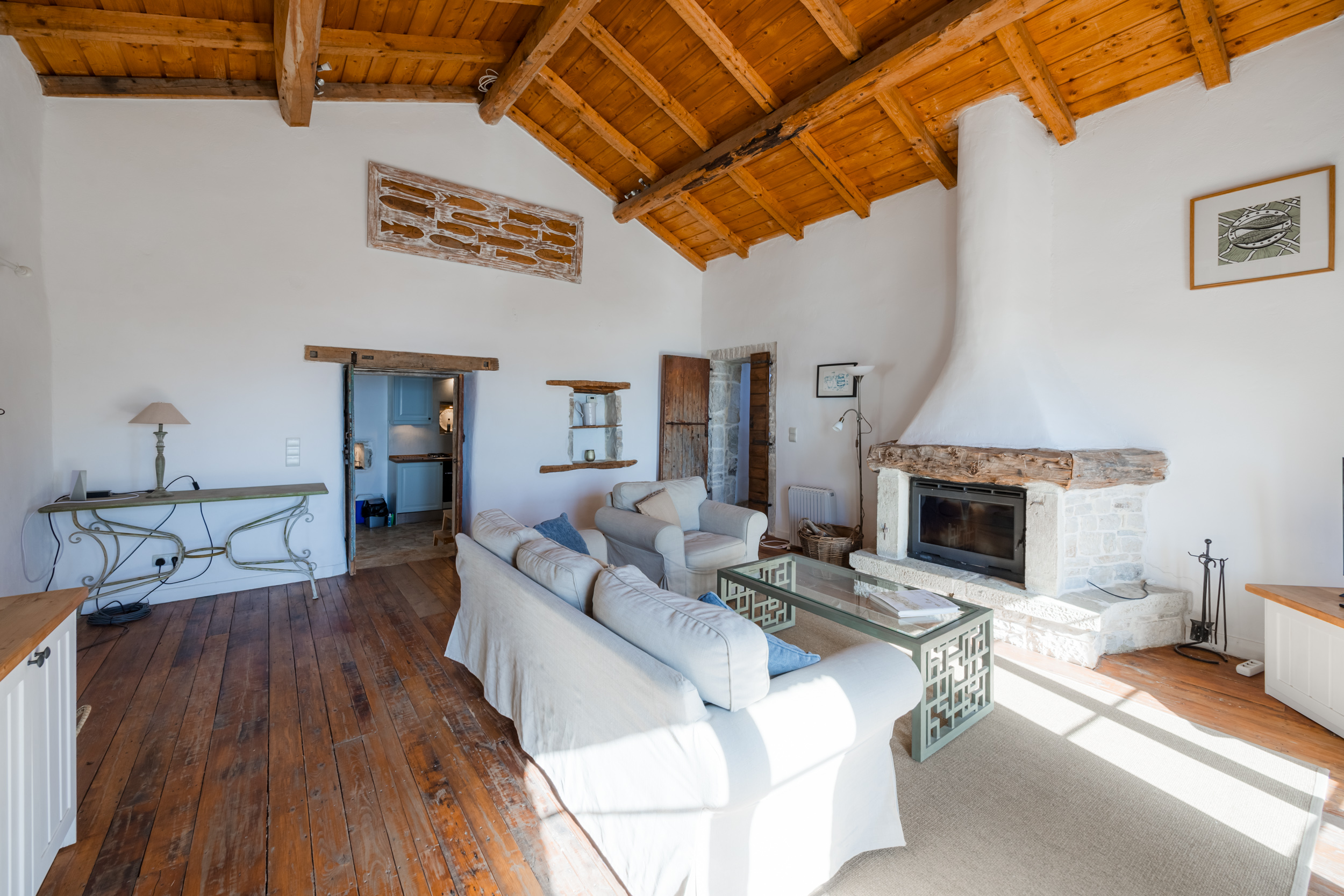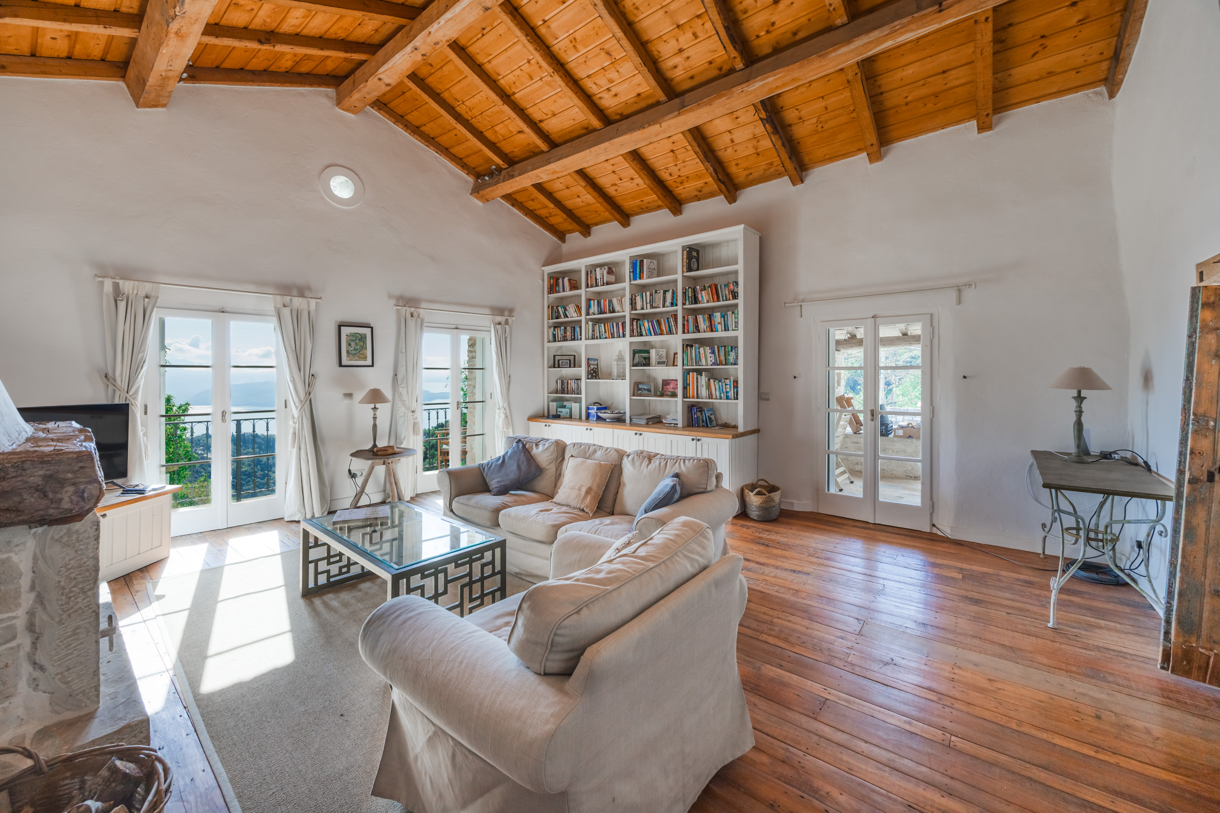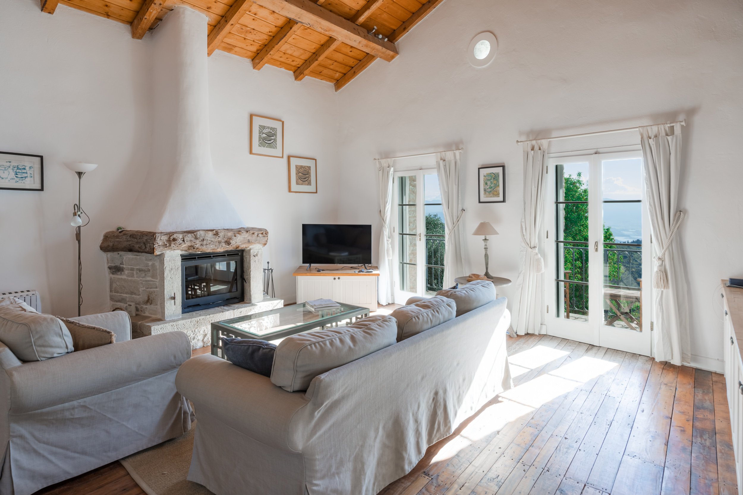 This leads through into a large sitting room with French windows opening onto a balcony offering breathtaking views across to Albania and the Greek mainland. The room has a traditional open fireplace which has been fitted with a contemporary energy-efficient woodburner, to provide plenty of heat on chilly days. The living room has a beautiful old wooden floor and open beams, adding to the overall comfortable atmosphere.