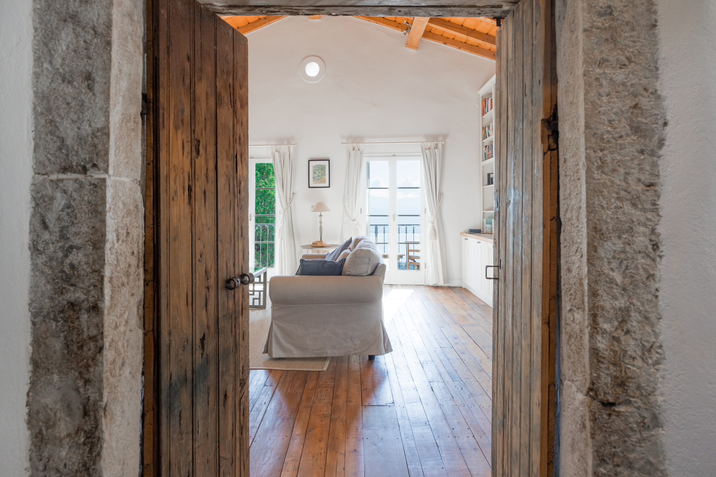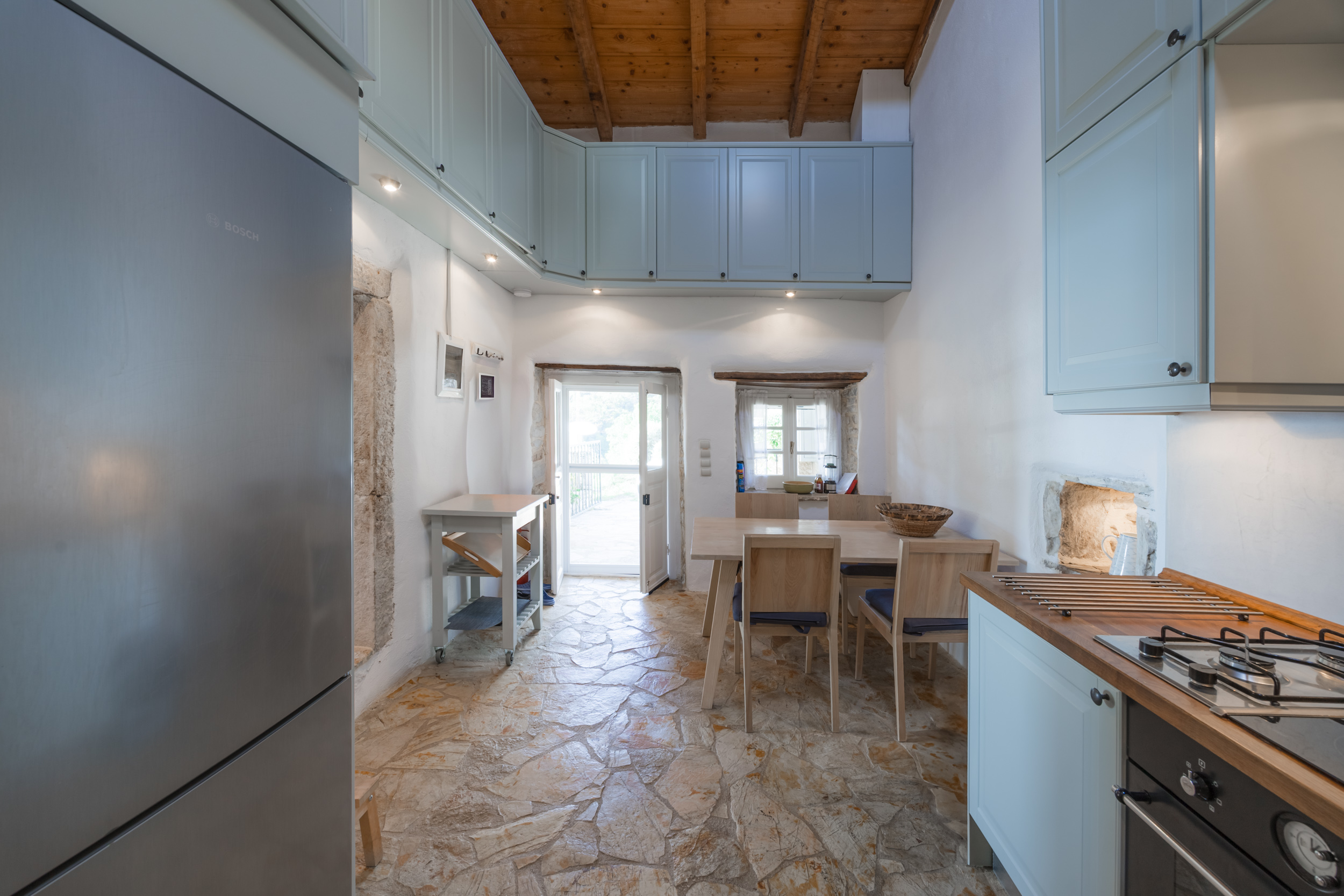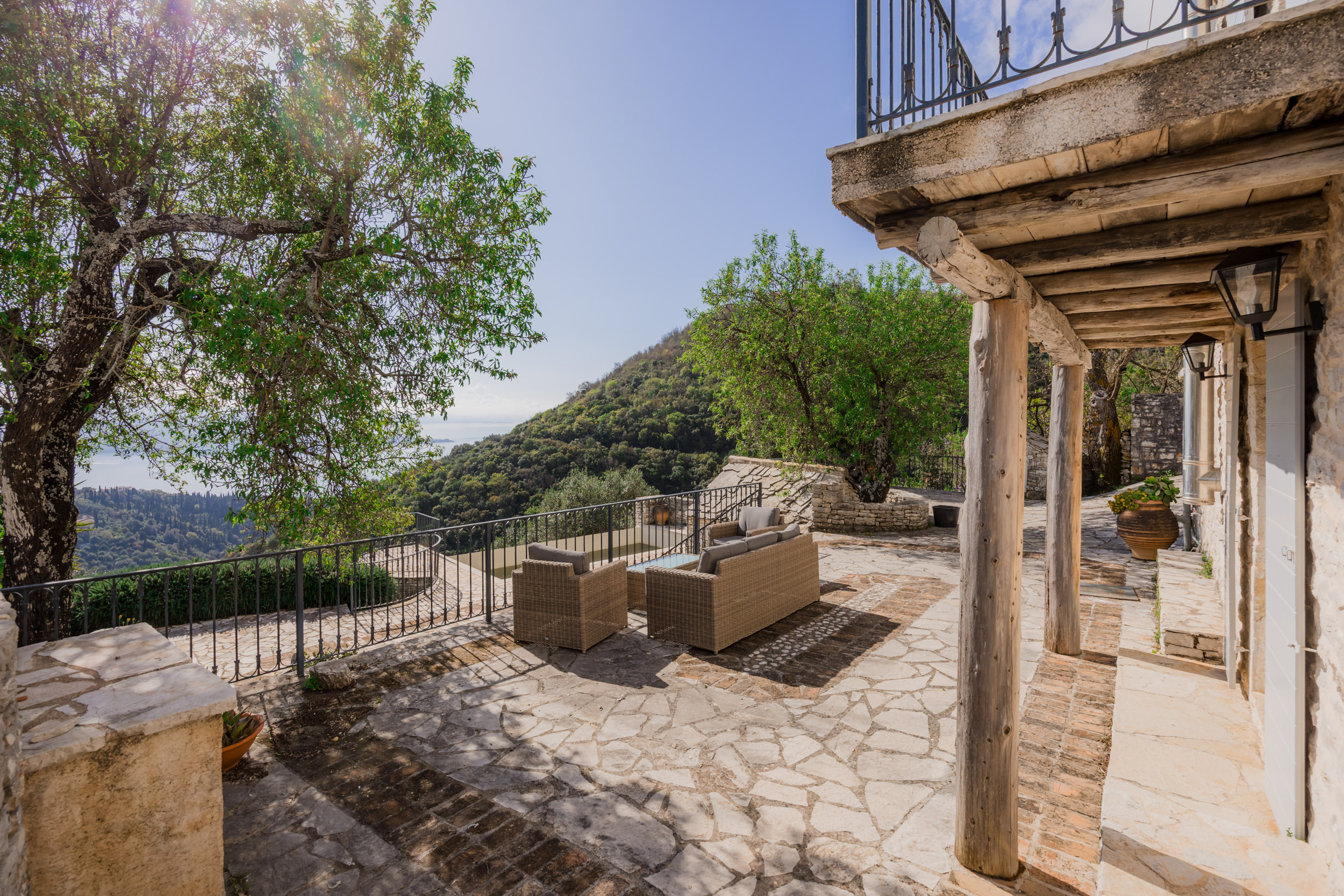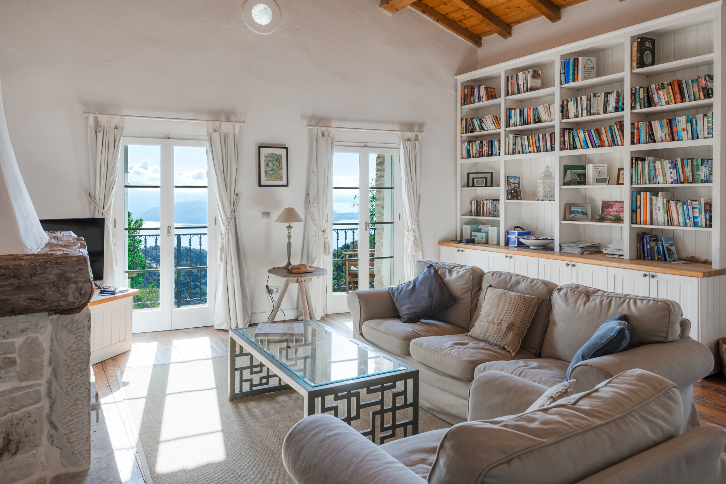 This leads through into a large sitting room with French windows opening onto a balcony offering breathtaking views across to Albania and the Greek mainland. The room has a traditional open fireplace which has been fitted with a contemporary energy-efficient woodburner, to provide plenty of heat on chilly days. The living room has a beautiful old wooden floor and open beams, adding to the overall comfortable atmosphere.