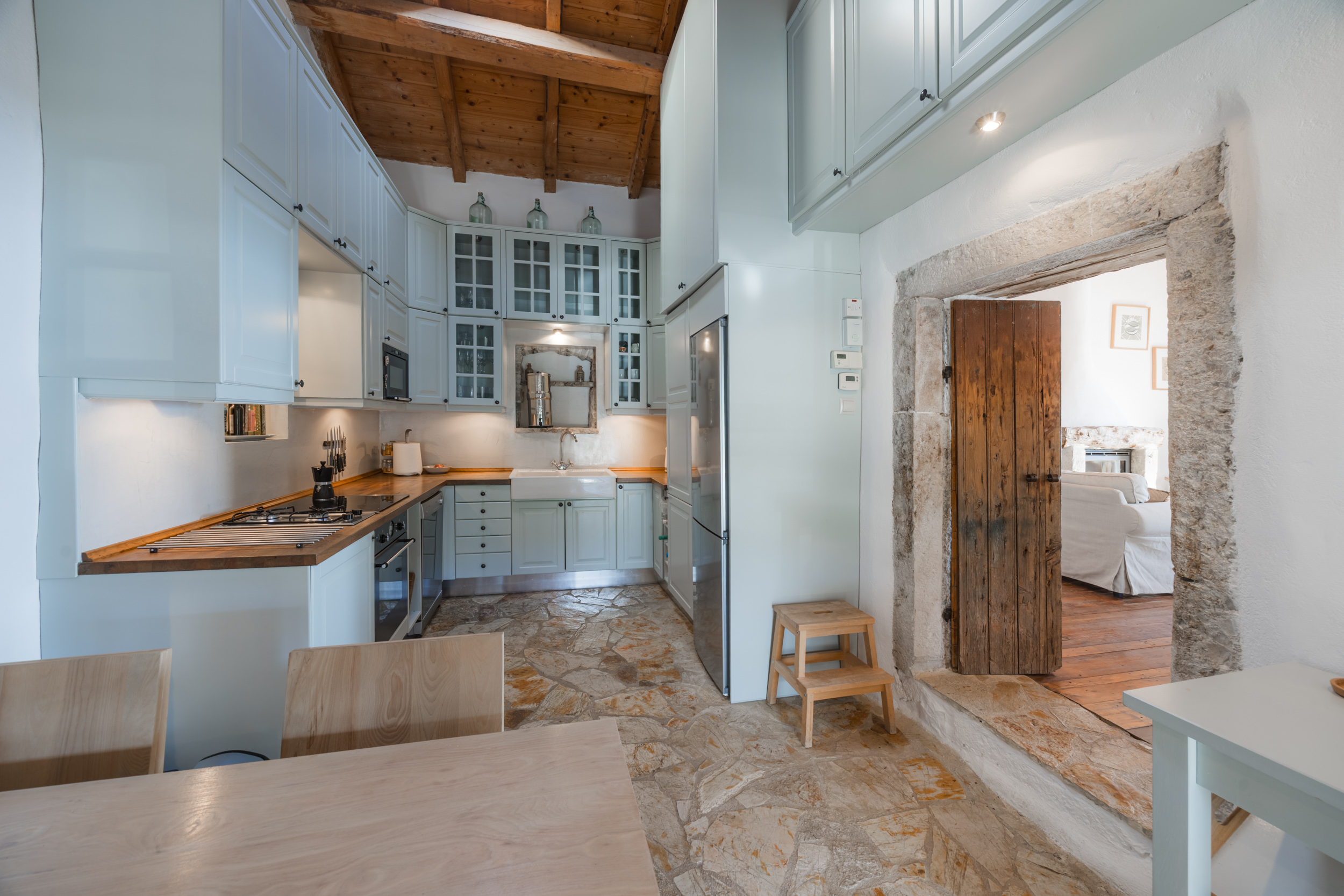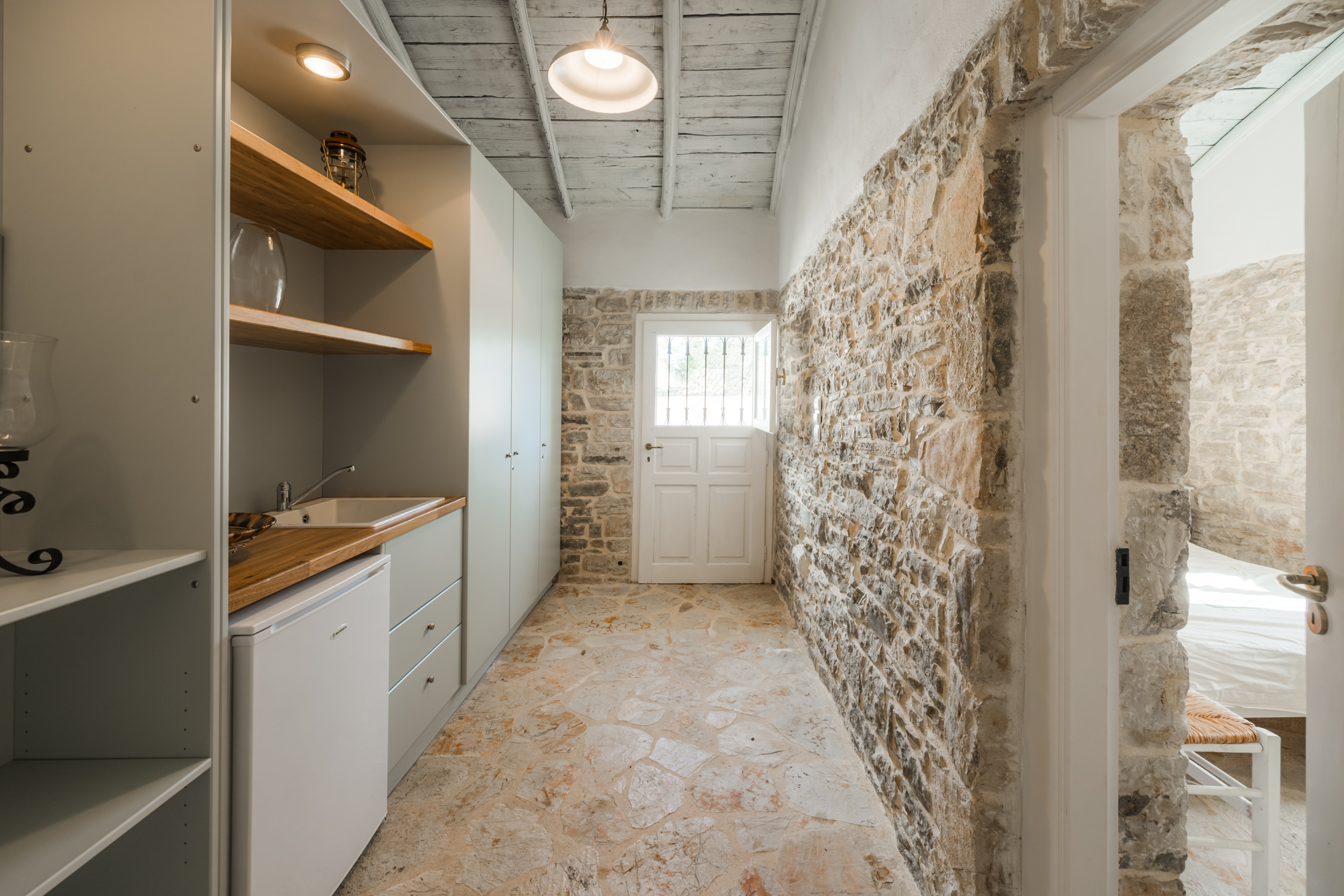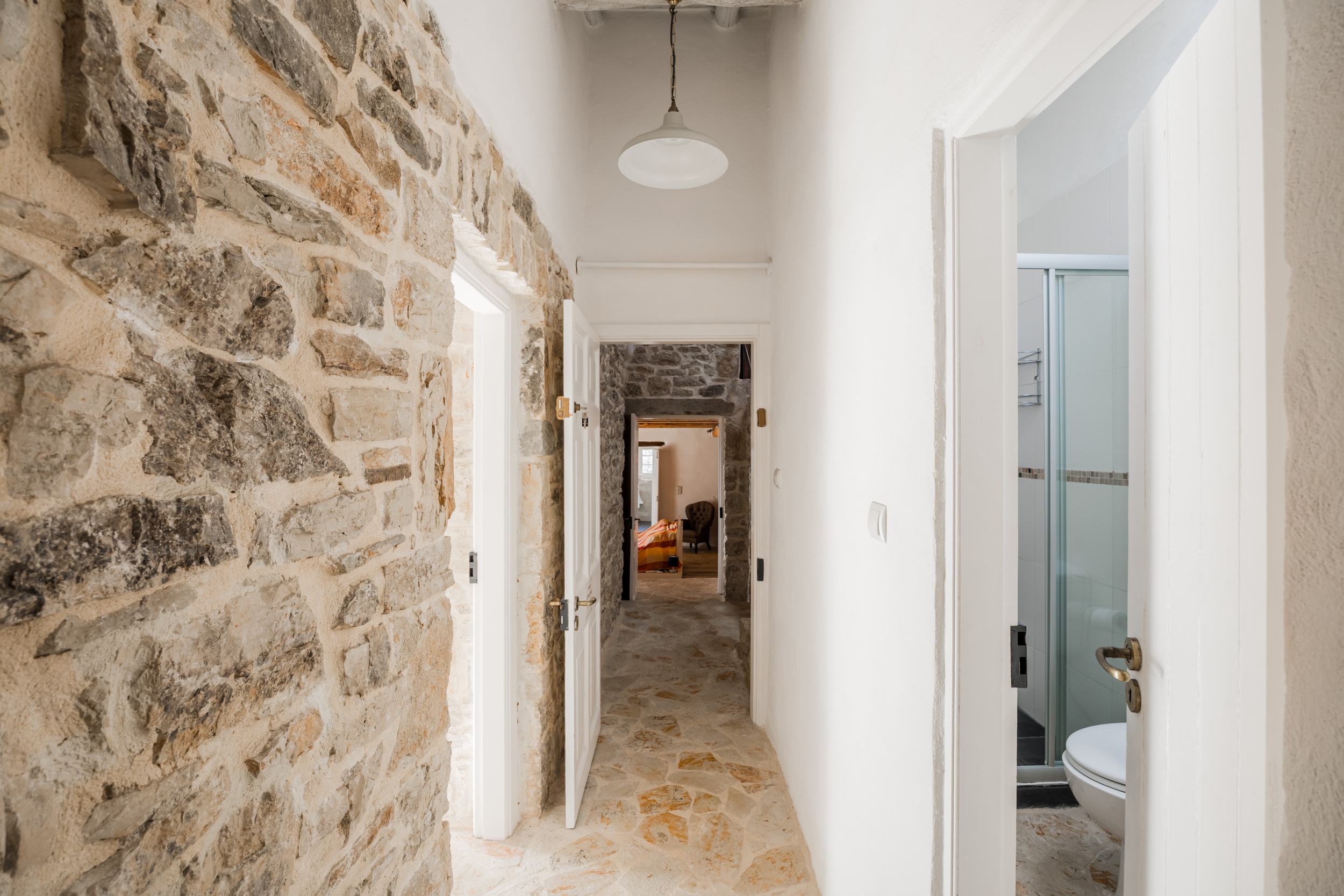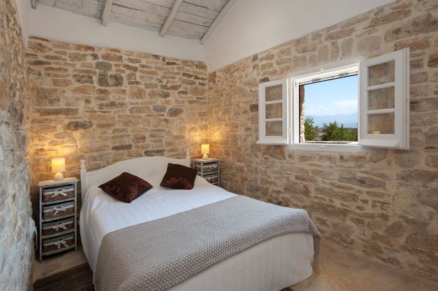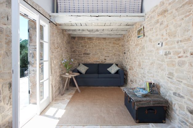 This leads through into a large sitting room with French windows opening onto a balcony offering breathtaking views across to Albania and the Greek mainland. The room has a traditional open fireplace which has been fitted with a contemporary energy-efficient woodburner, to provide plenty of heat on chilly days. The living room has a beautiful old wooden floor and open beams, adding to the overall comfortable atmosphere.