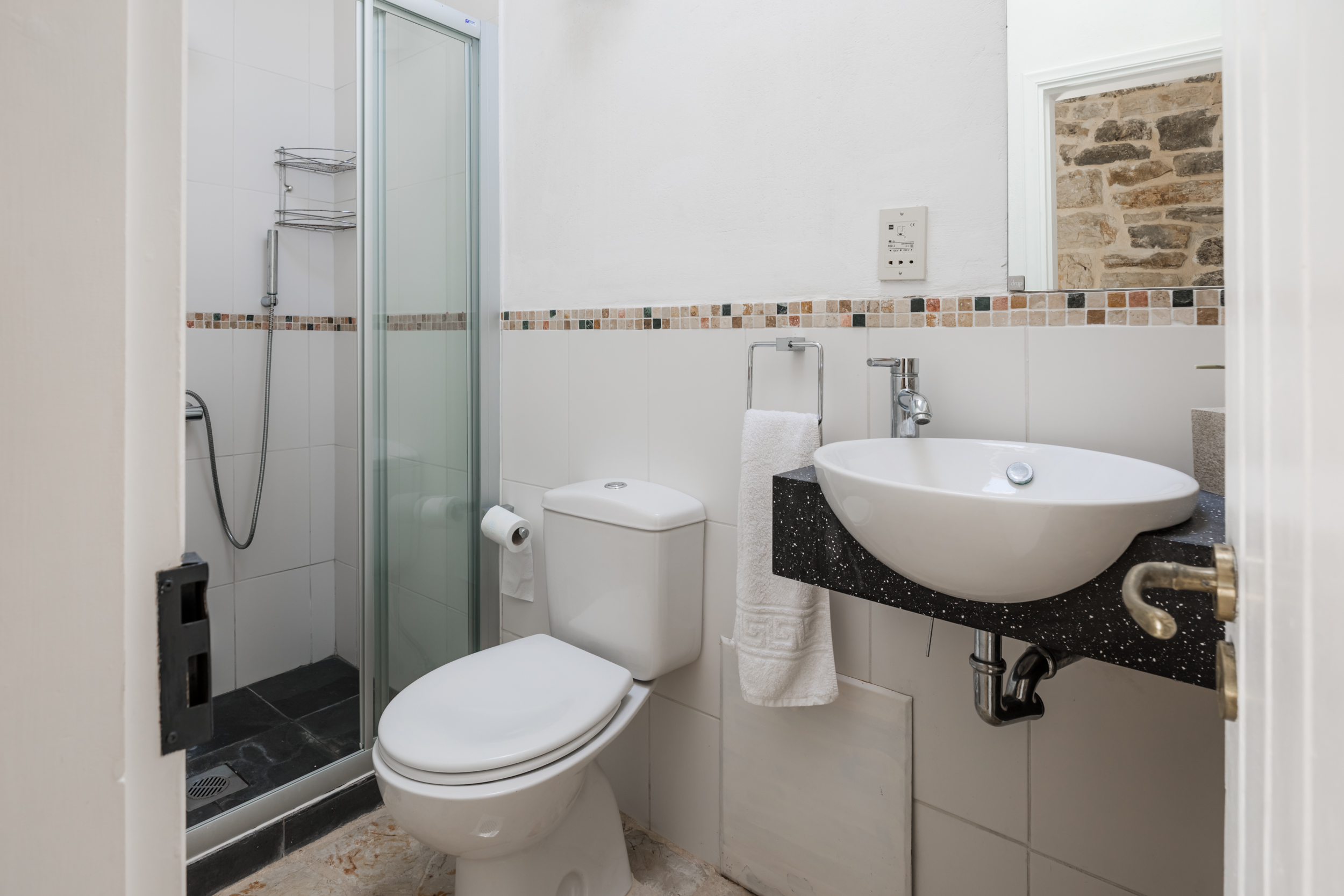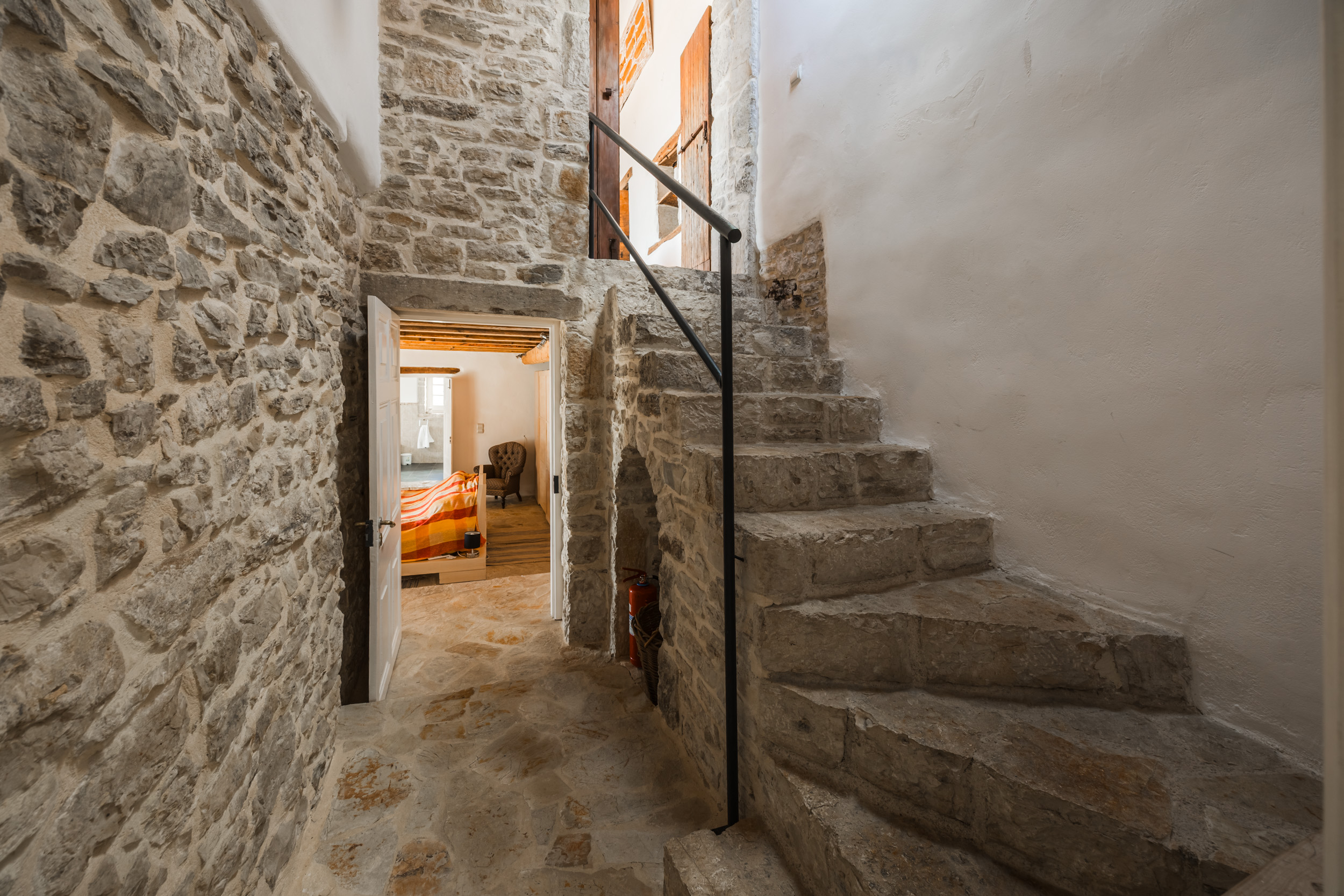 A stone flight of steps leads down to the lower level where there are three rooms.