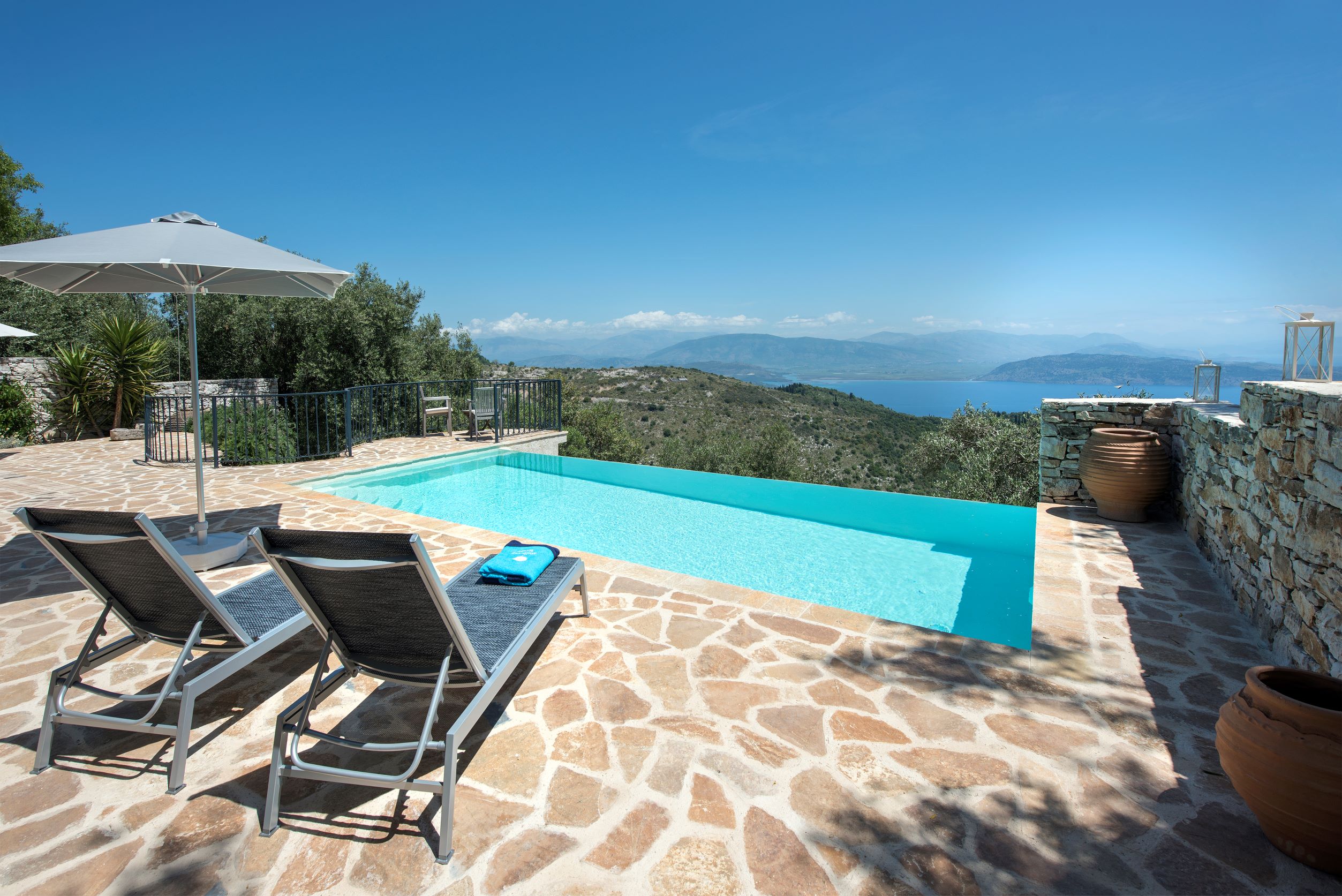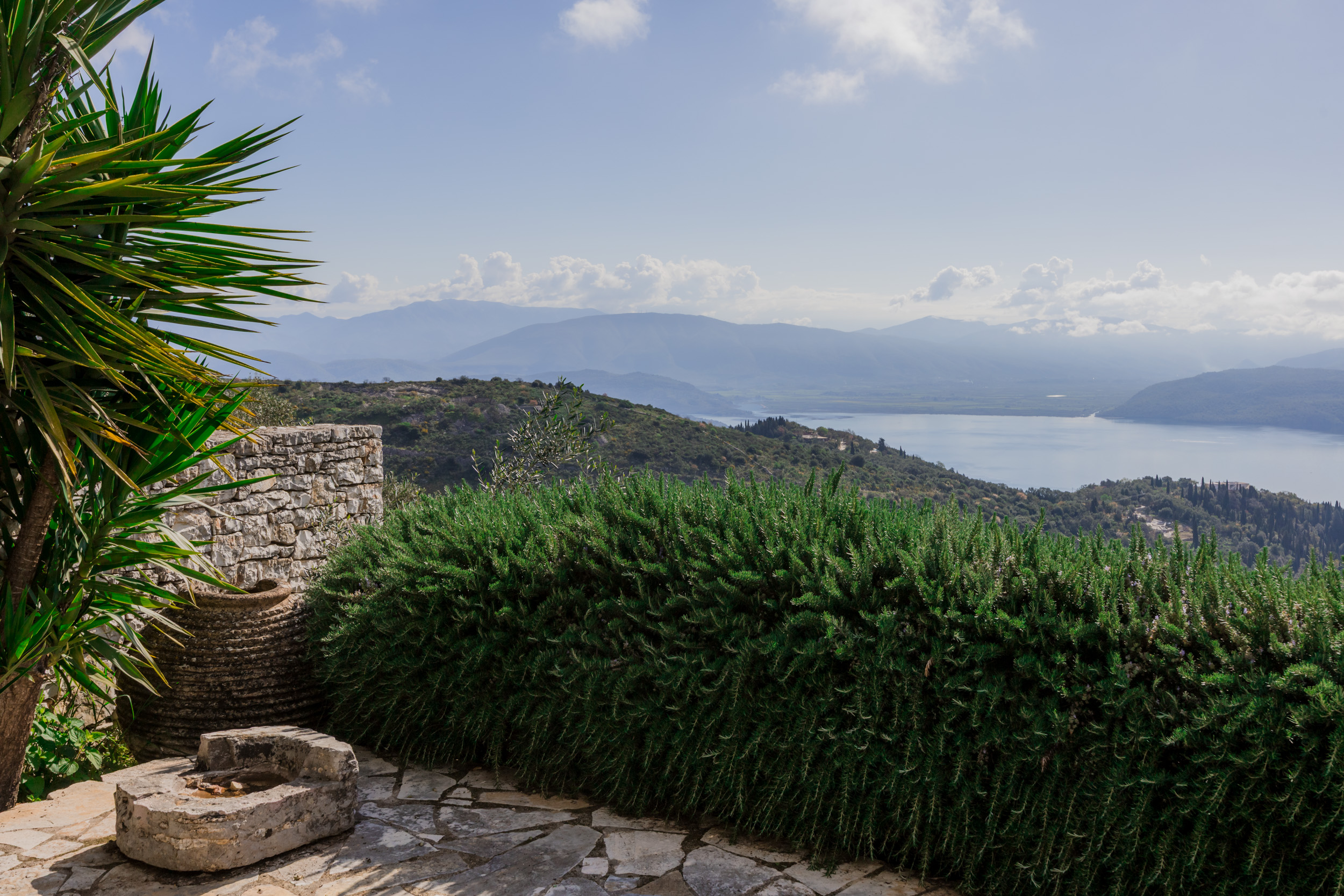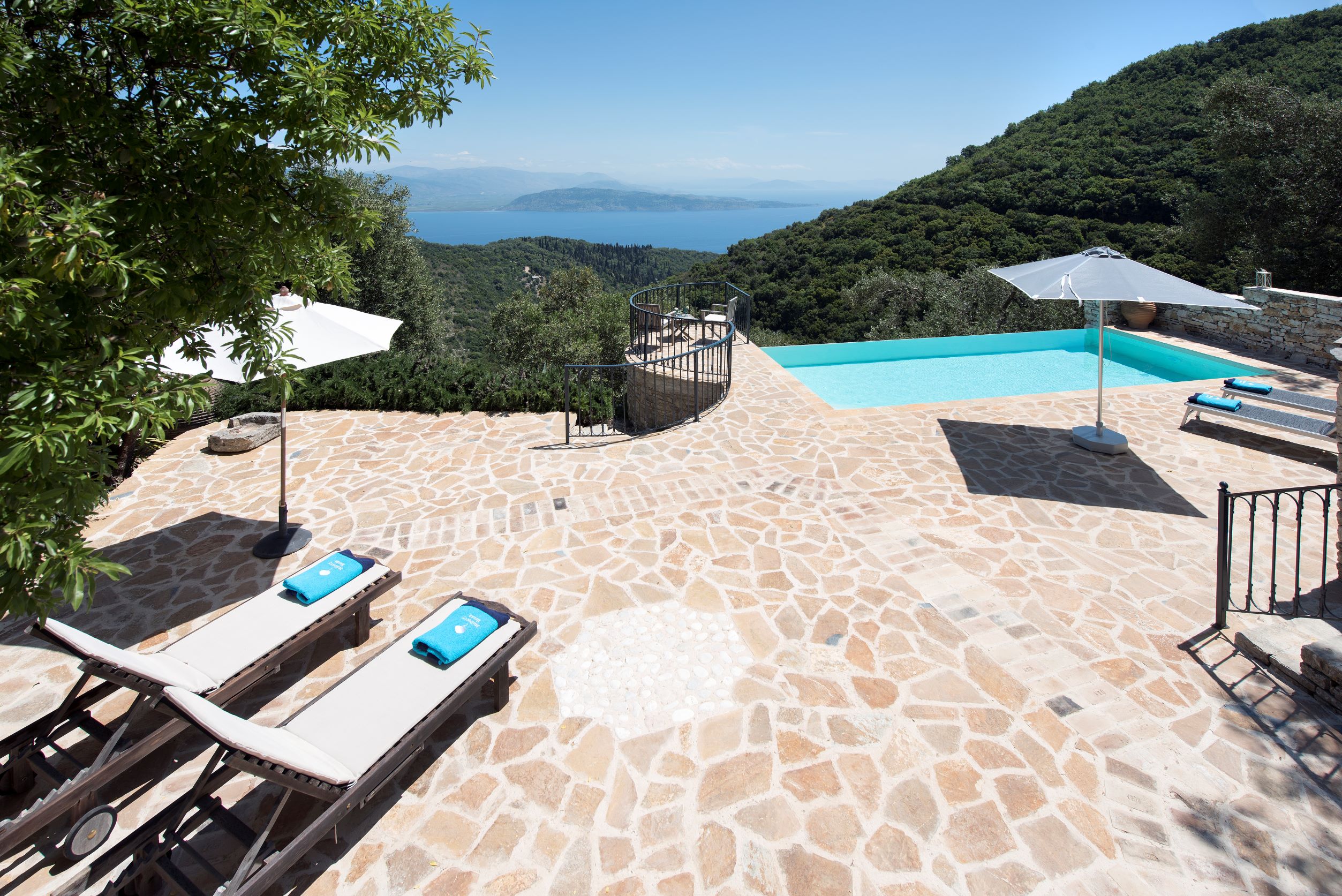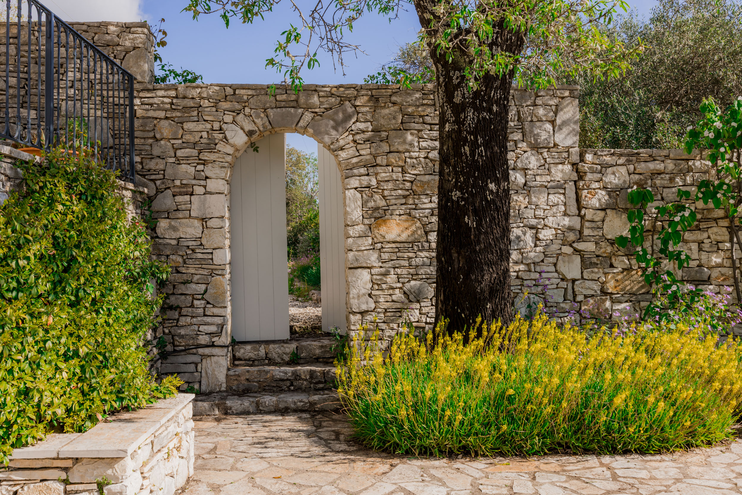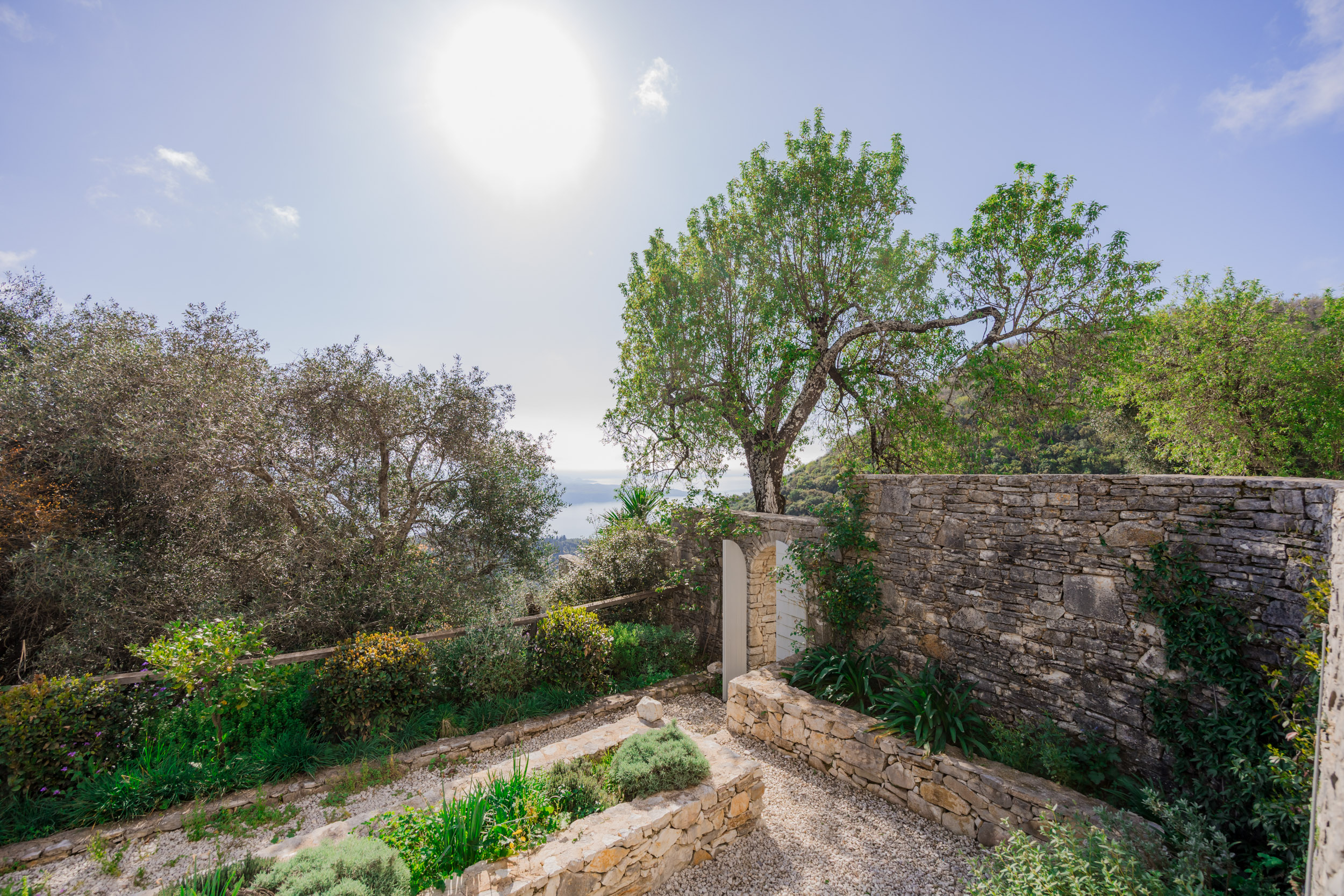 The pool and terraces have been constructed to take full advantage of the magnificent view and enjoy all day sunshine. Stone walls and gravel pathways provide form to the gardens planted with herbaceous shrubs and herbs that withstand the Corfiot climate and extend the to length of the house. Some steps lead down from the pool terrace to an olive grove and wildflower meadow.