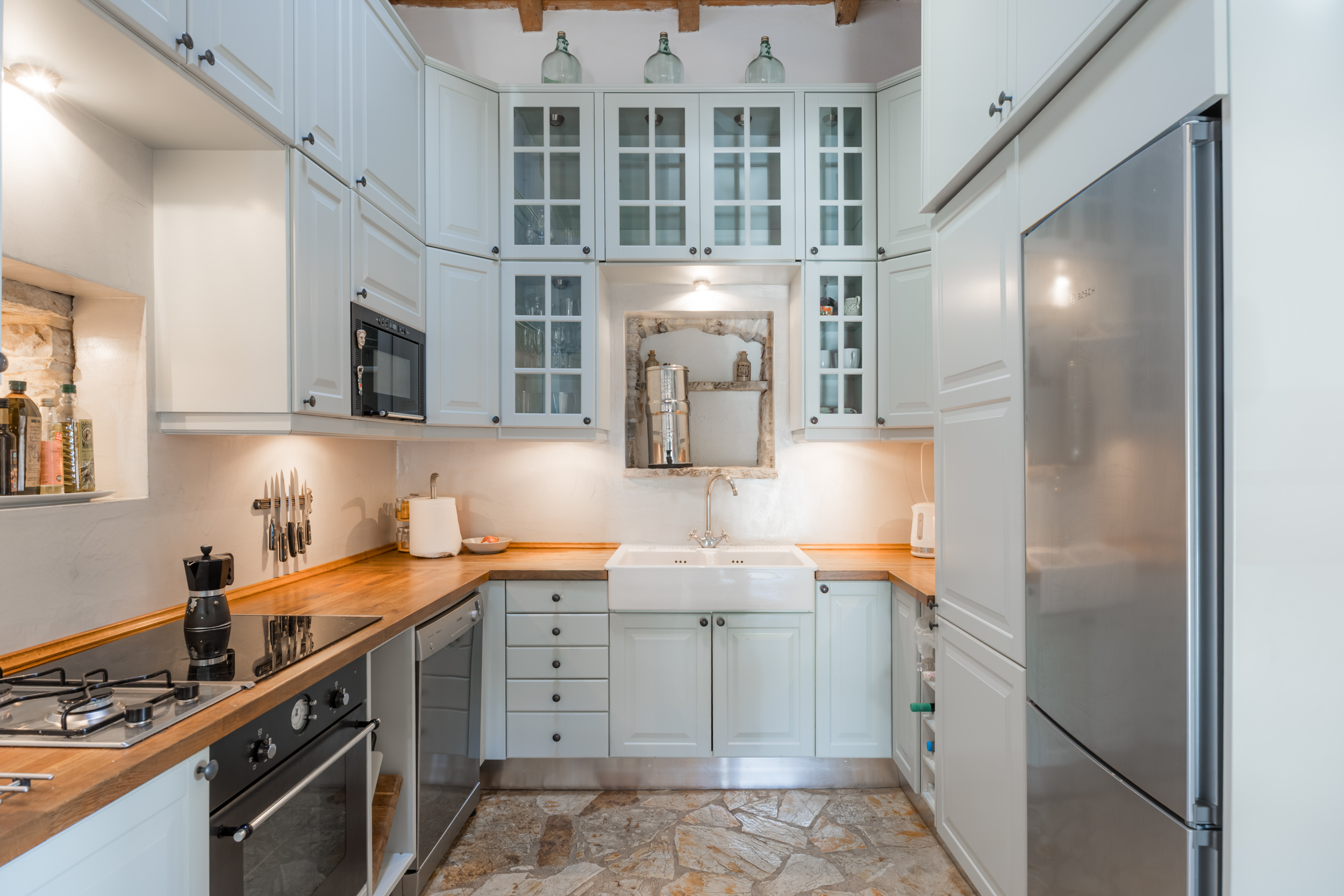 The property is over two levels, with the main living accommodation being on the upper level with high open wood-beamed ceilings. Entry is through the kitchen, fitted with modern but traditional style units, including a double ceramic Belfast sink, gas and electric hob, oven, fridge/freezer and dishwasher. There is lots of storage, and the kitchen has an exceptionally high ceiling with open wood beams.