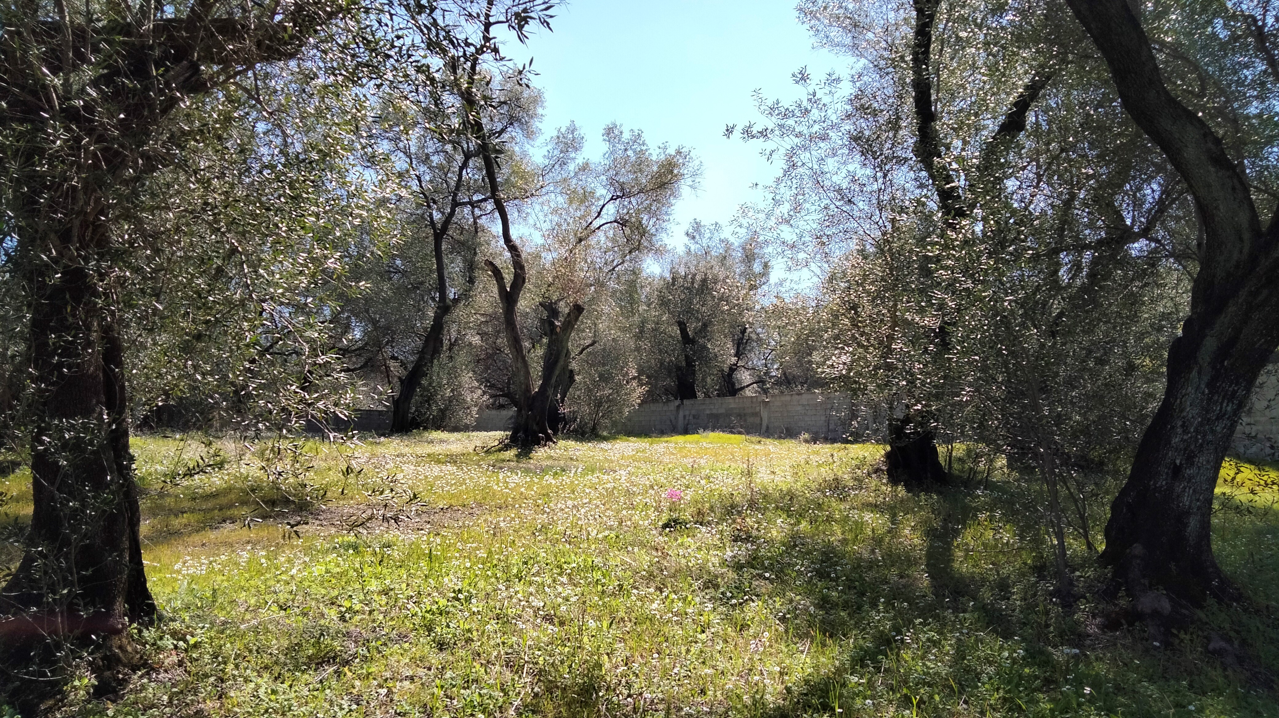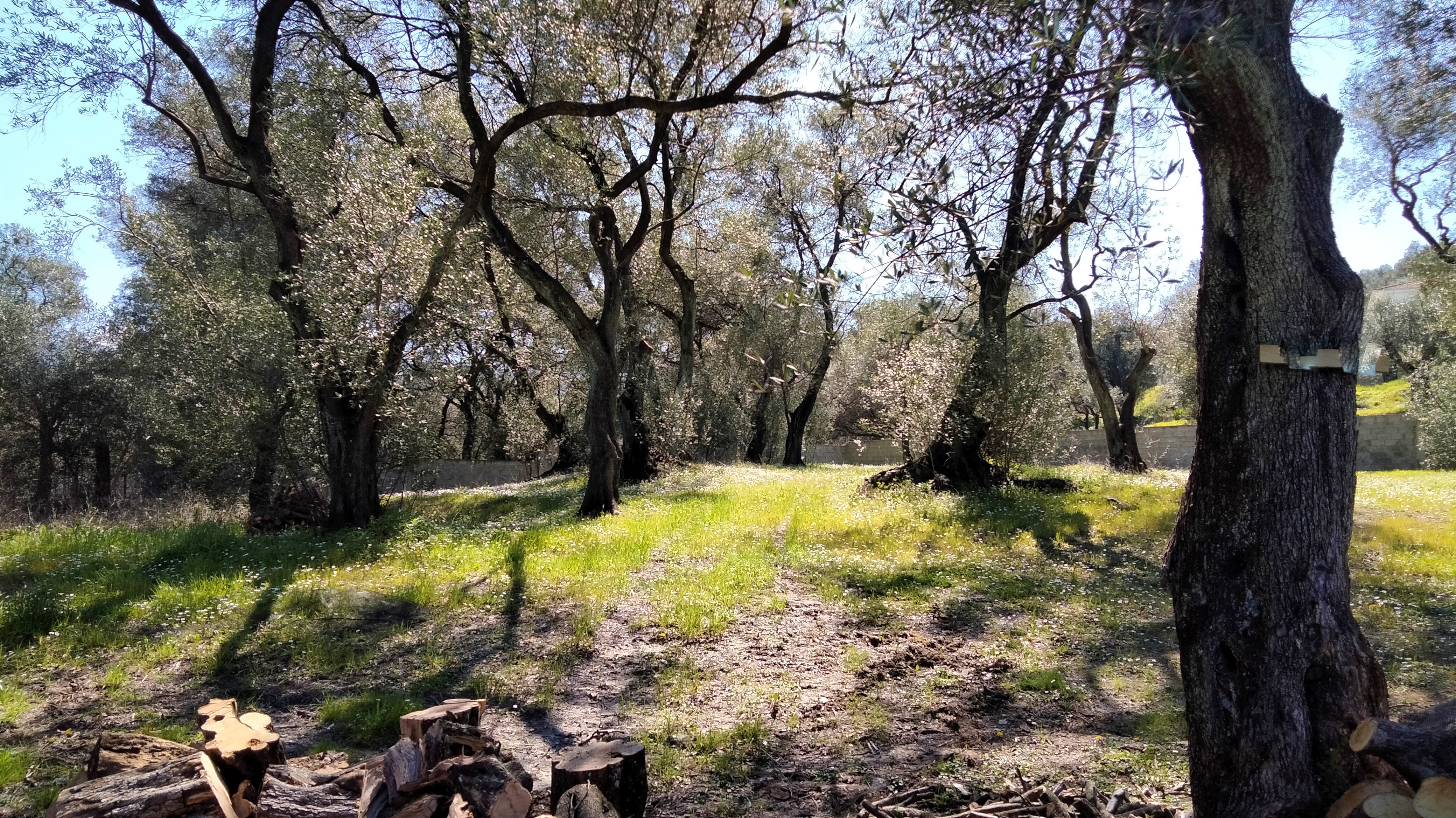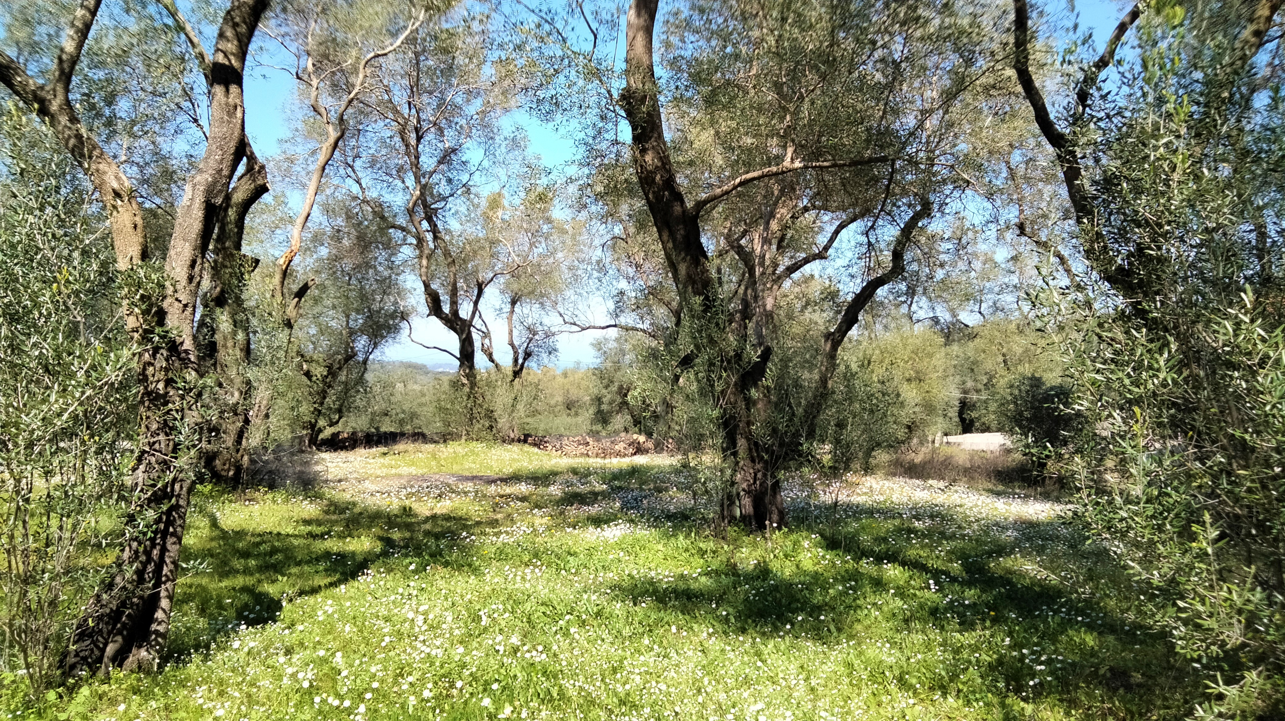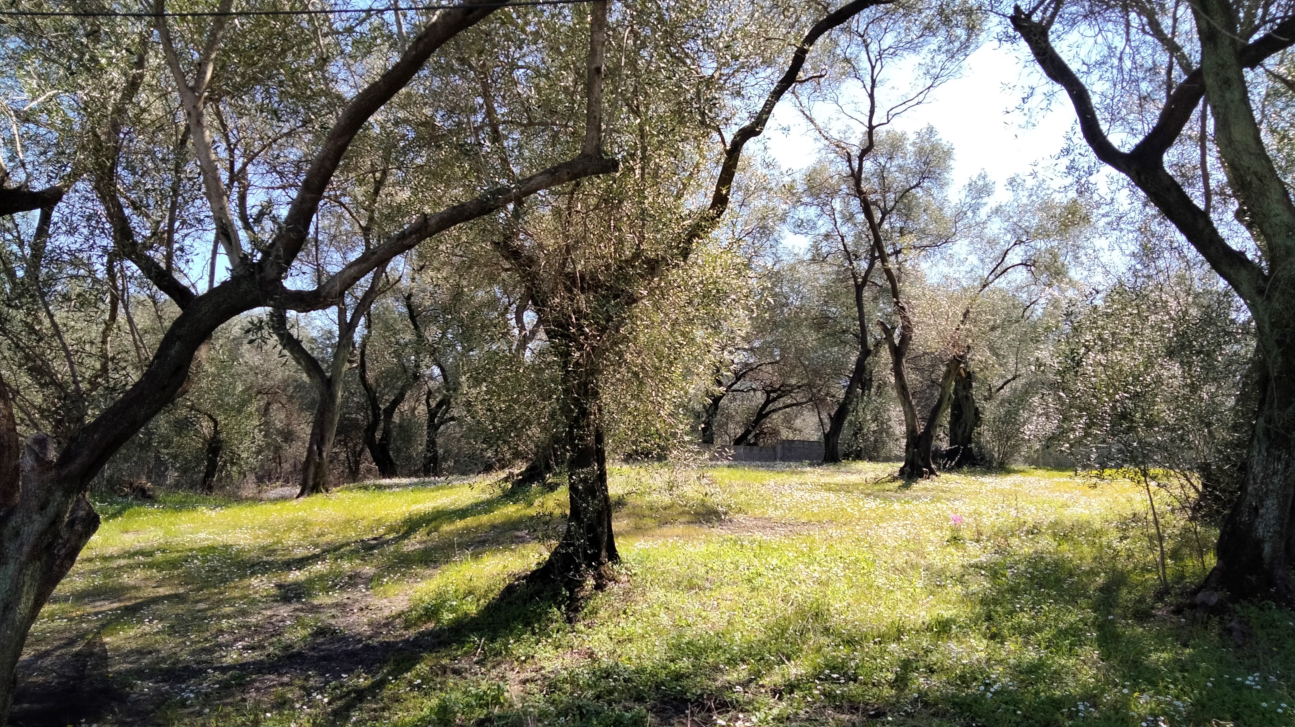The plot is flat and cleared around a dozen olive trees. There are nice views over olive groves and onto the hills of northern Corfu. There is also a view on the sea from afar.