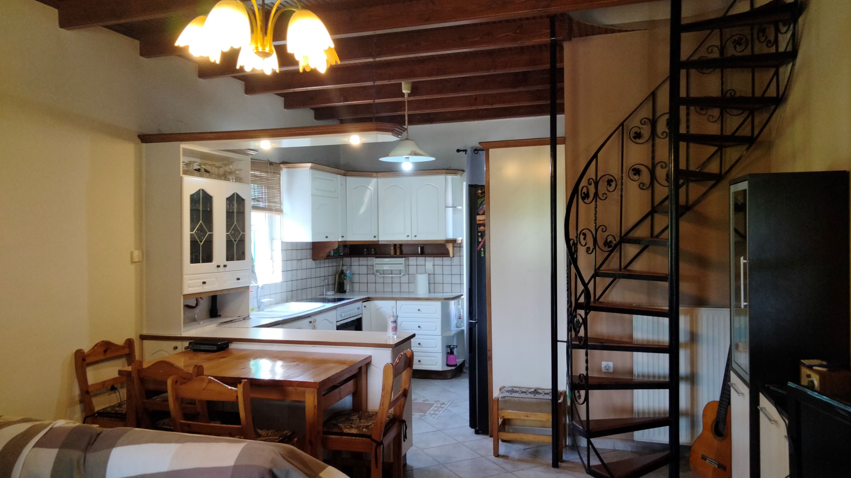 The main house is on two levels, with a living room with open plan kitchen on the ground floor as well as a corridor leading towards two bedrooms and the bathroom. A spiral staircase leads to the second floor where another bedroom has nice views towards the mountains. The house has central heating but also has a corner fireplace.