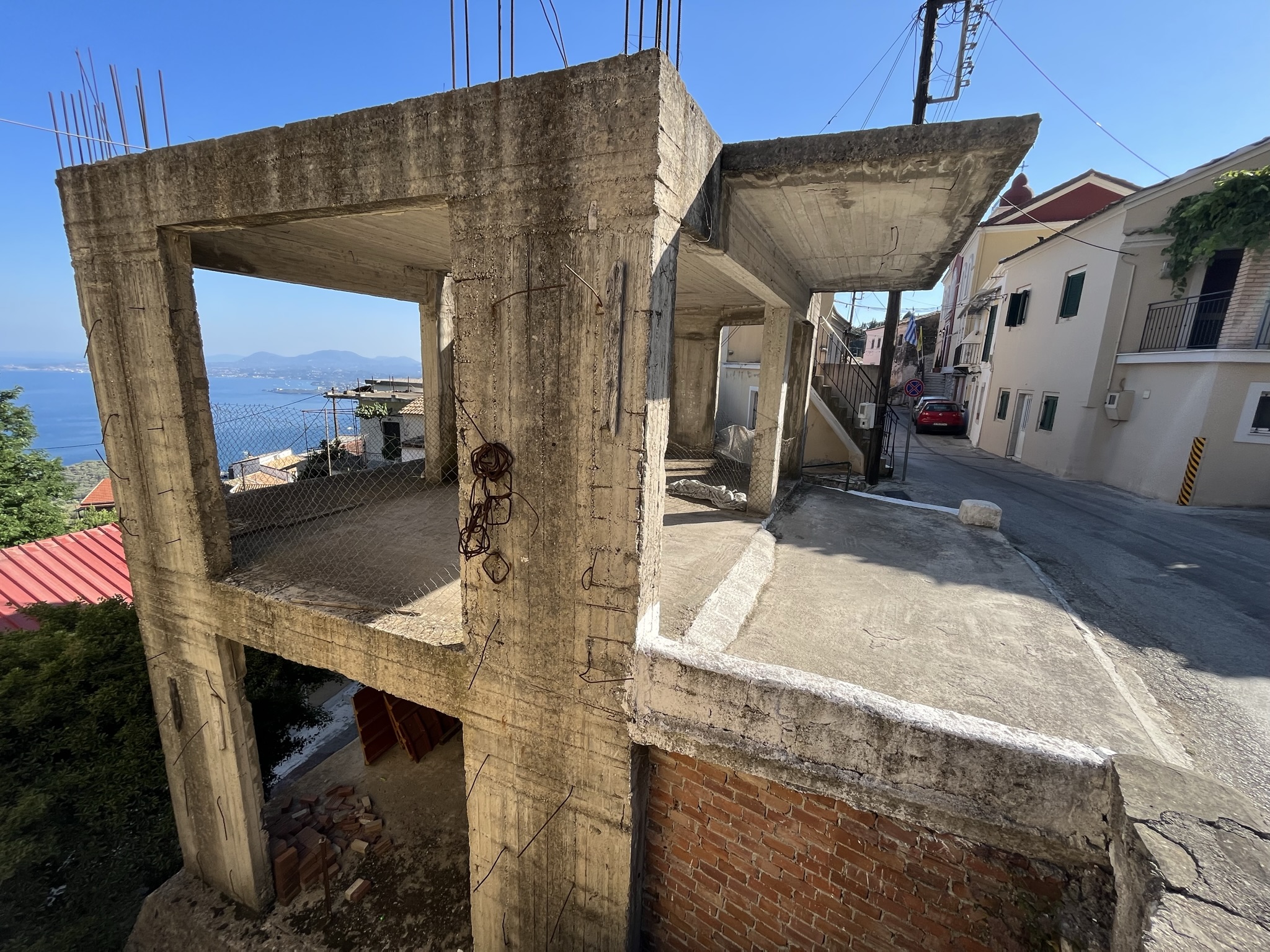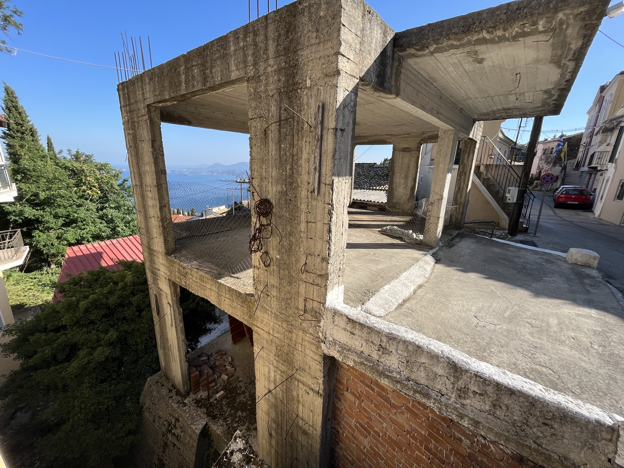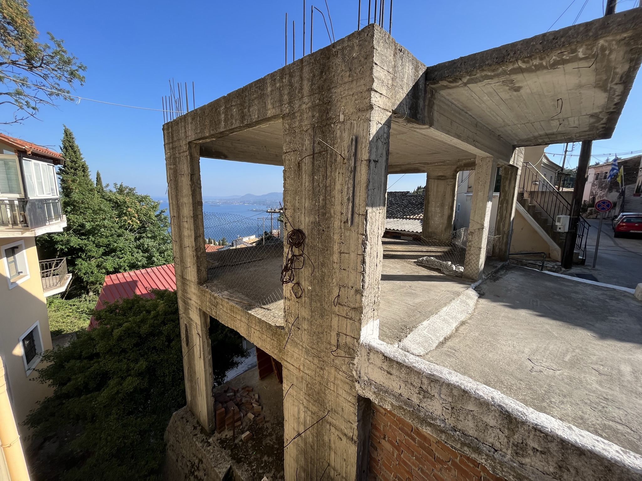 The sea views from the building are south facing and look out above the rooftops to Corfu town.