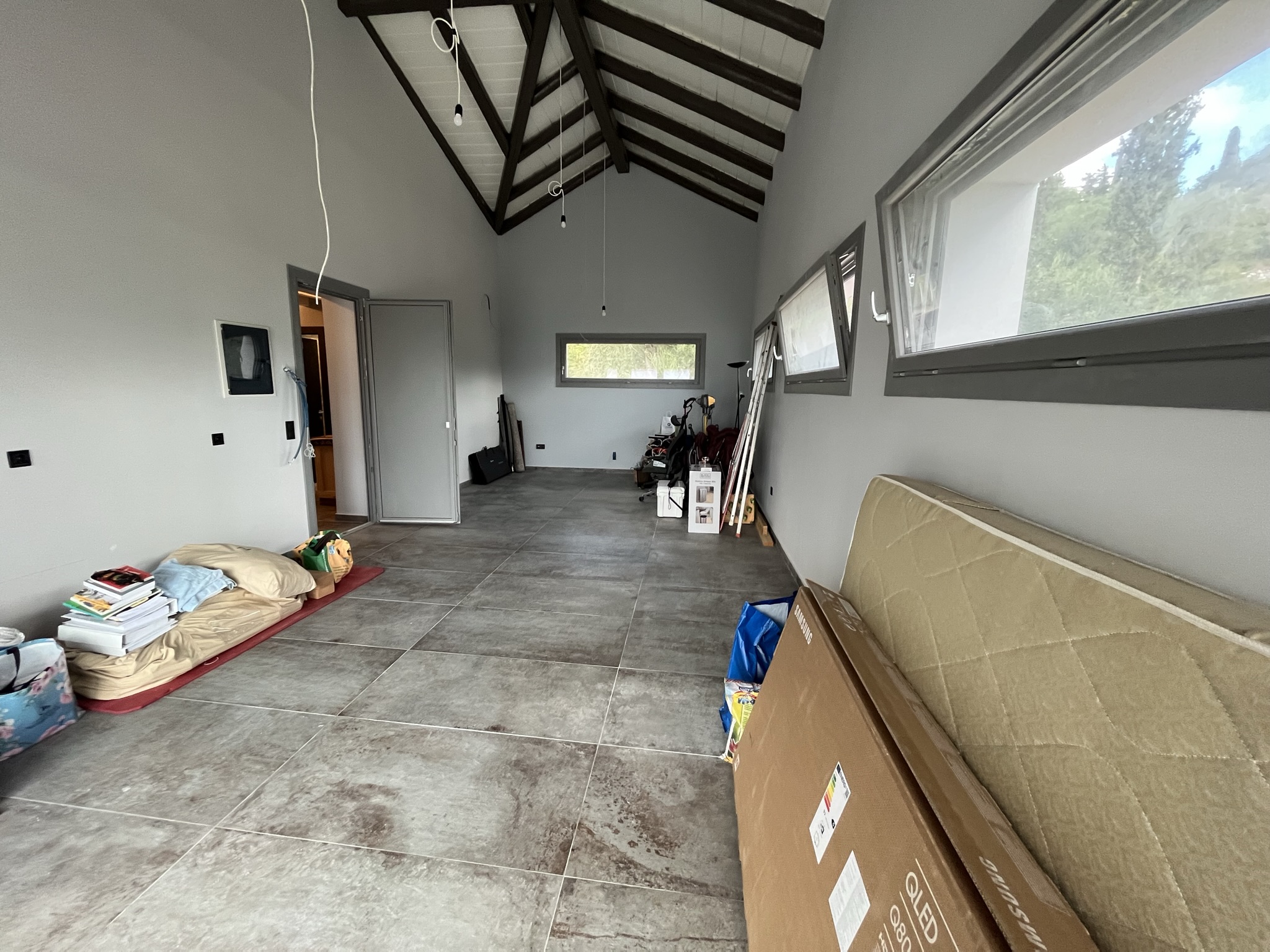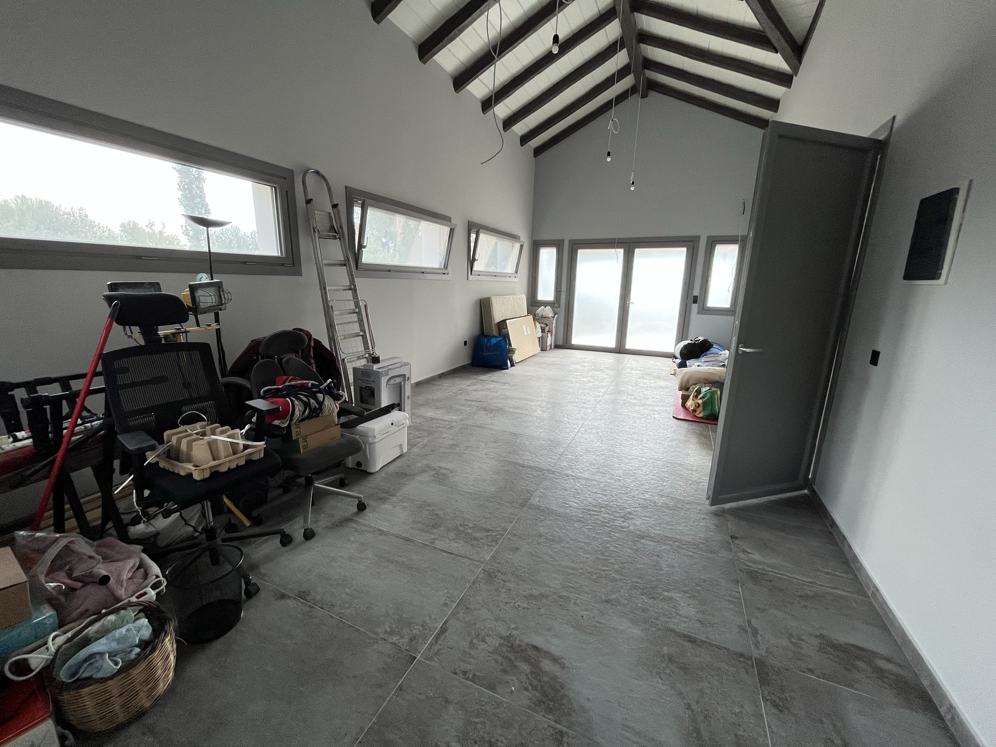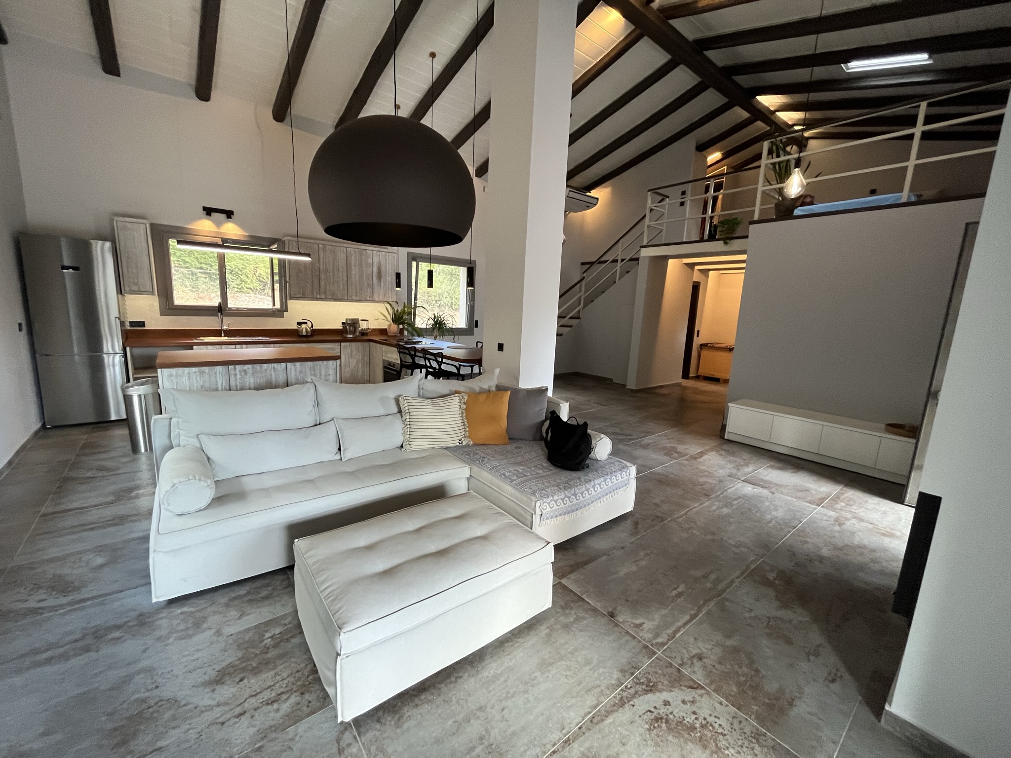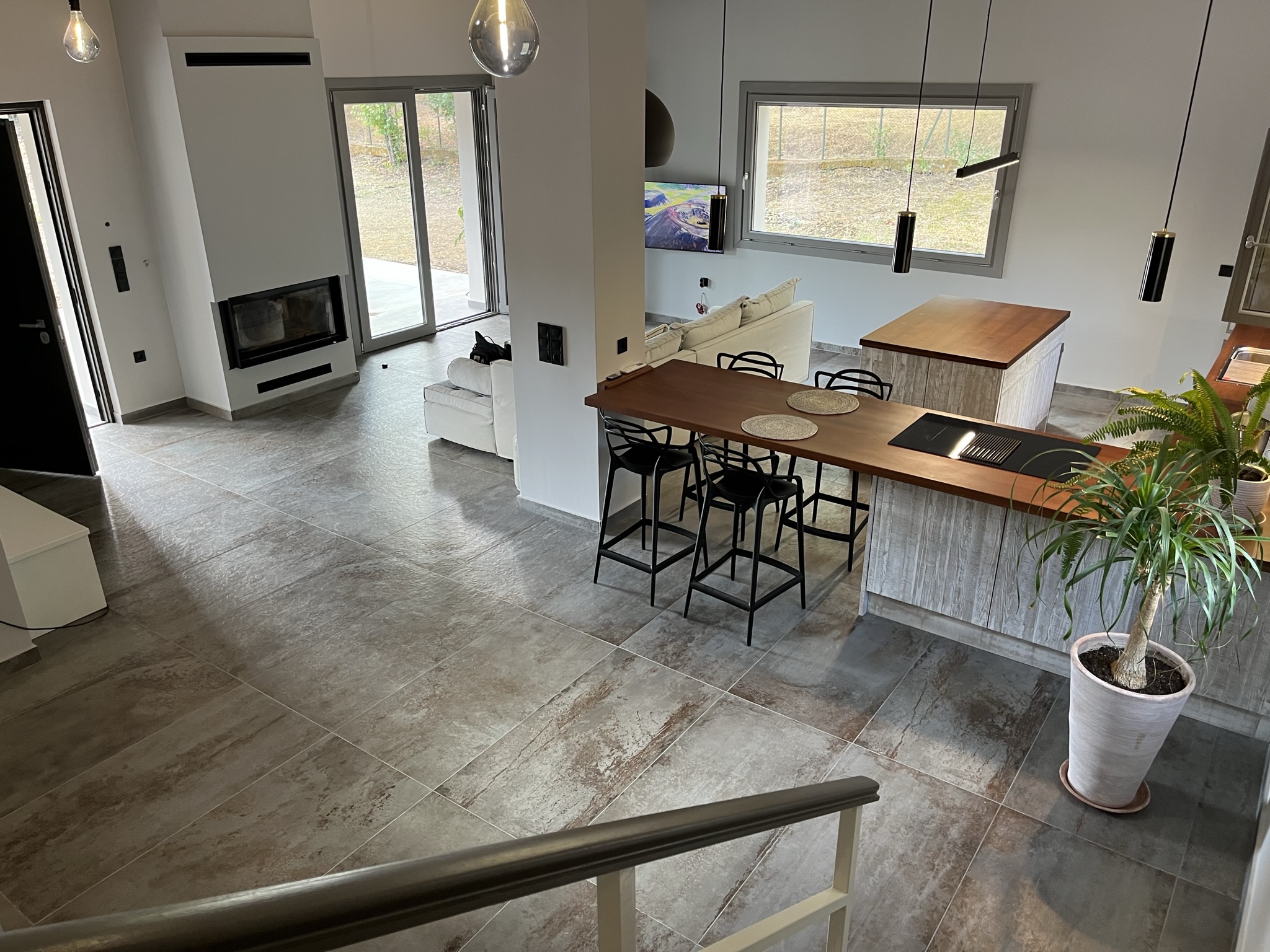 The terraced entrance leads to the open-plan living space with a modern kitchen along the back wall. In the sitting area there is a energy fireplace that has the potential to heat the entire house, thanks to the addition of top quality insulation throughout the walls. To the right of this area there is a short hallway that leads to a big bathroom with jacuzzi and a large bedroom which could easily be divided into two, if one wished. There is also an extra wc/shower room.