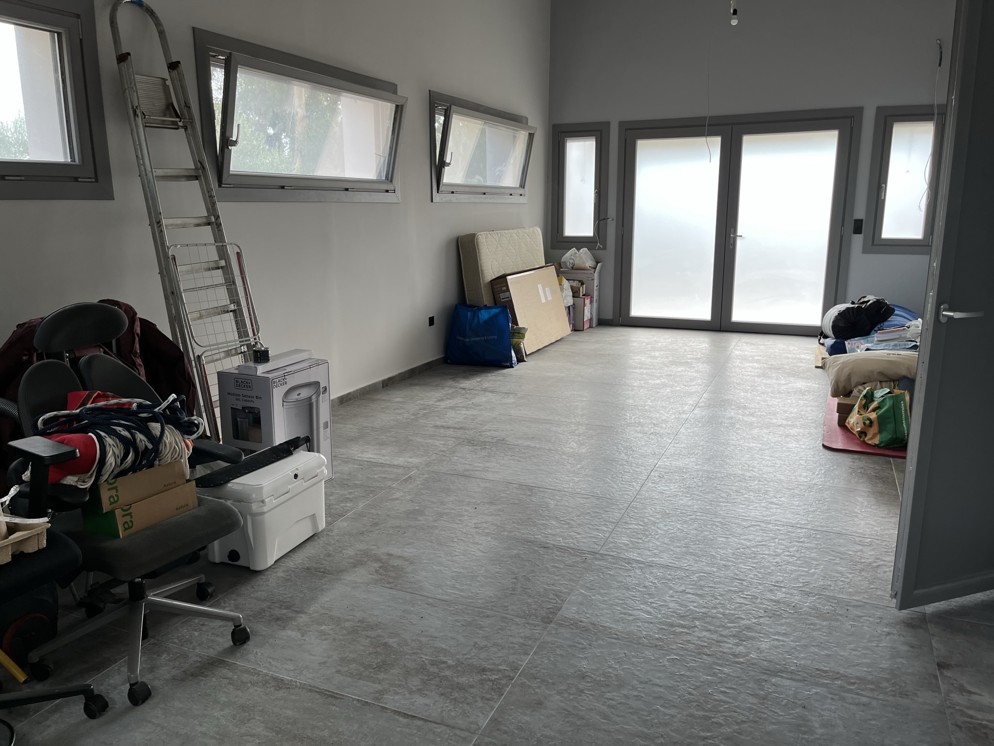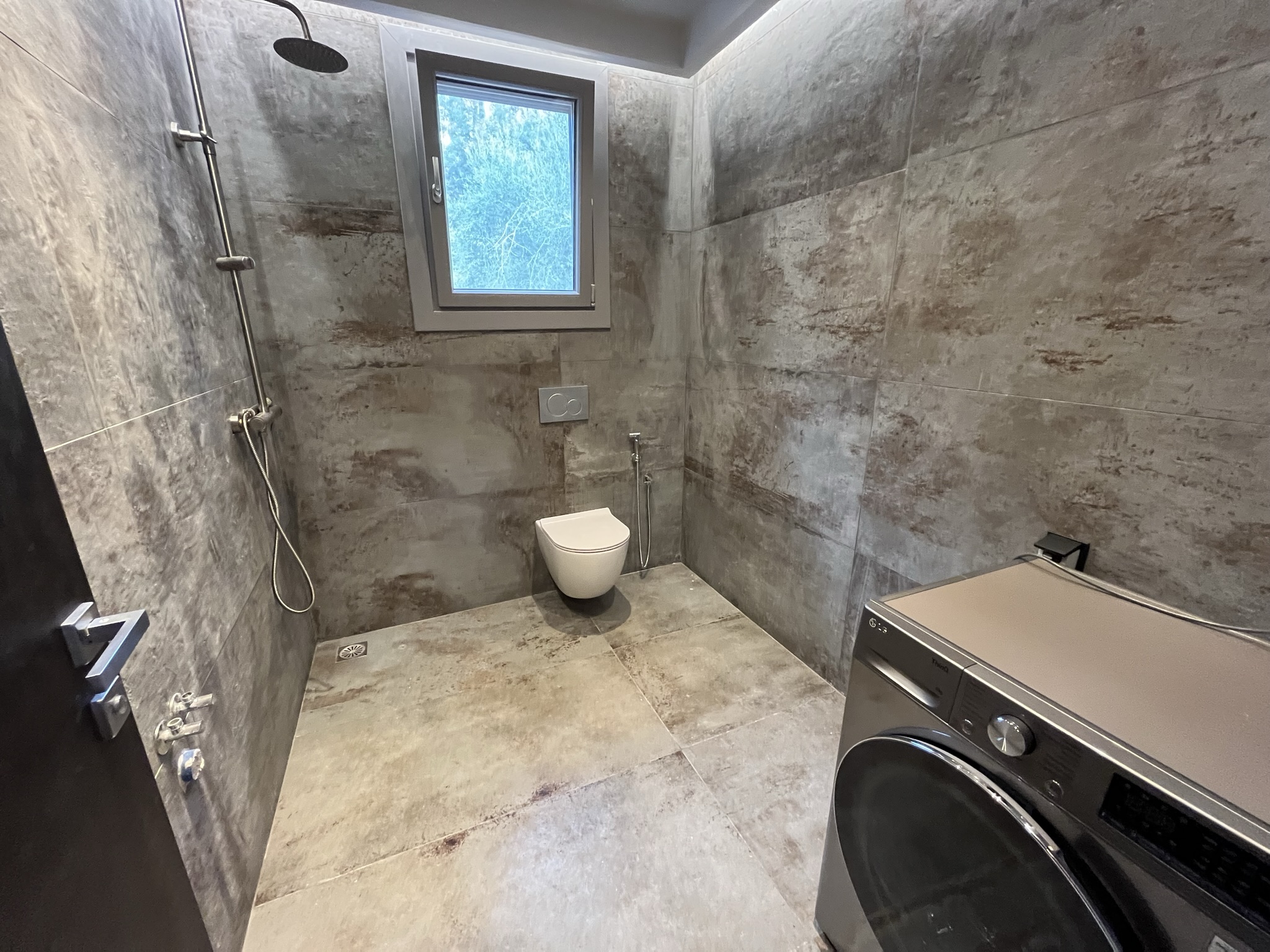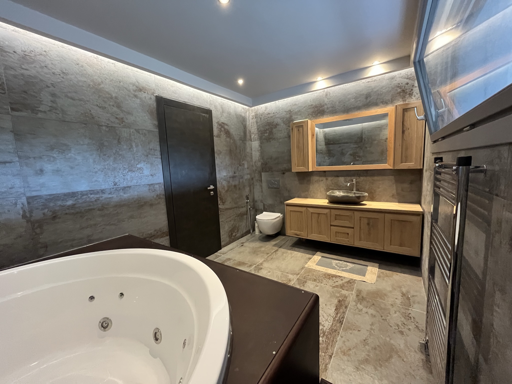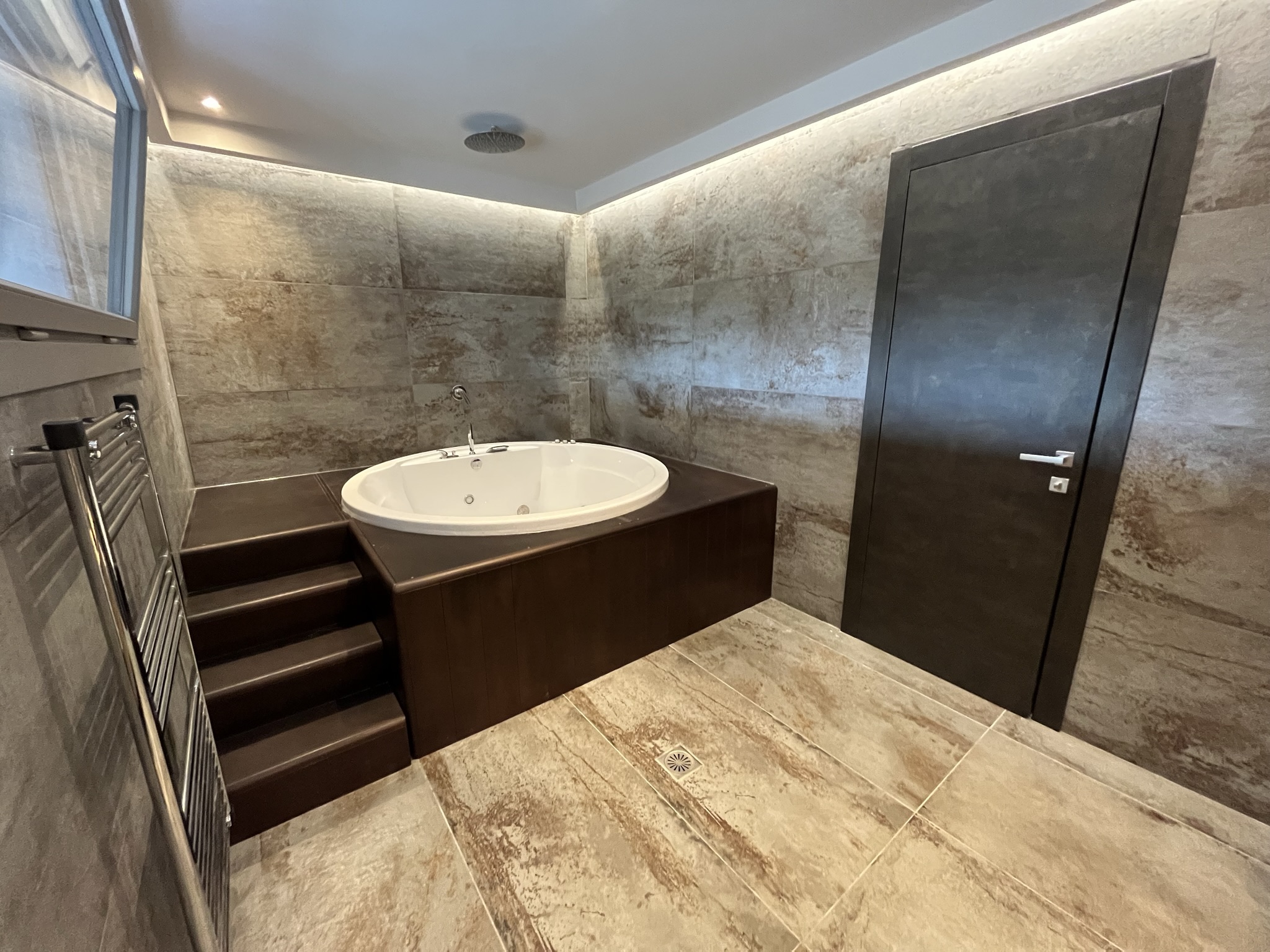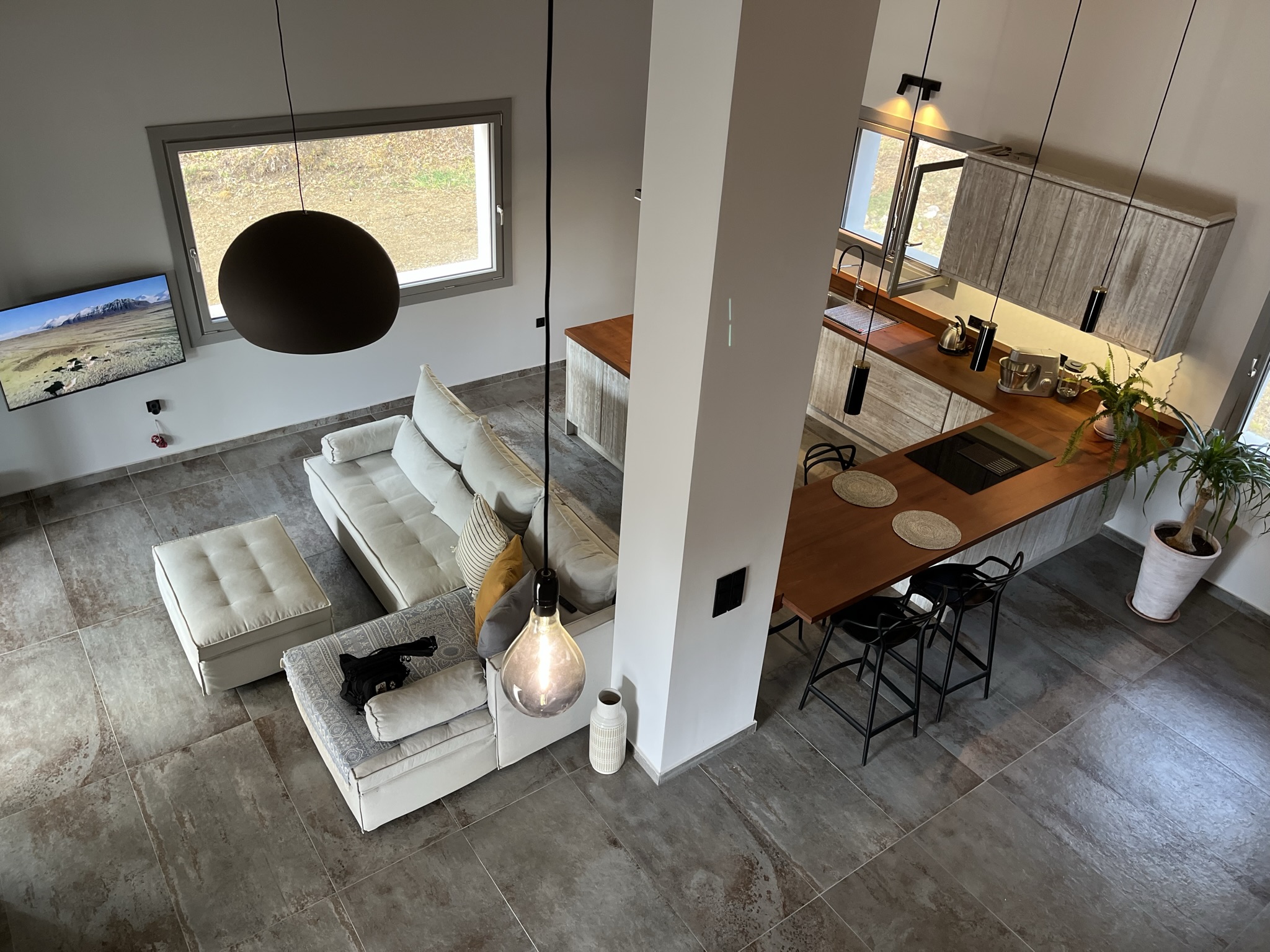 The terraced entrance leads to the open-plan living space with a modern kitchen along the back wall. In the sitting area there is a energy fireplace that has the potential to heat the entire house, thanks to the addition of top quality insulation throughout the walls. To the right of this area there is a short hallway that leads to a big bathroom with jacuzzi and a large bedroom which could easily be divided into two, if one wished. There is also an extra wc/shower room.