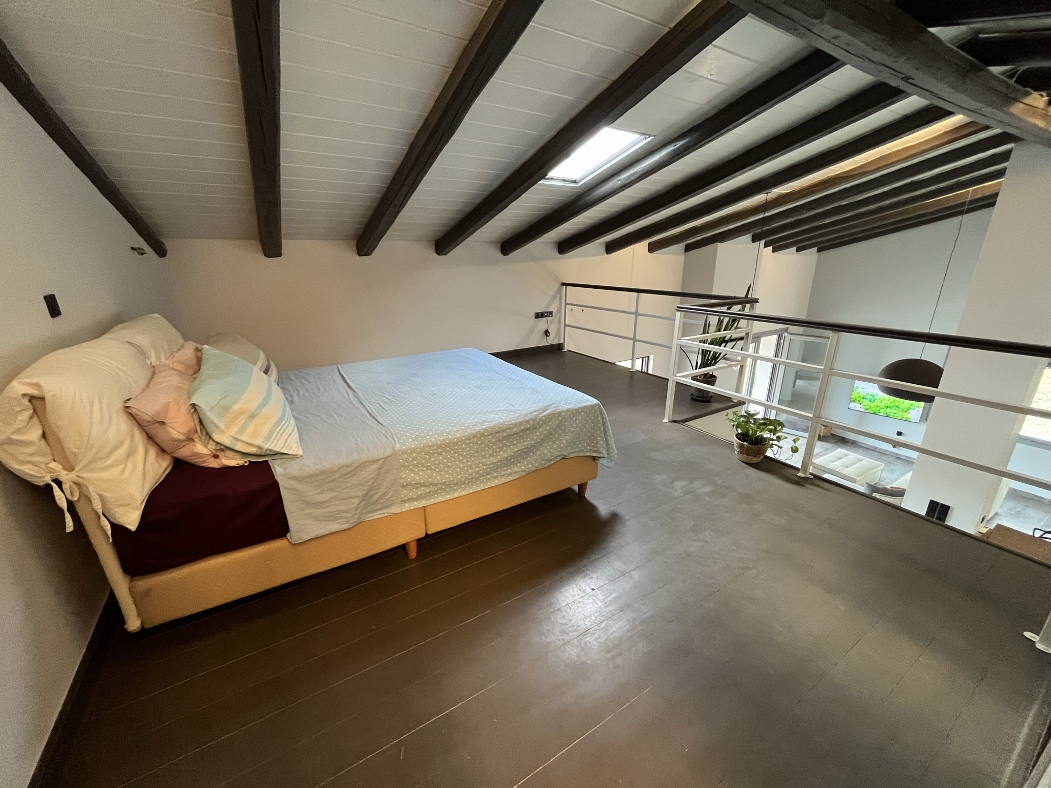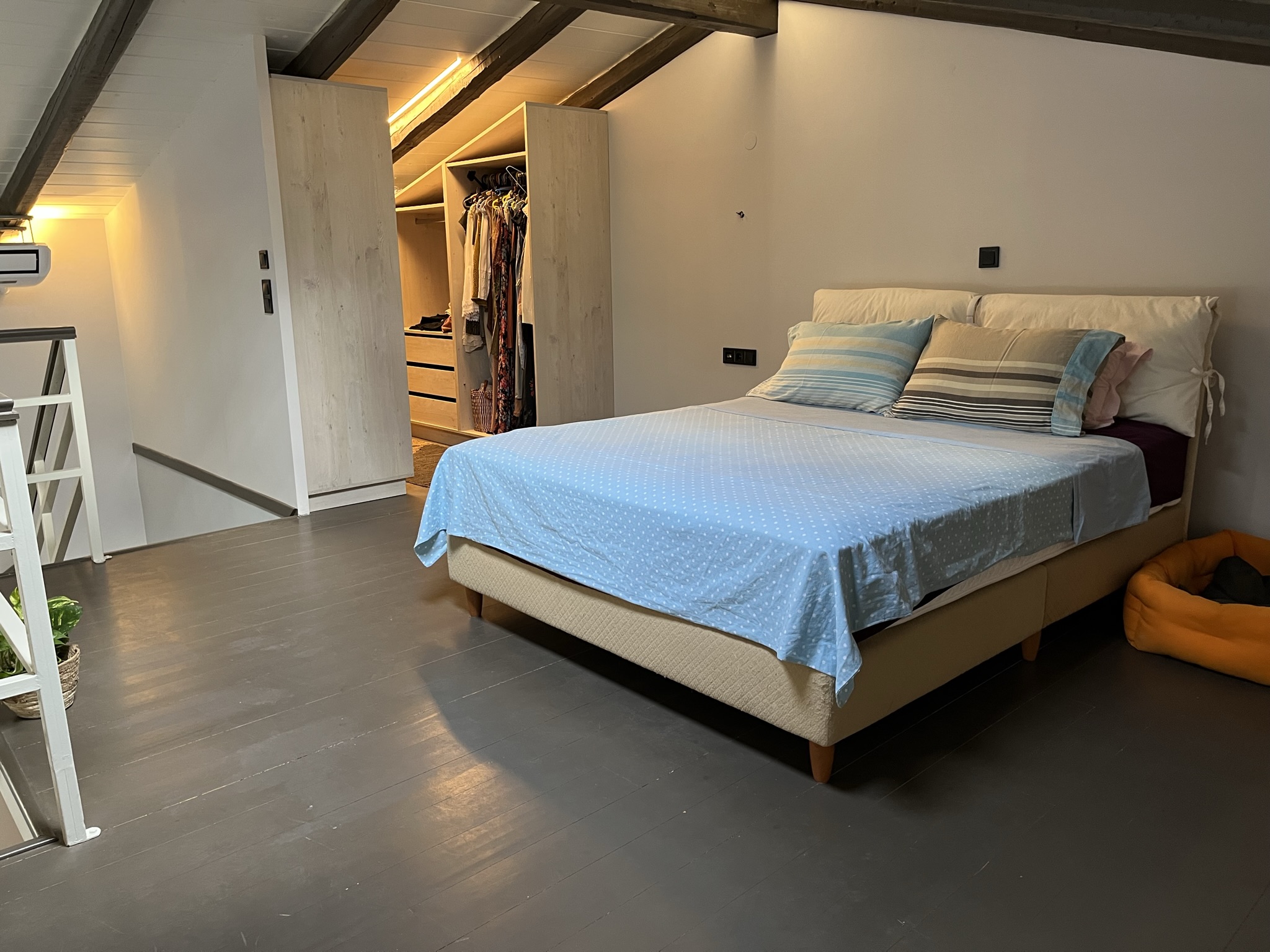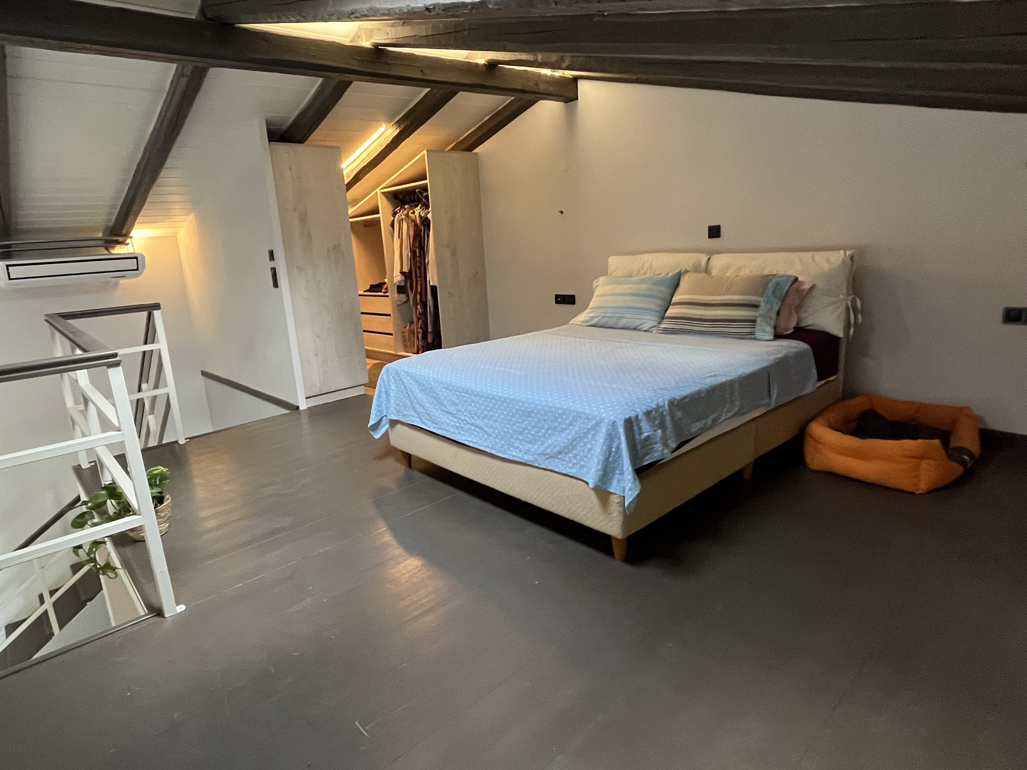 Another bedroom in a loft concept area is accessed by a stylish staircase and looks down onto the living area. This bedroom has plenty of storage space in the open, walk-in closet.