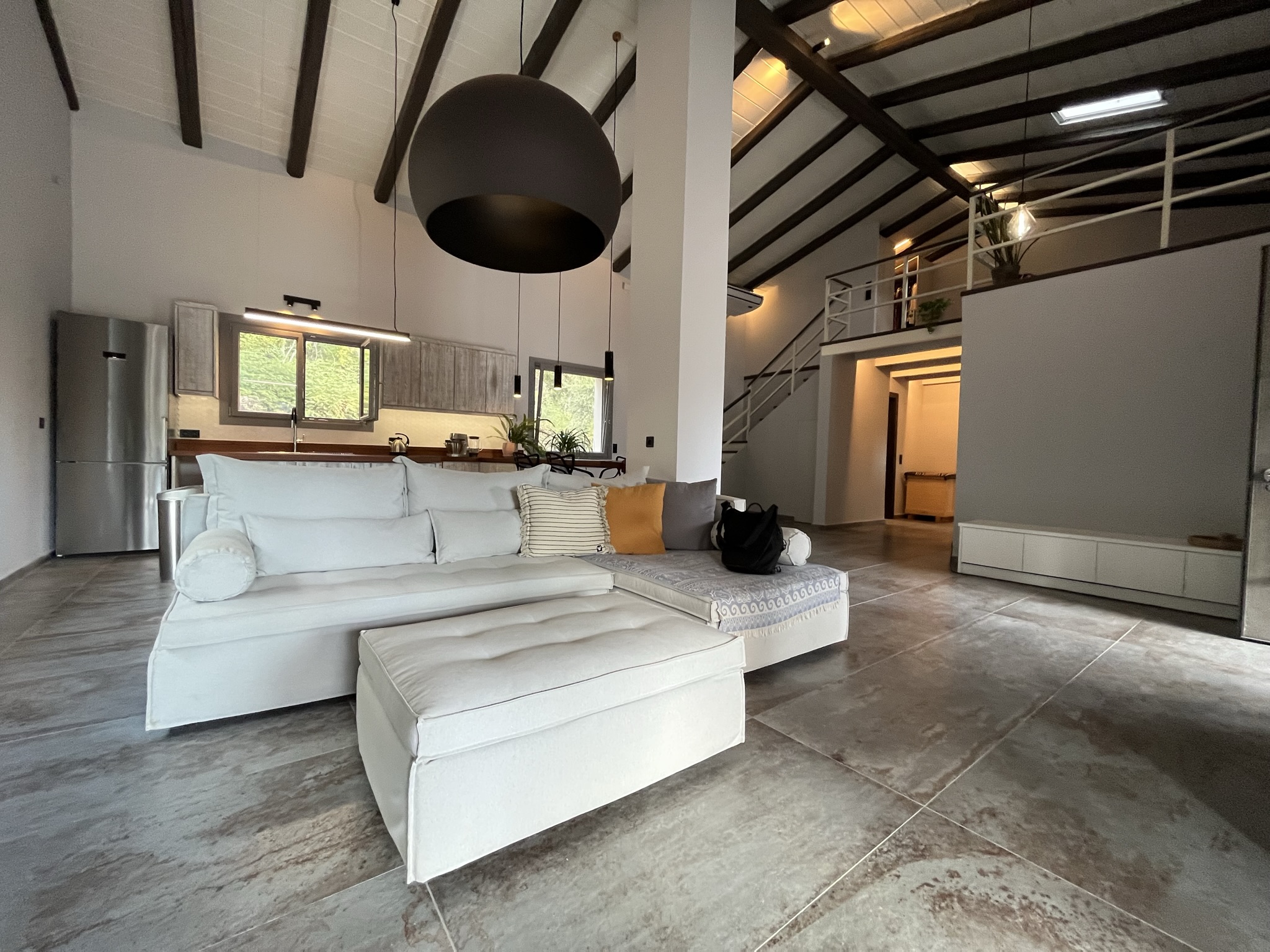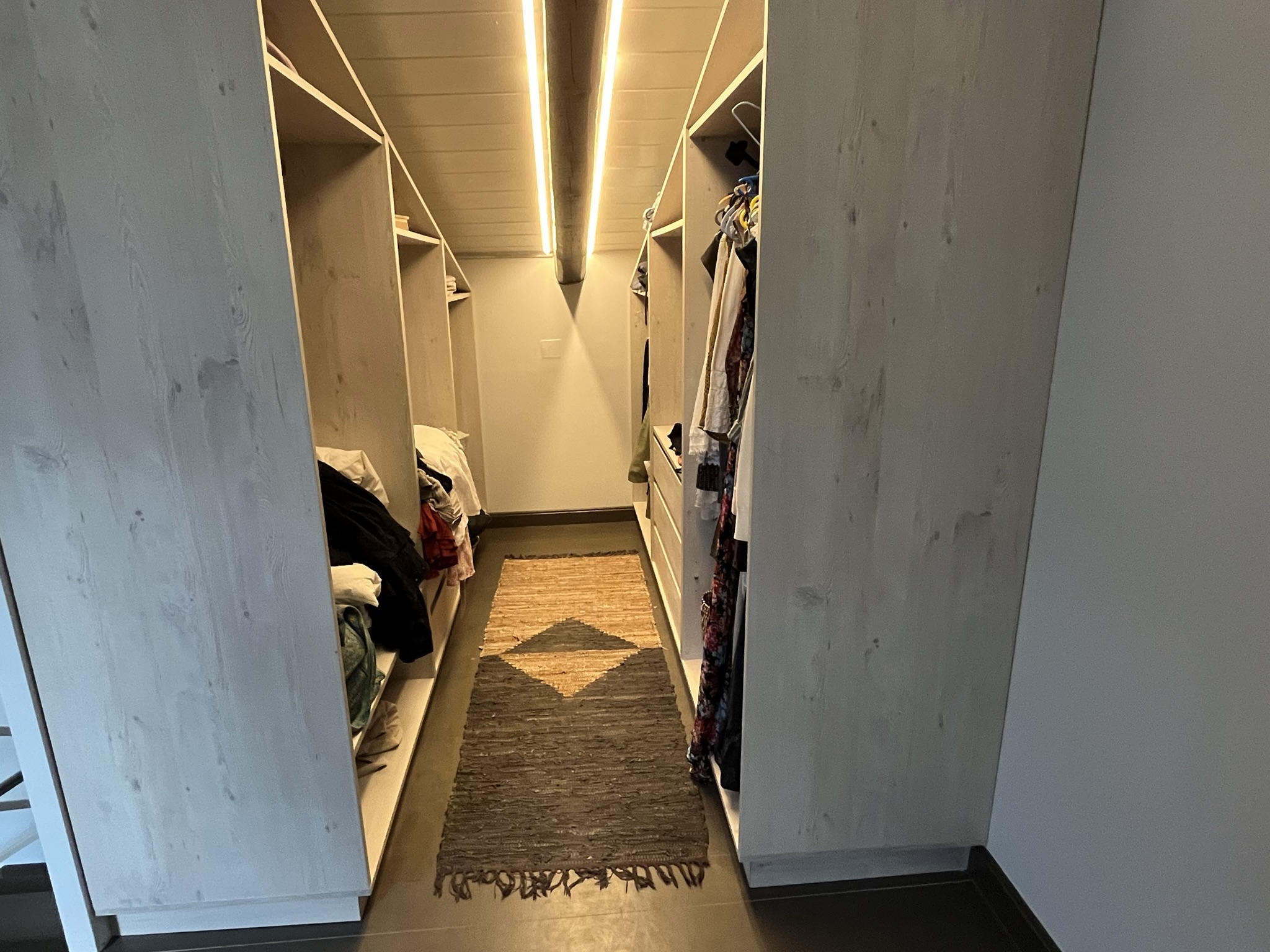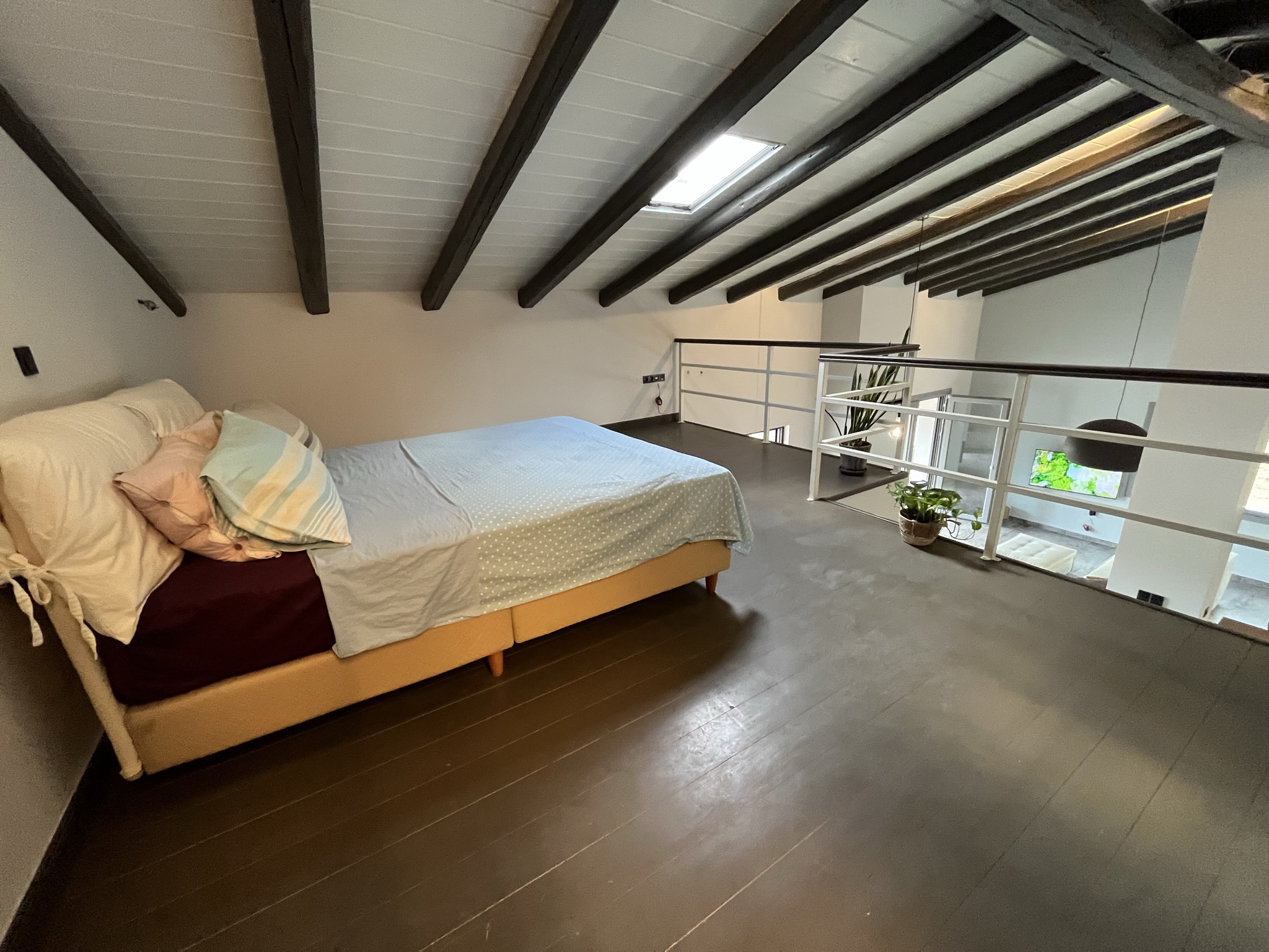 Another bedroom in a loft concept area is accessed by a stylish staircase and looks down onto the living area. This bedroom has plenty of storage space in the open, walk-in closet.