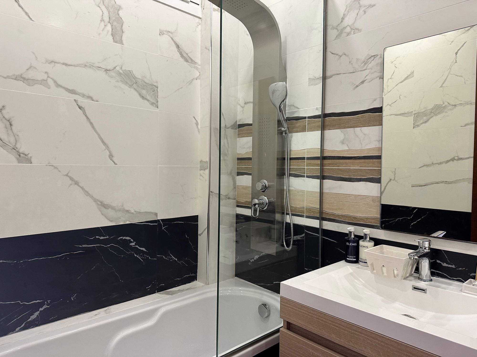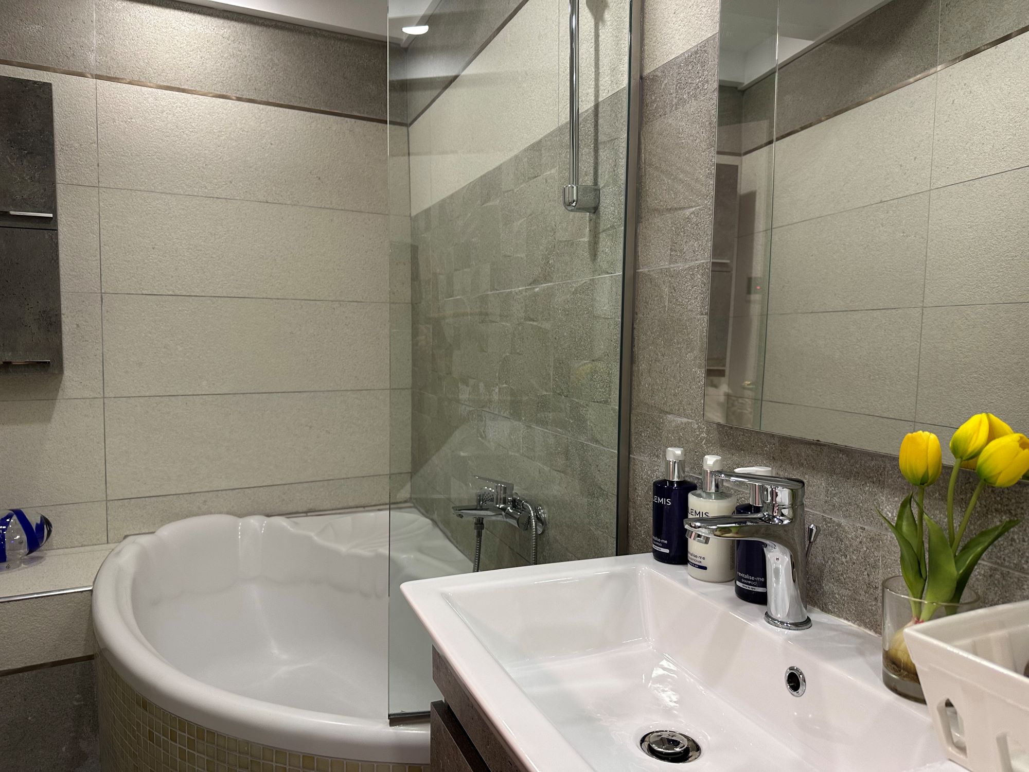 Starting from the ground floor, there is a modern apartment with open plan kitchen/living room, 2 double bedrooms and 2 shower rooms. This is linked by an internal door to another similar sized apartment, which has a separate entrance from the other side. The whole of the ground floor can accommodate 8 guests.