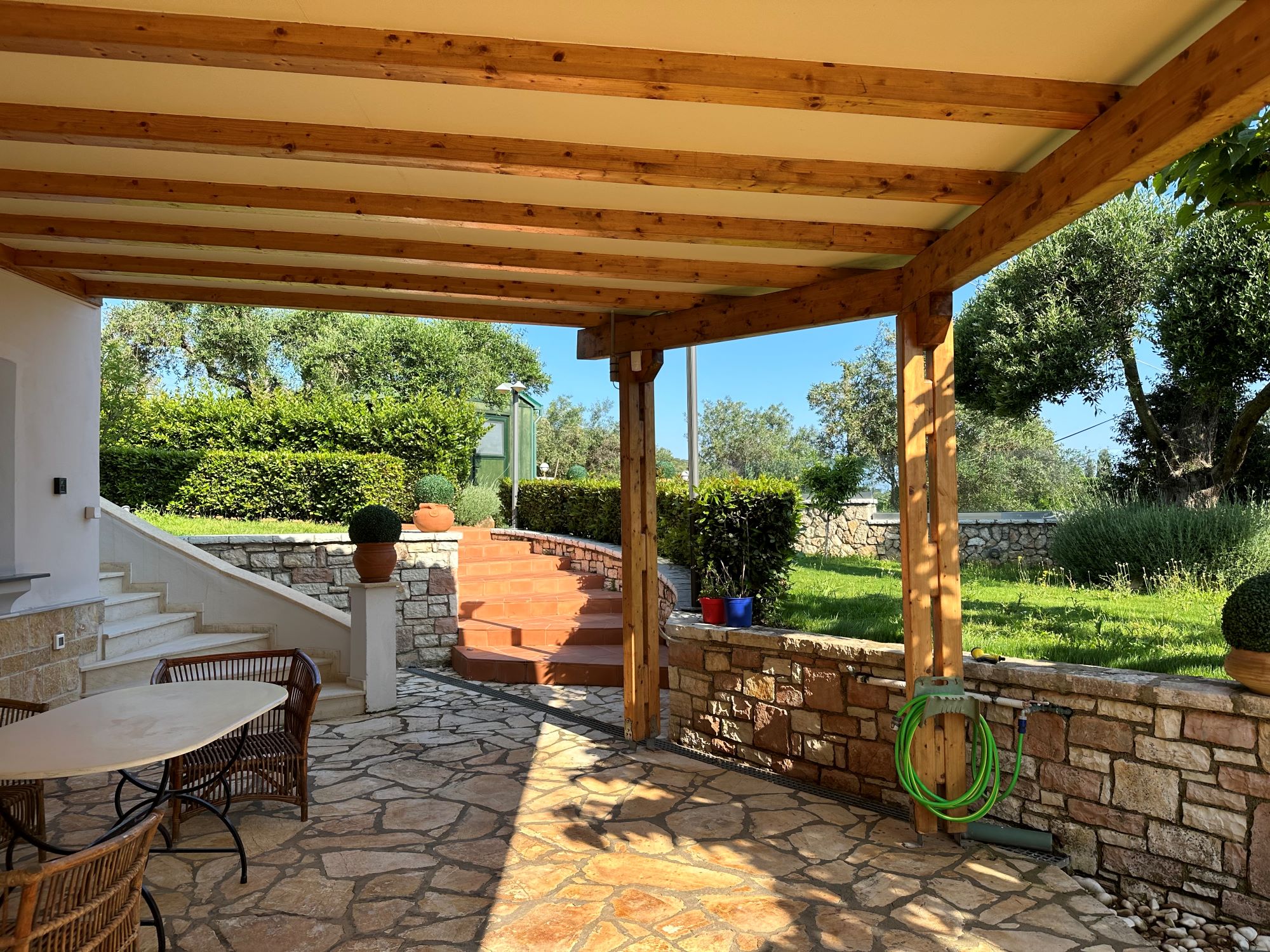 Outside the immaculate grounds are mainly laid to lawn and have been carefully landscaped. There is a water collection system and an automatic watering system.