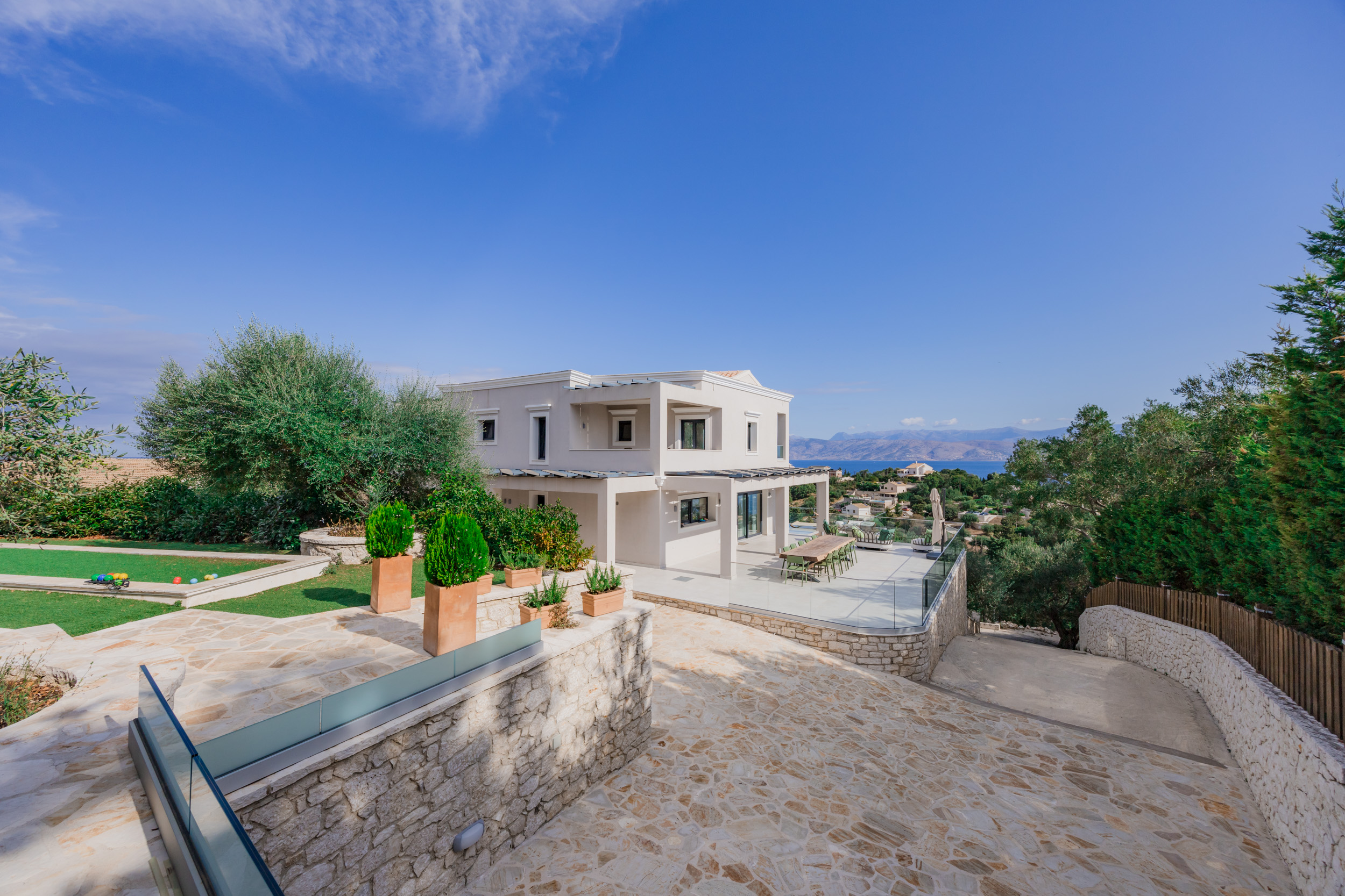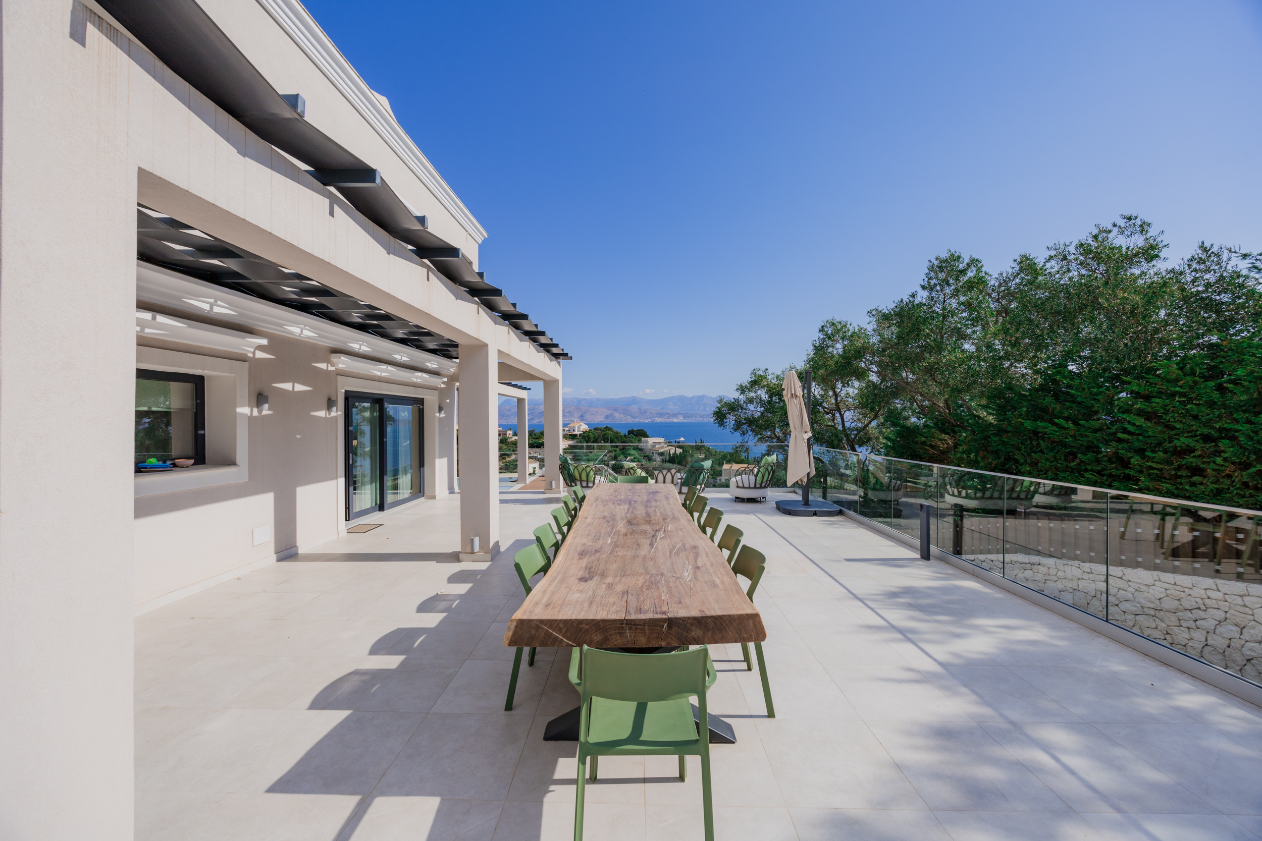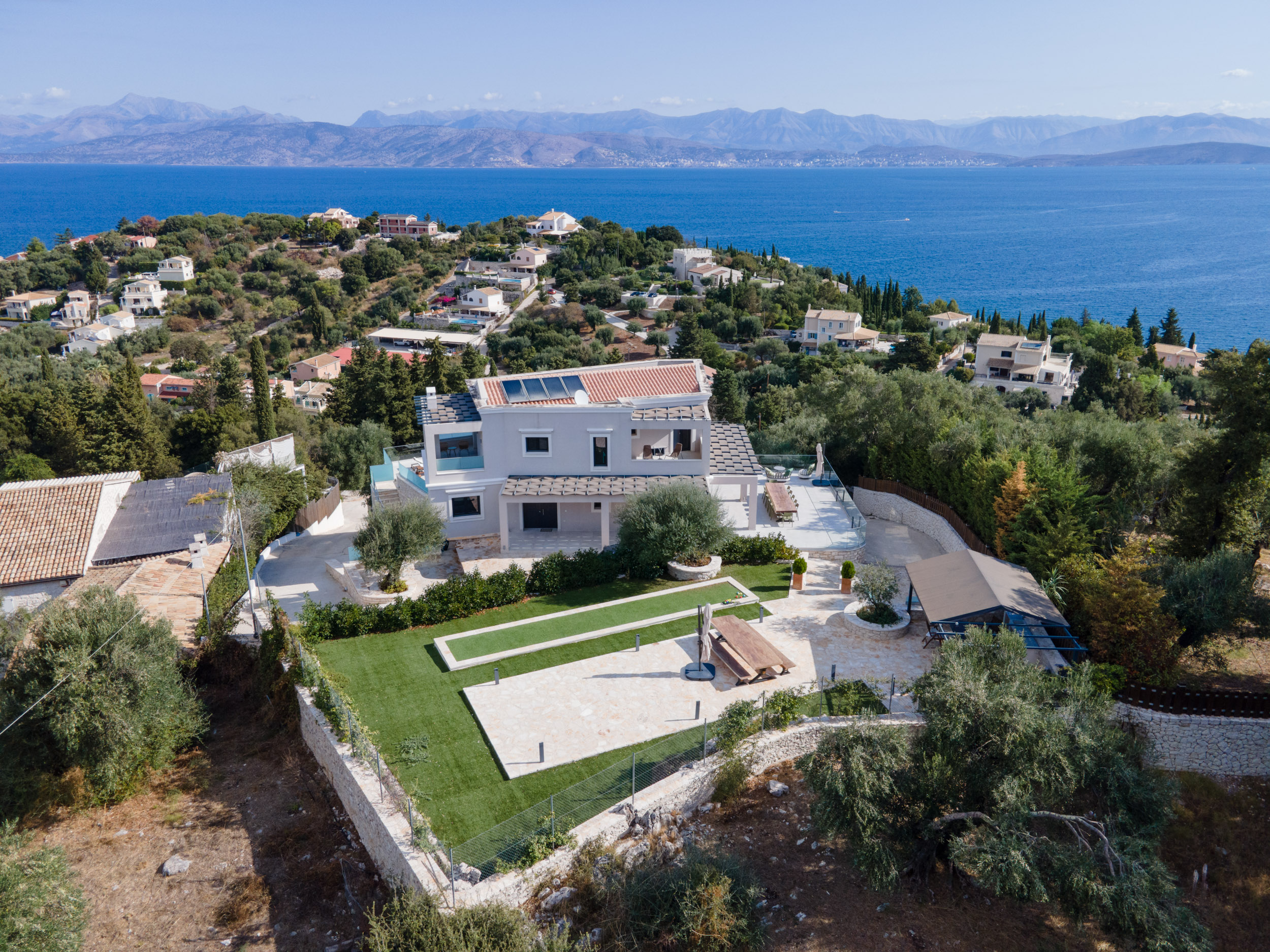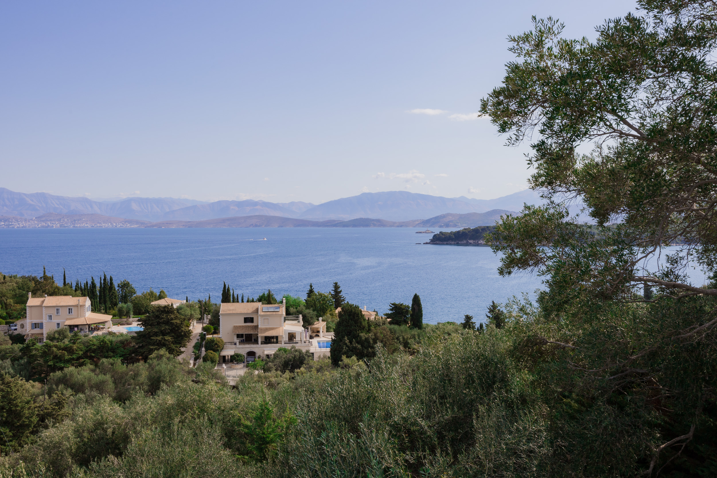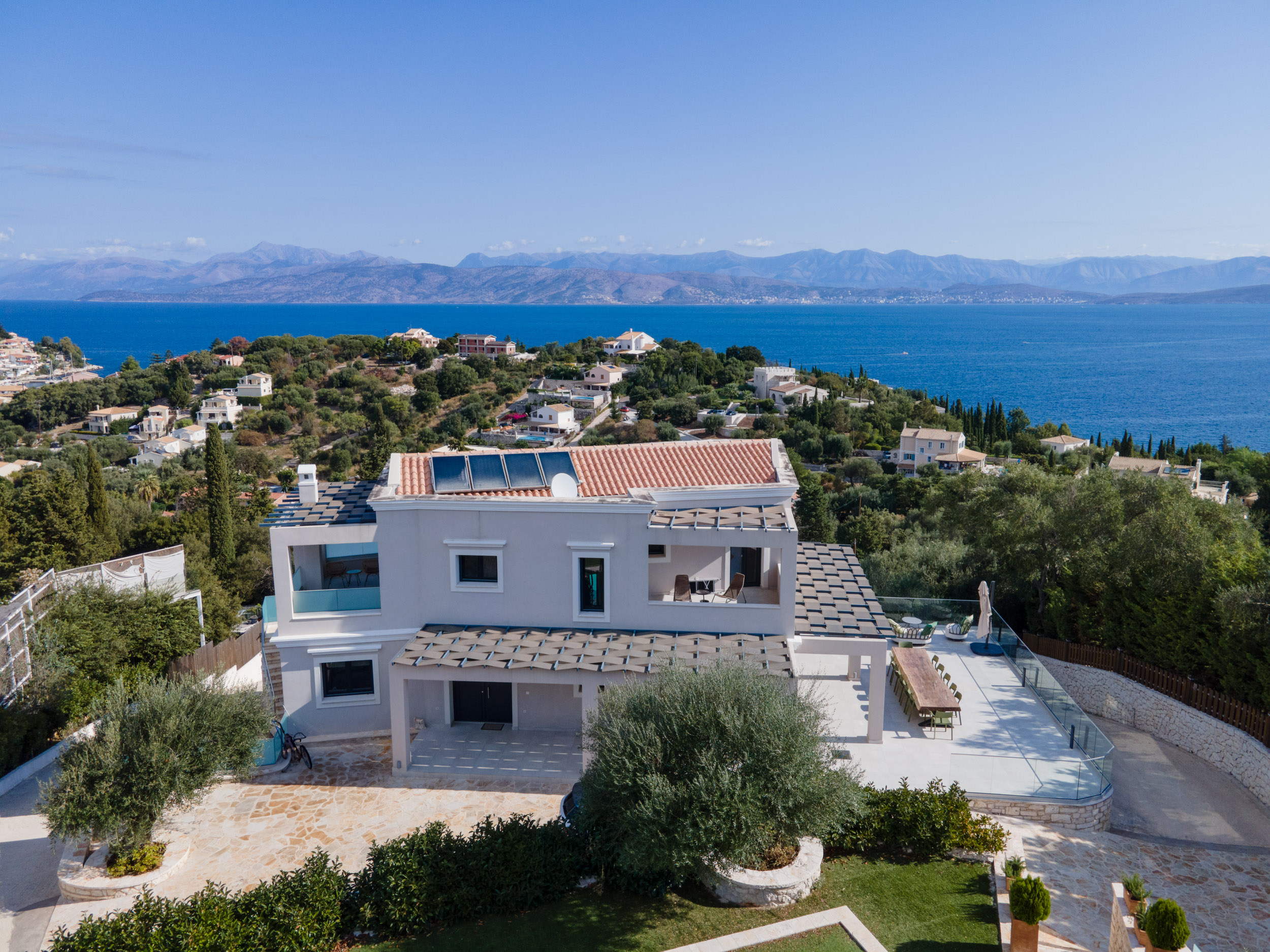 Villa Escape provides generous spacious interiors, leading out onto wide terraces with panoramic views across the bay to Kassiopi and the mountains of Albania in the background.