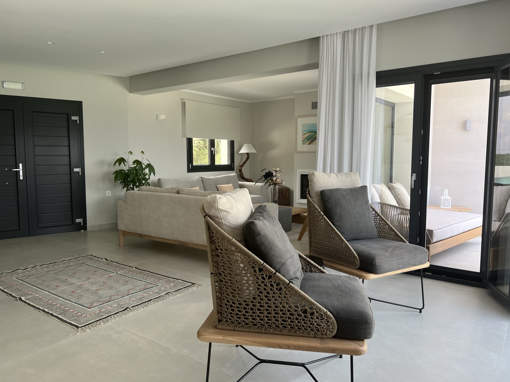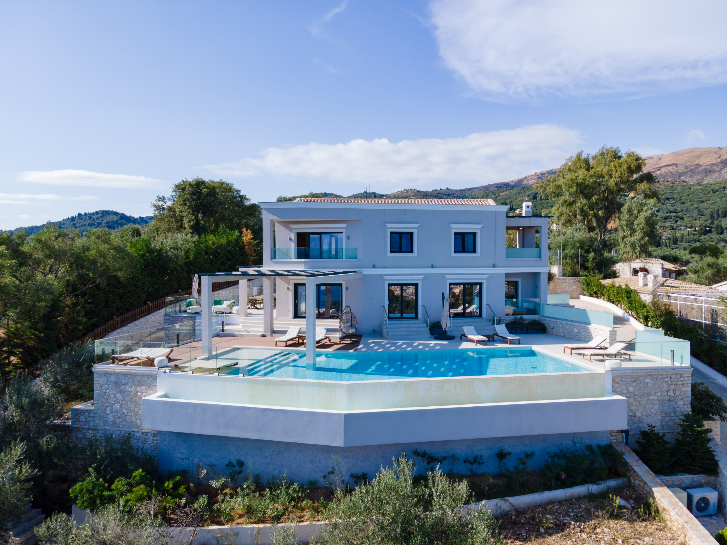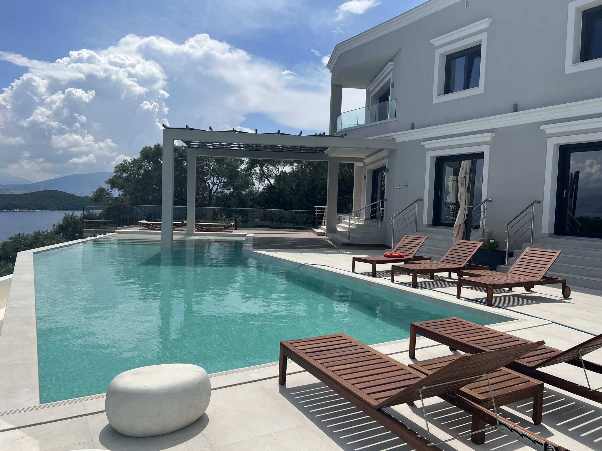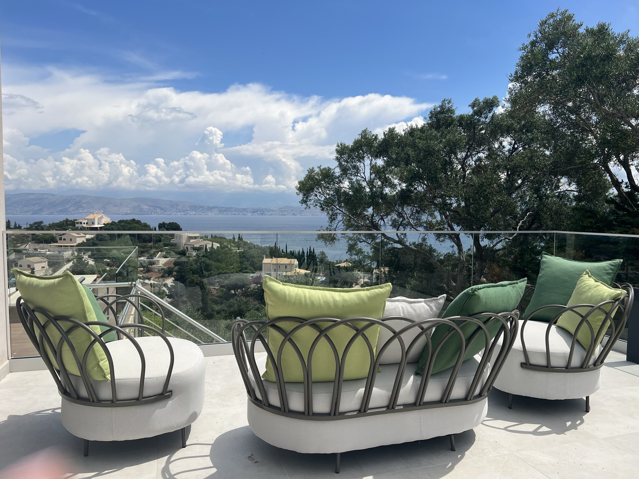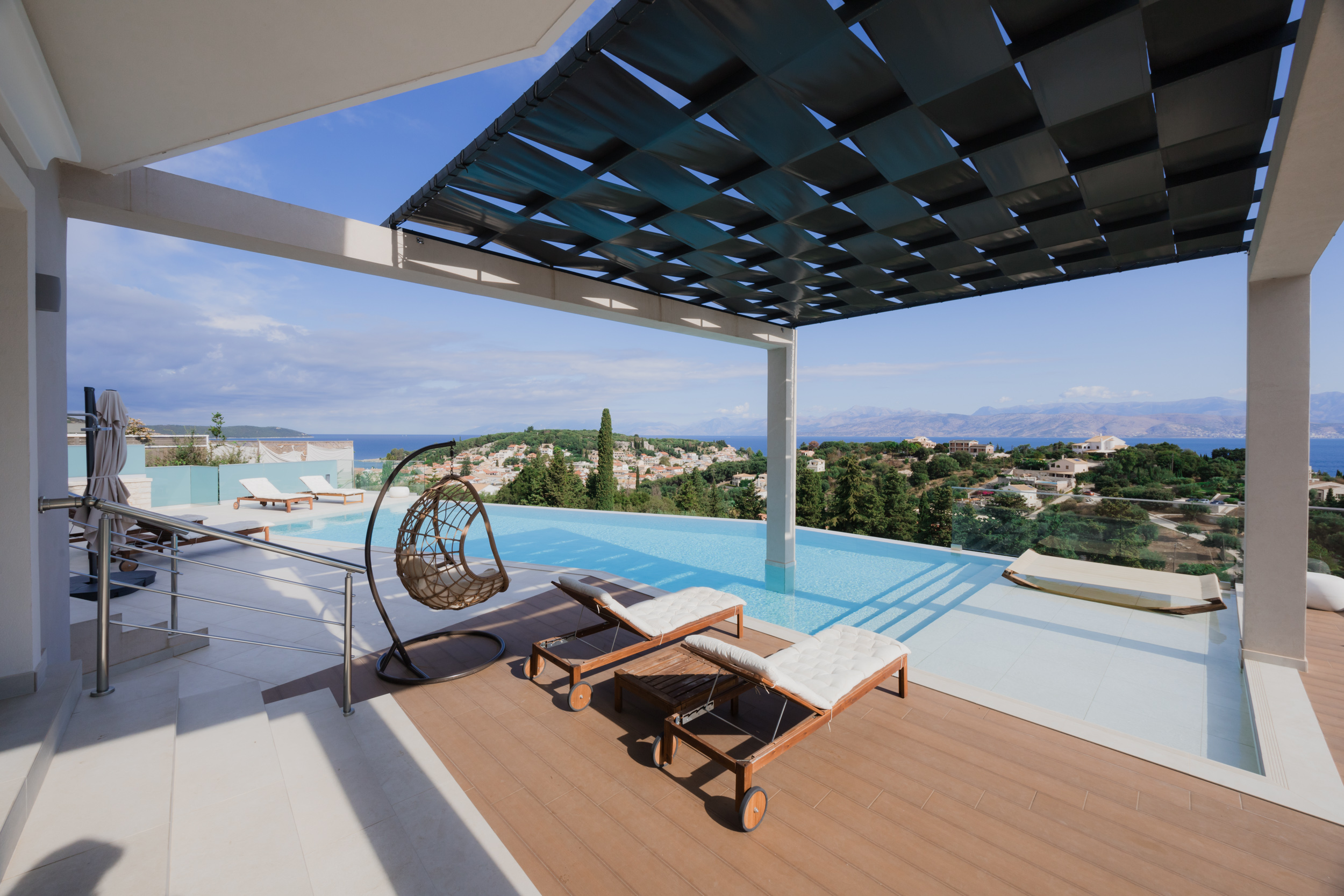 Villa Escape provides generous spacious interiors, leading out onto wide terraces with panoramic views across the bay to Kassiopi and the mountains of Albania in the background.