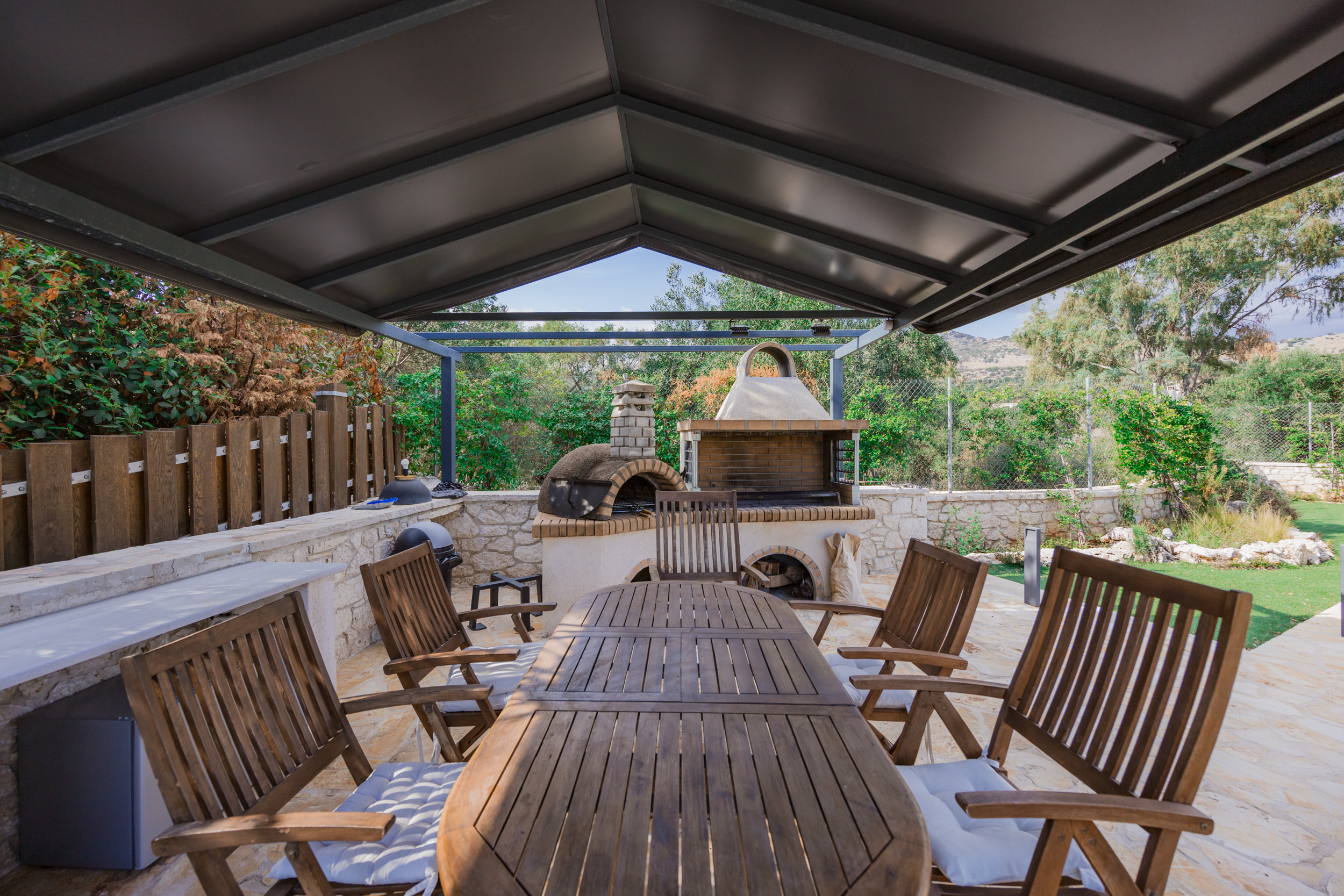 Outside has been designed for relaxation and privacy, with a huge swimming pool, surrounded by sunbathing terraces and shady areas. An outside dining area is conveniently placed next to the kitchen, and a few steps lead up to another dining area with an outside kitchen and barbeque.