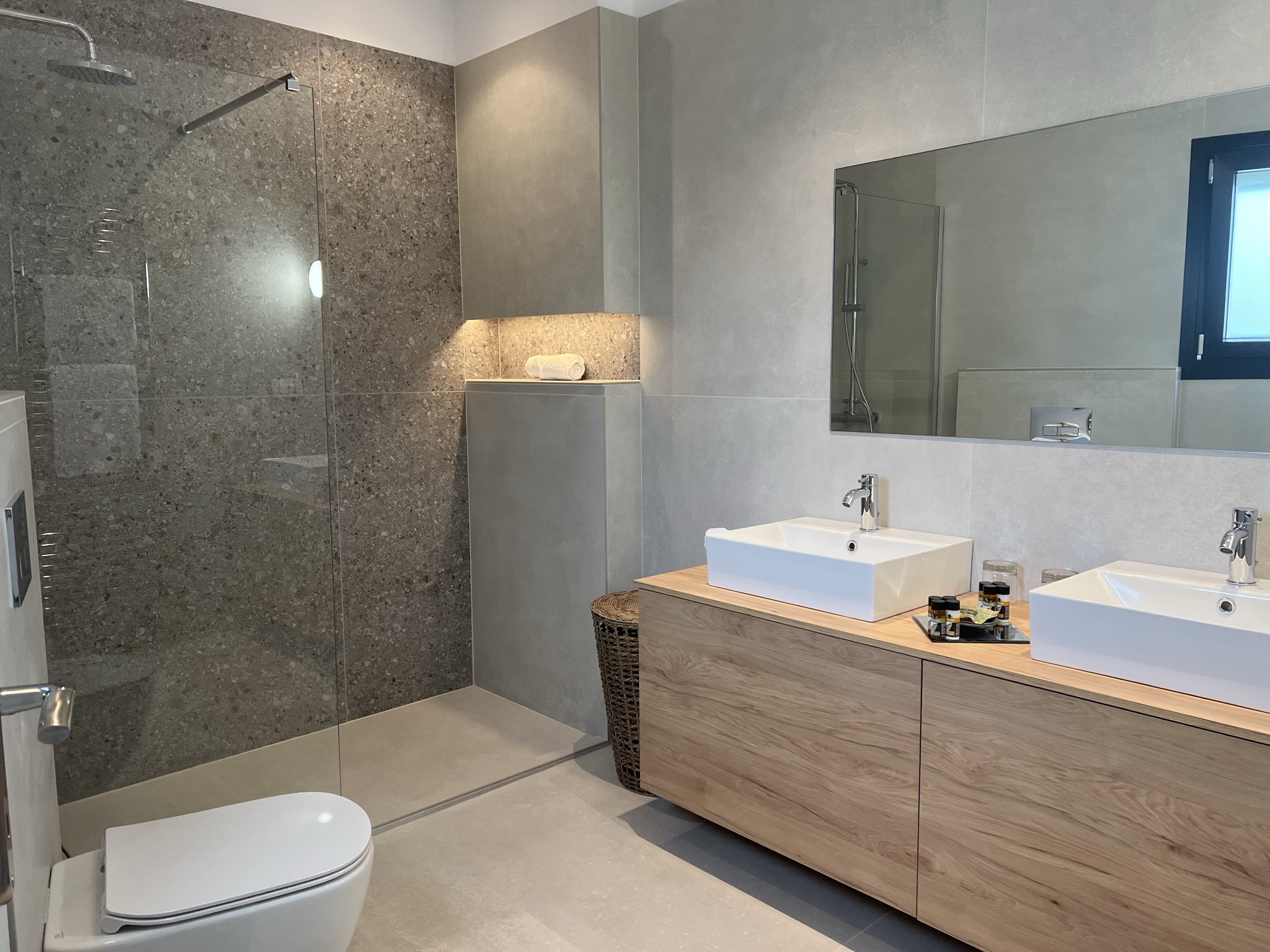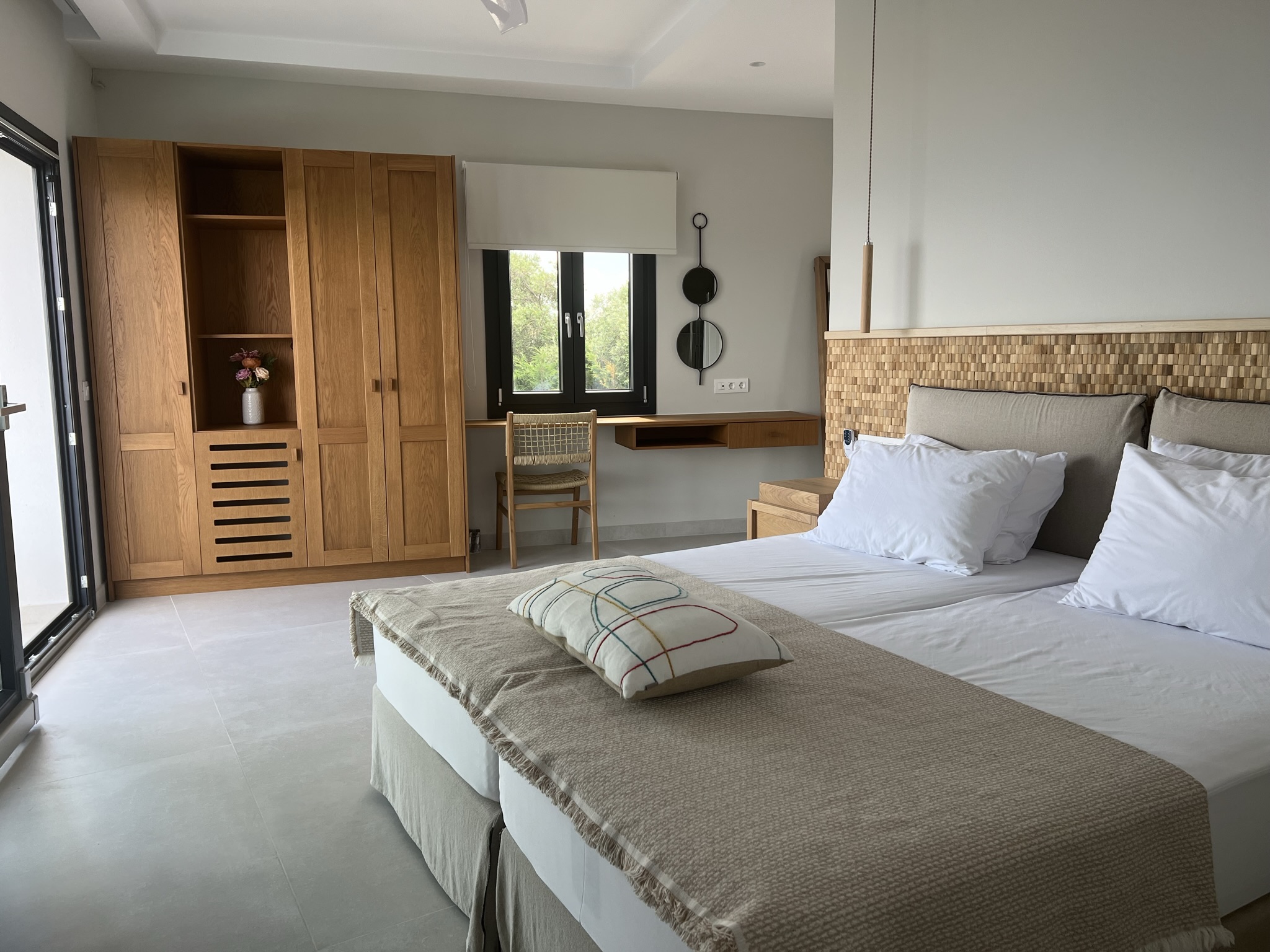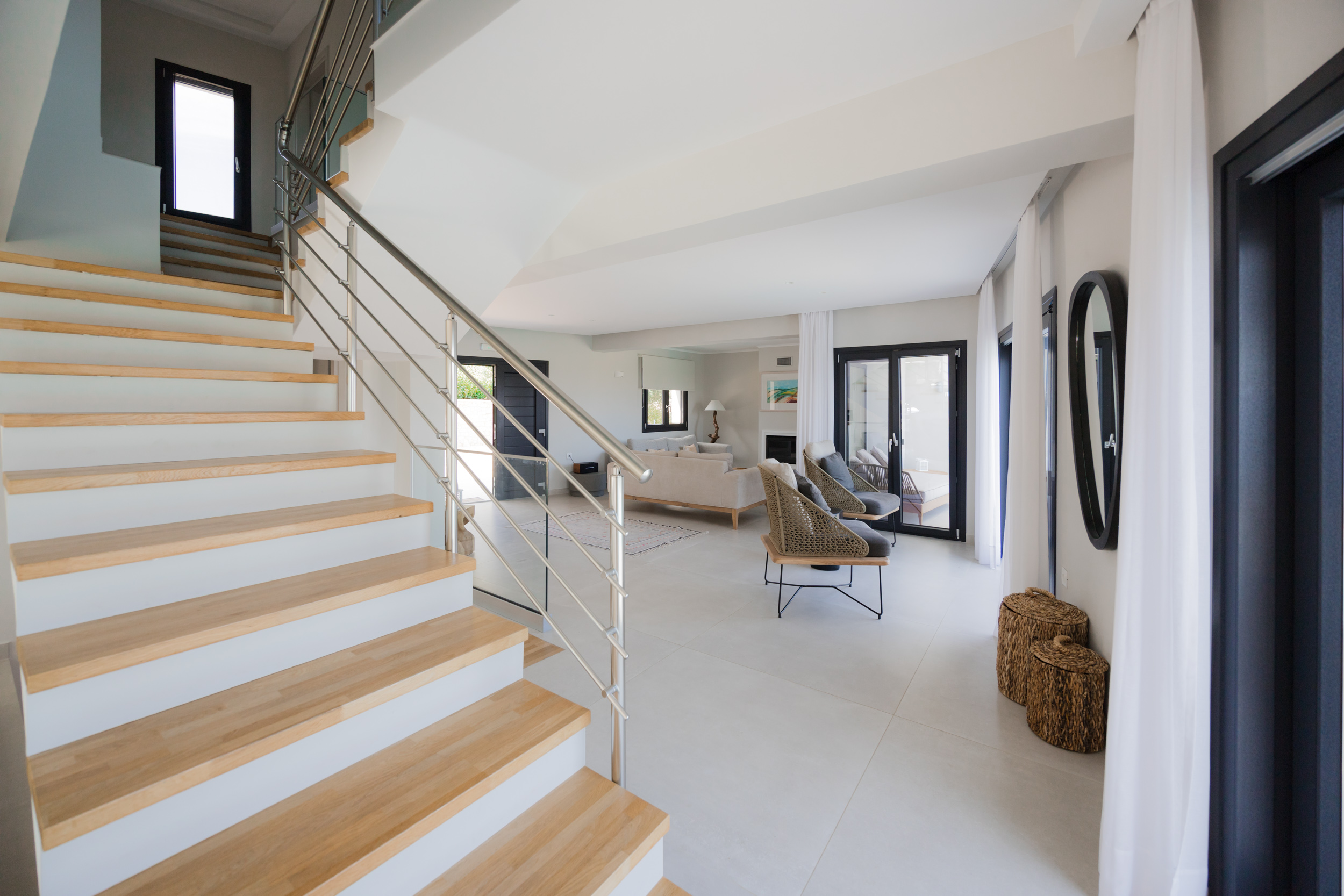 A beautifully crafted contemporary staircase leads to the two glamourous bedrooms, each with an en-suite shower room. Each room has a private balcony overlooking the pool, and one of the rooms has a second balcony to the rear of the villa.