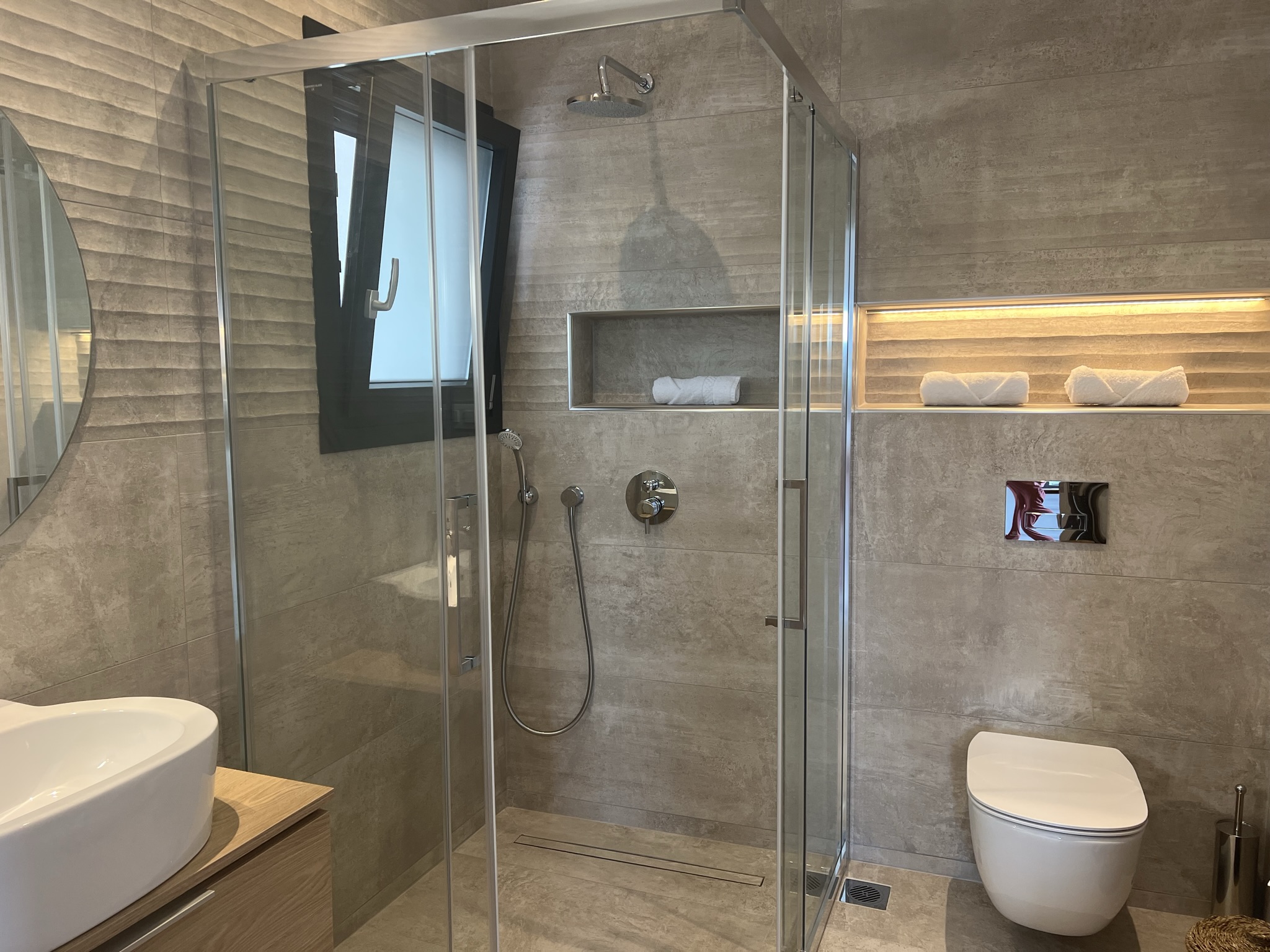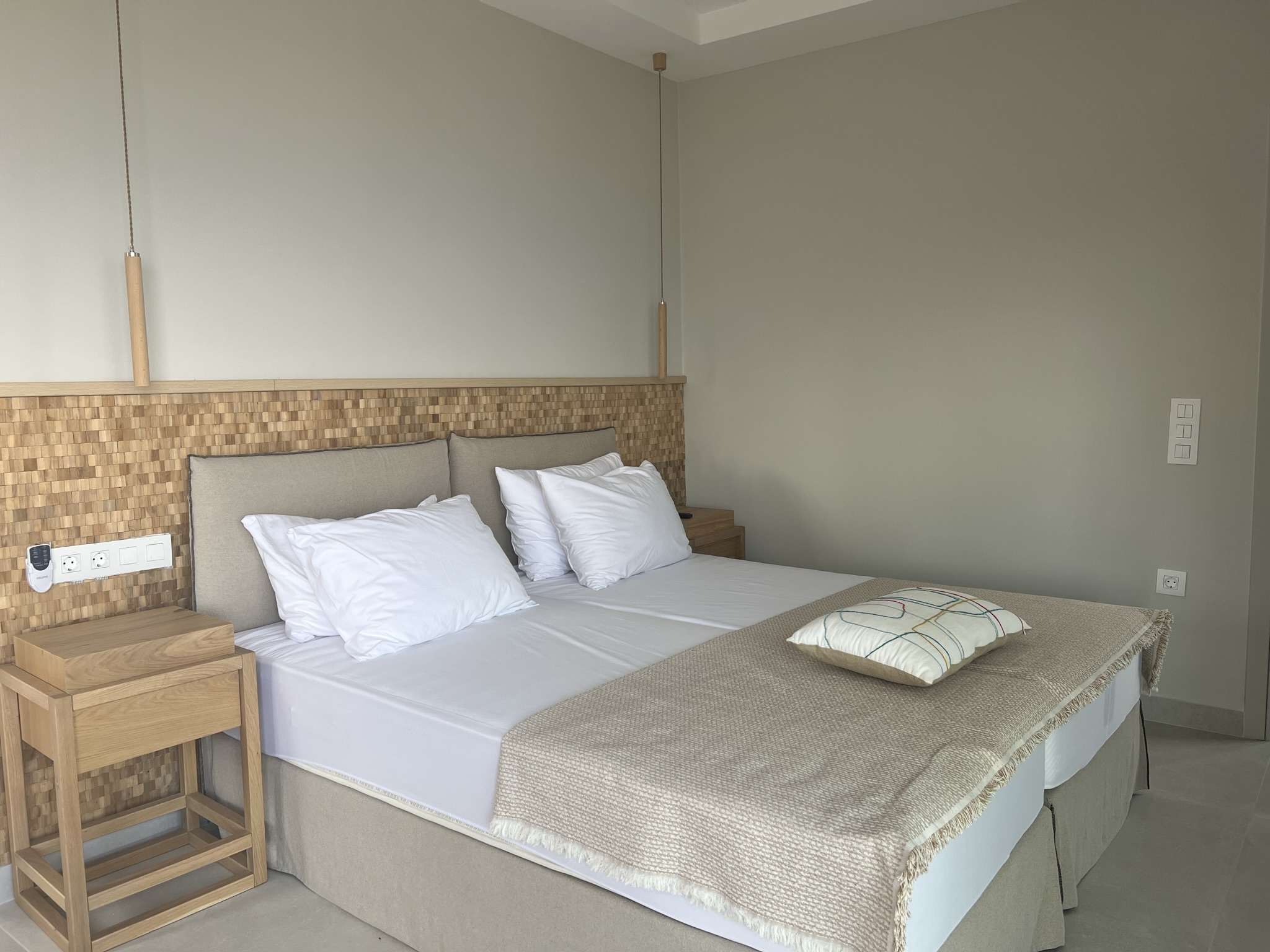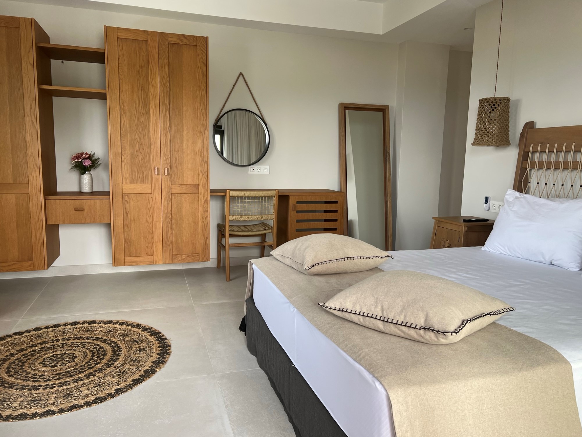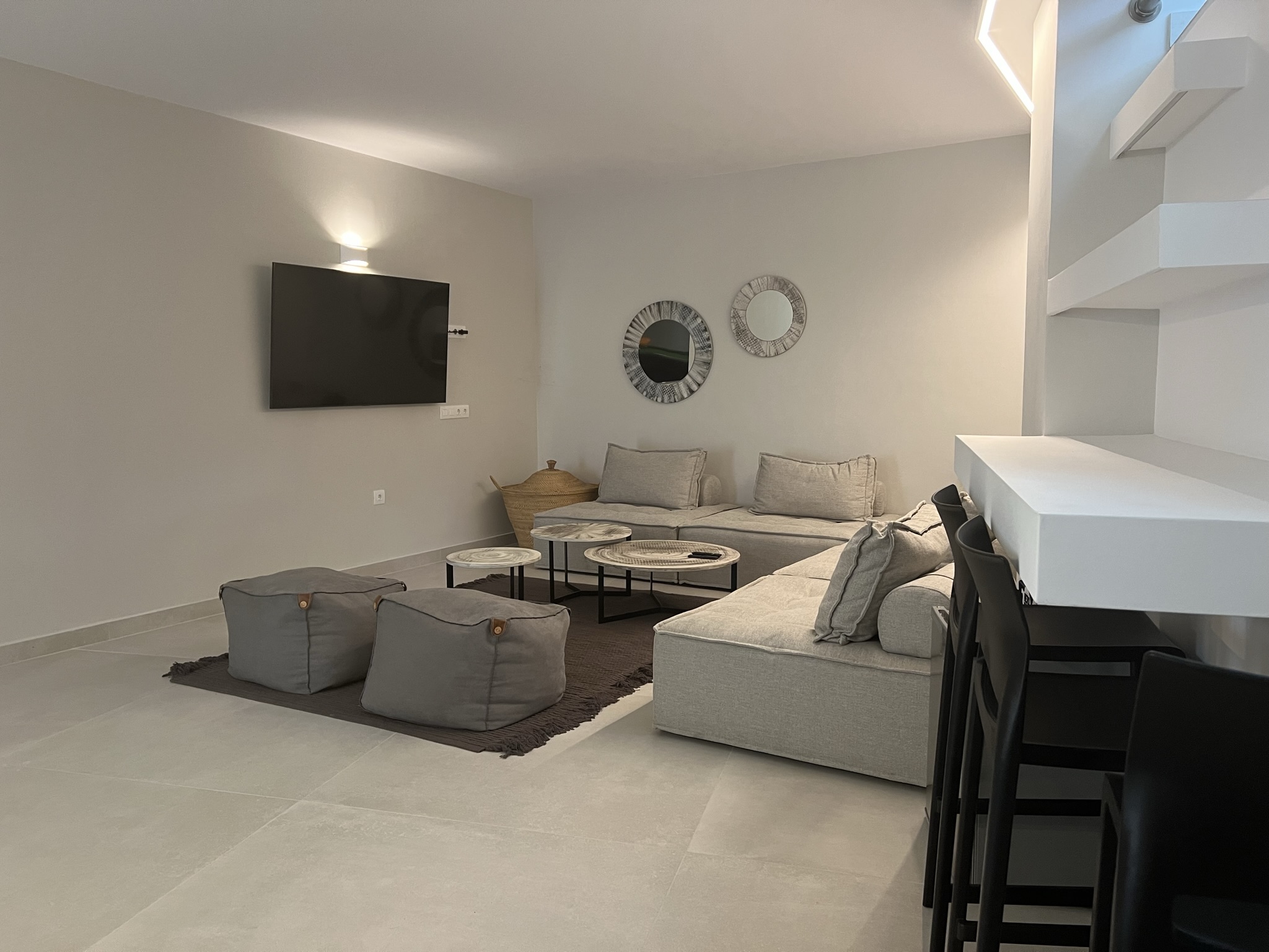 A beautifully crafted contemporary staircase leads to the two glamourous bedrooms, each with an en-suite shower room. Each room has a private balcony overlooking the pool, and one of the rooms has a second balcony to the rear of the villa.