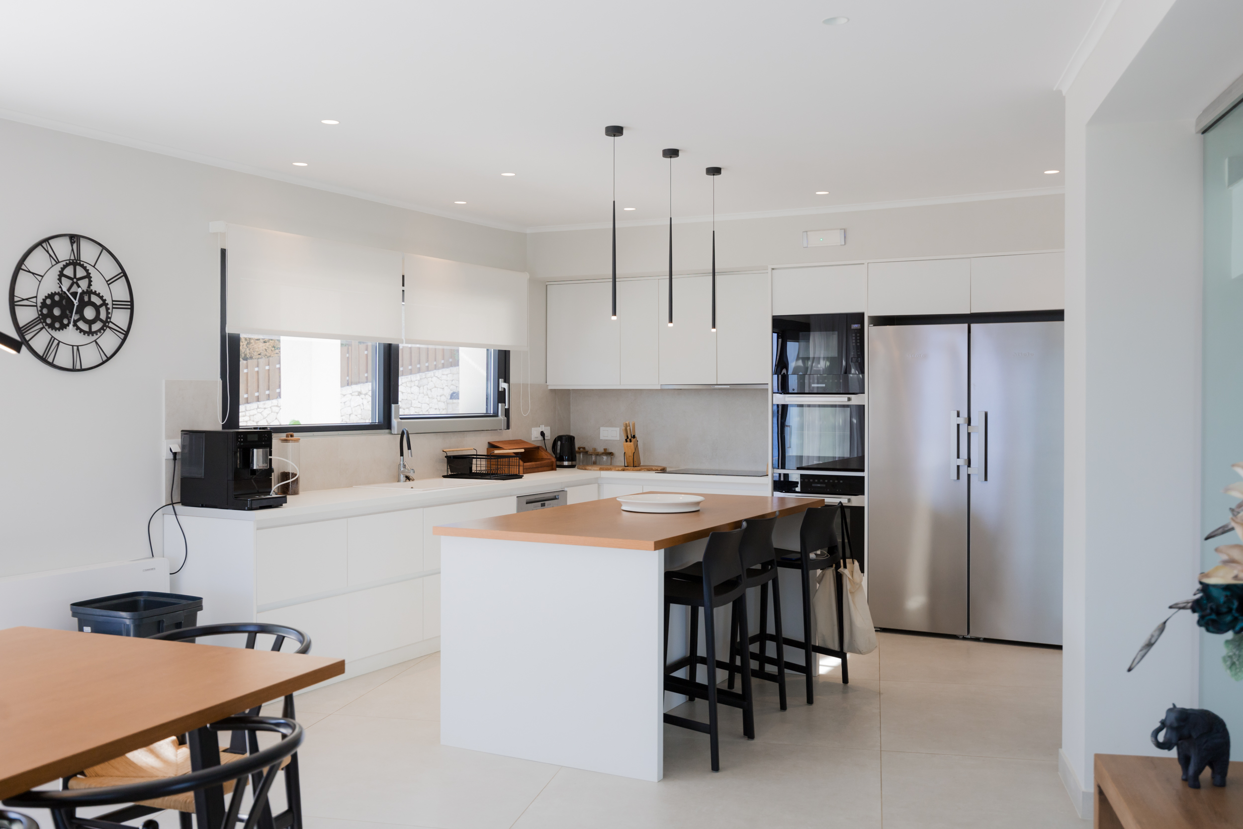 Entry is at the rear of the villa on the middle level, into a spacious hallway from which the gorgeous view is immediately visible. This main level has a comfortable sitting area to one side, a large dining room to the other and a sleek modern kitchen to the side. All the rooms have views through the enormous windows leading out to the pool and terrace.