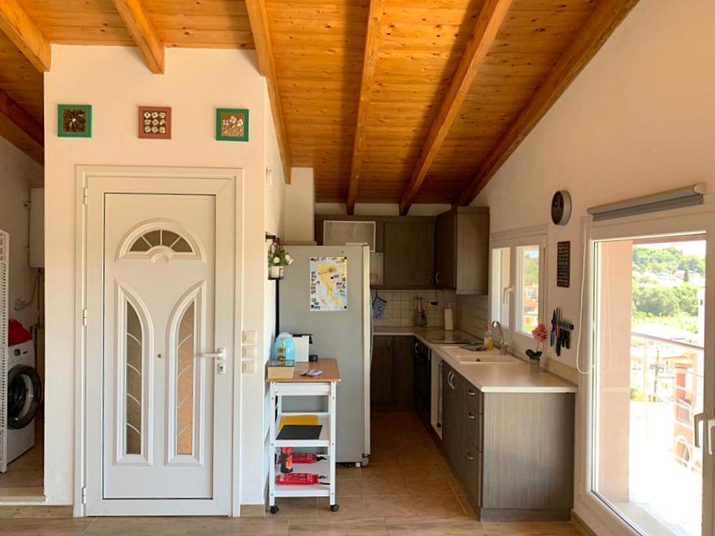 Stairs lead up to the front door which leads straight into an open plan dining/sitting room with the modern kitchen to one side. Immediately upon entering you are drawn to the view straight ahead, with wall to ceiling sliding doors letting in ample light and giving an indoor/outdoor feeling. The property looks towards Corfu Town and the Old Fortress to one side and Kanoni, Pontikonisi and the runway from the other direction.
