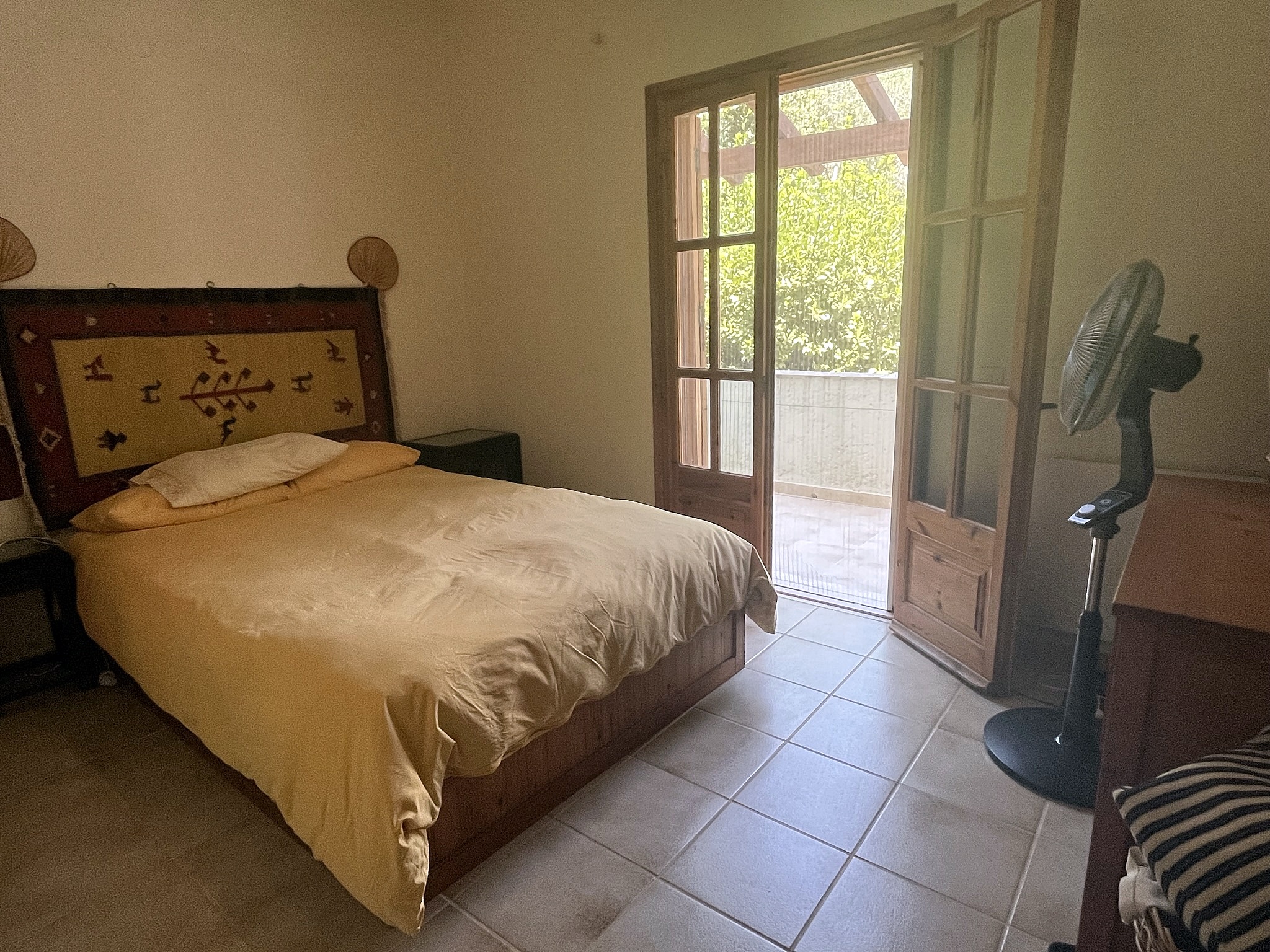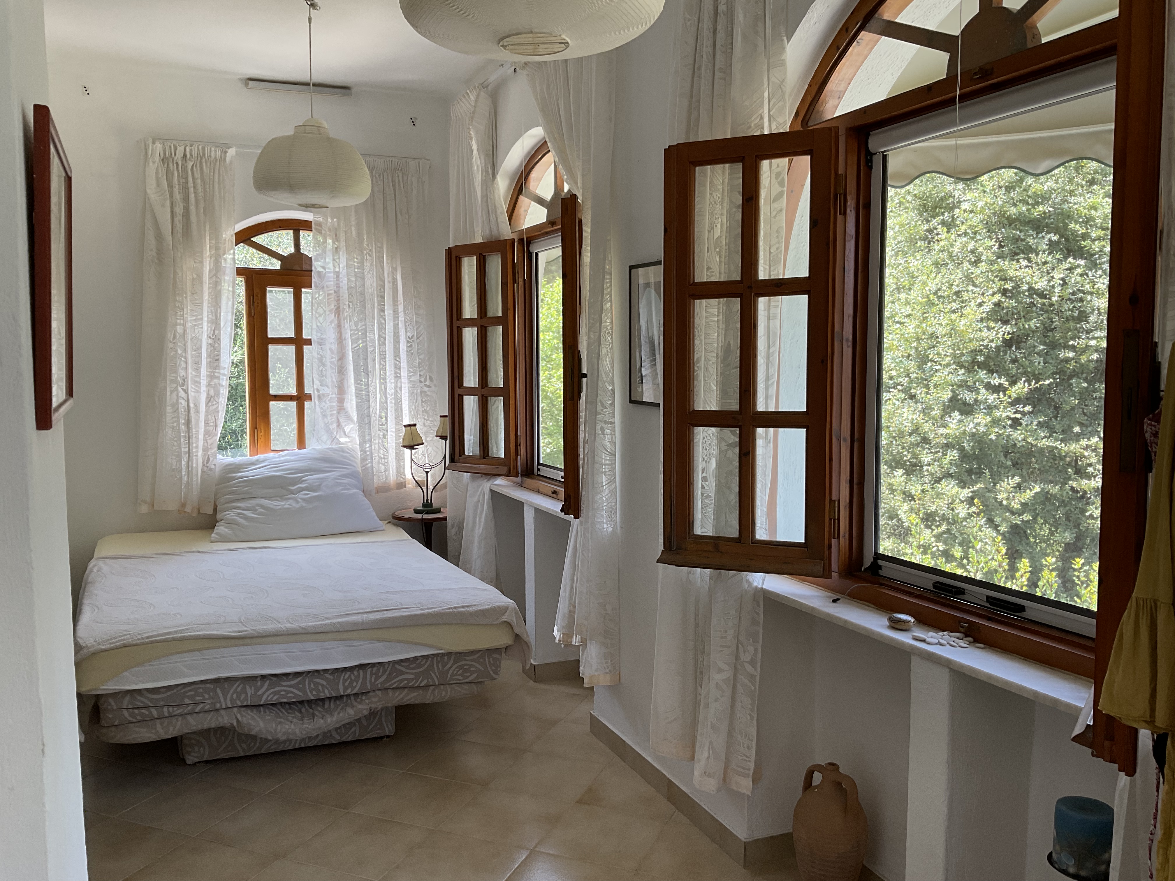 A stone staircase leads from the outside to the first floor, where there is a comfortable apartment with two double bedrooms, a bathroom, and an open living room/kitchen. There are lots of windows on all sides allowing light and fresh air inside, and several balconies with a choice of sun or shade.