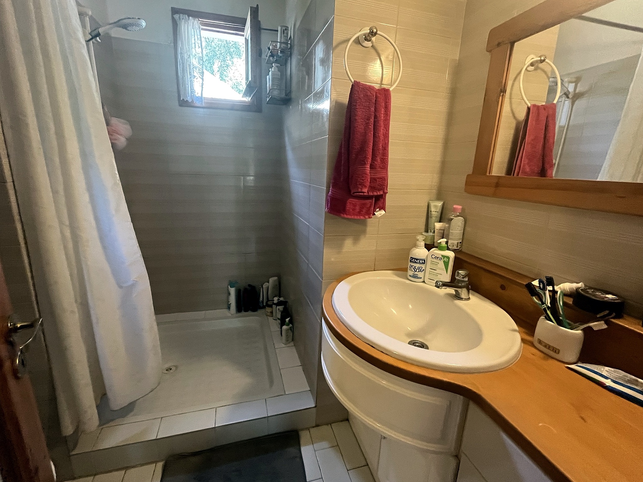 Another stone staircase leads up to the top floors. This is a large one bedroom apartment, with a kitchen/living area and large bathroom on the lower level and a bedroom tucked under the roof at the top. There is a spacious balcony from which to enjoy the sea view, and another terrace overlooking the swimming pool and garden at the back.