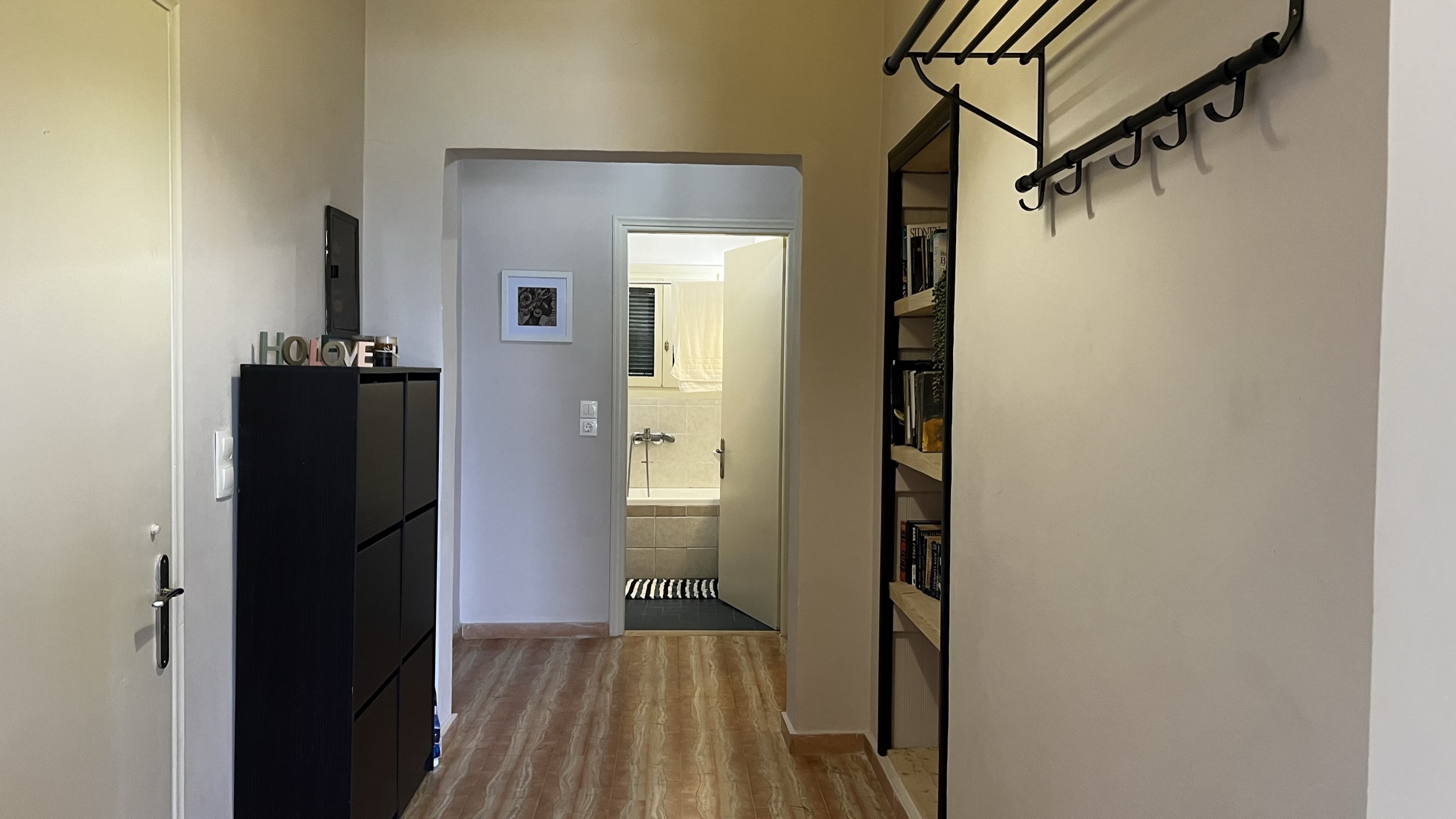 The front door leads to a spacious corridor with plenty of storage space. On the left there is a family bathroom and the two bedrooms, both with sea views.